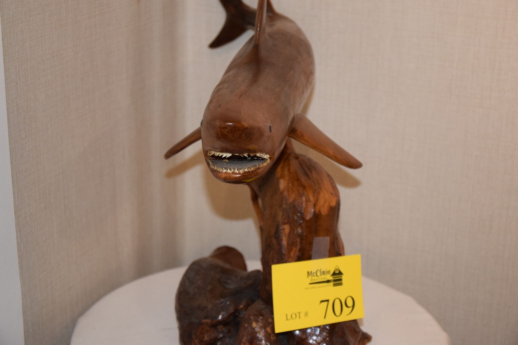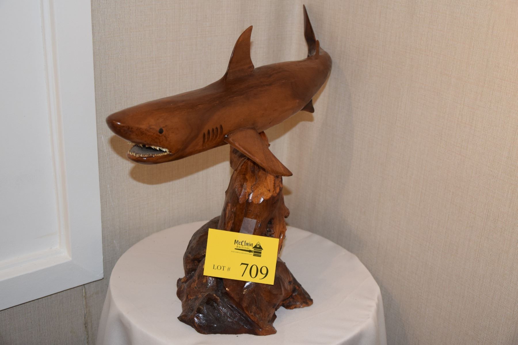 CARVED WOOD SHARK ON WOOD BASE; SIGNED PAUL OF HAWAII (24 1/2" L X 18" H)