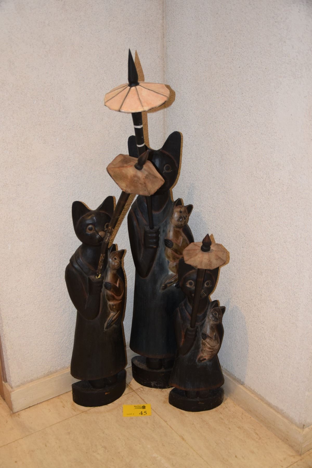 CARVED WOODEN CAT STATUARY (3 PCS) (29" H X 40" H & 50" H)