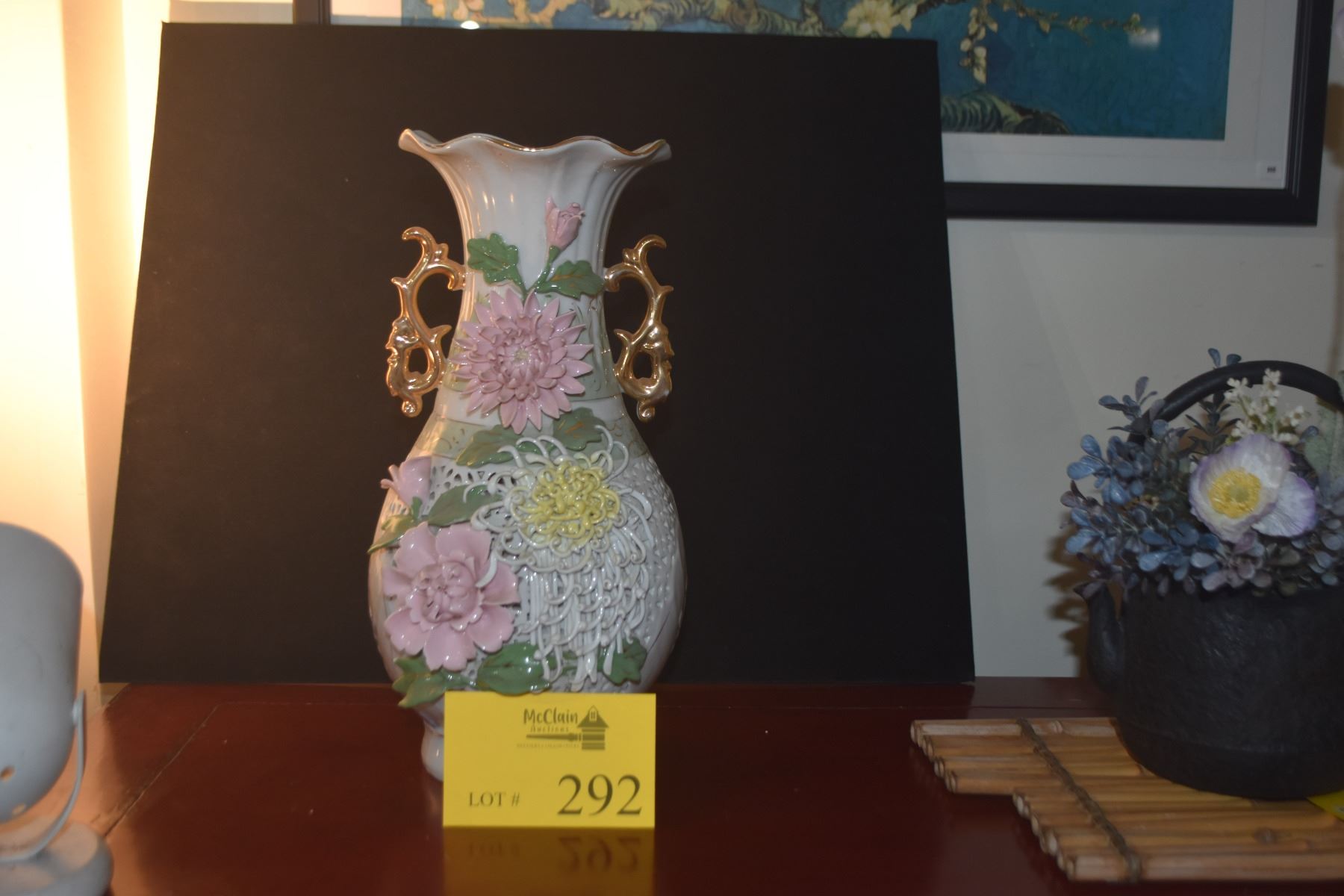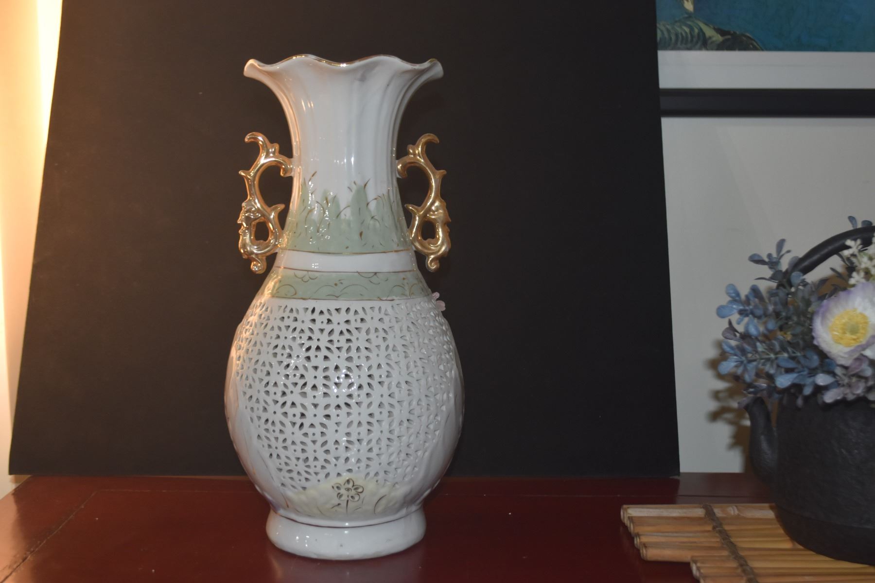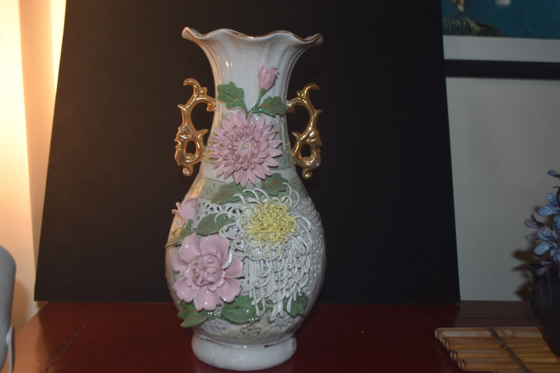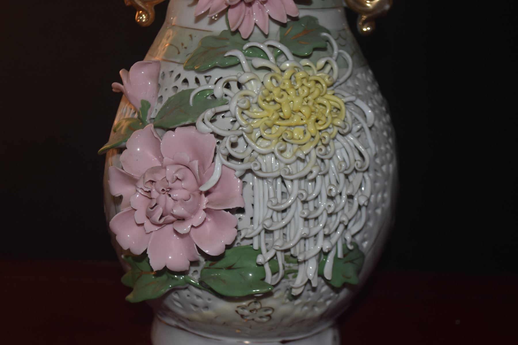 CHINESE 3 DIMENSIONAL PORCELAIN FLORAL & RETICULATED VASE (13 3/4")