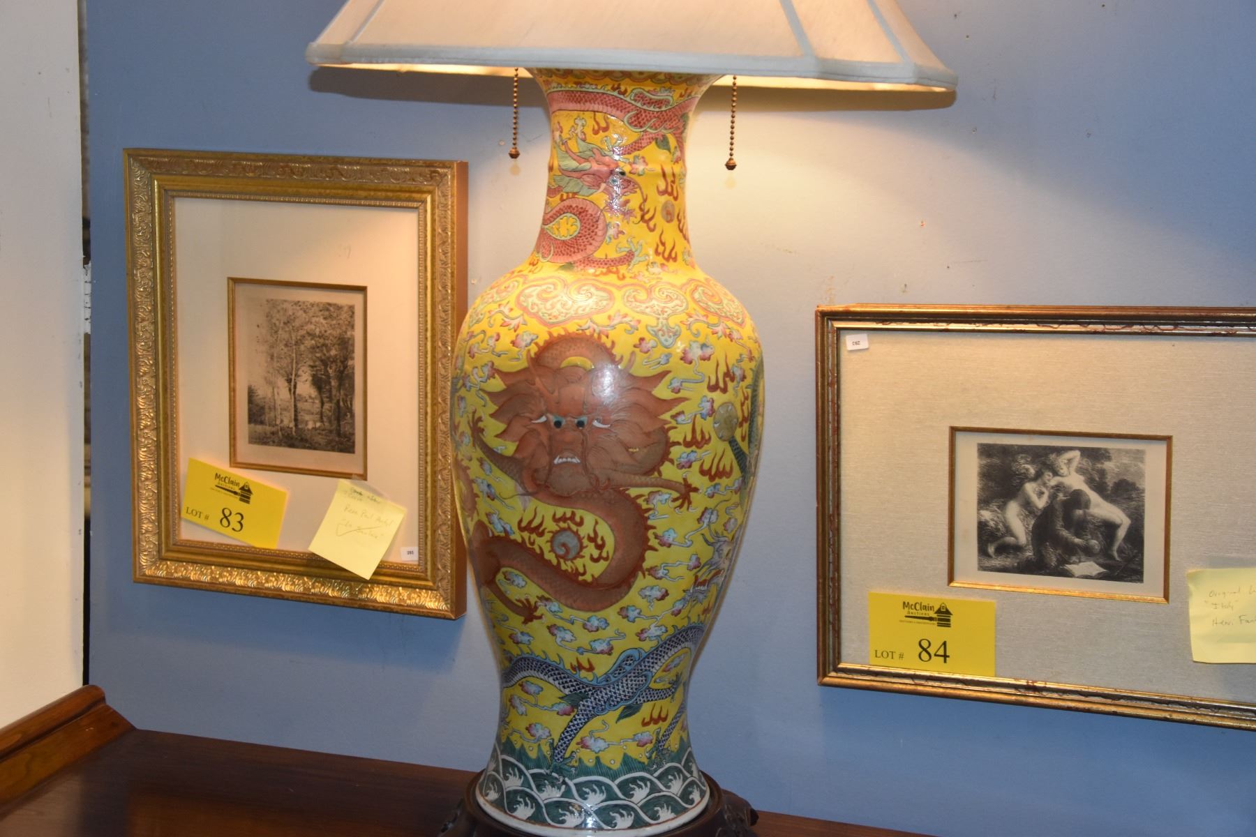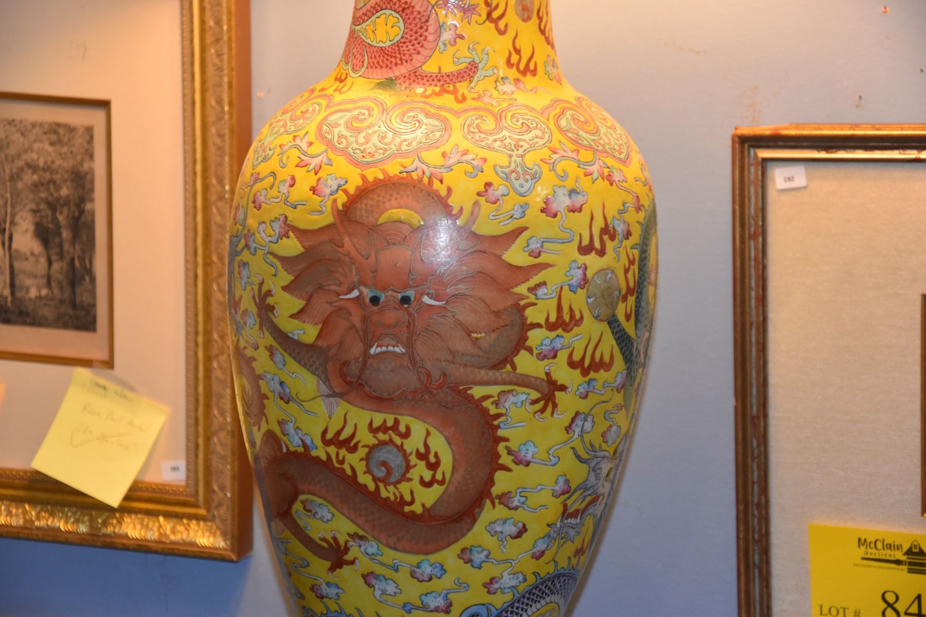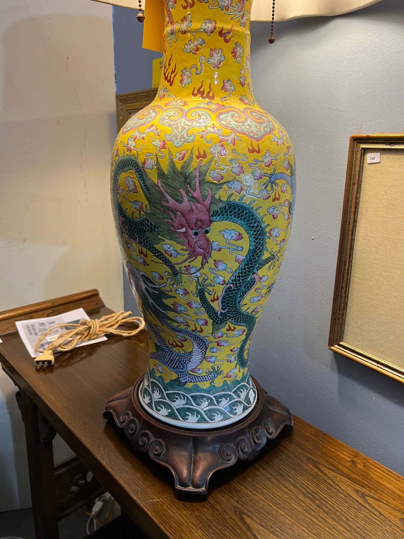 CHINESE ANTIQUE IMPERIAL YELLOW GLAZE, 5 POLYCHROME DRAGONS (5 CLAWS) PORCELAIN LAMP ON WOOD STAND, MARKED KUANG-HSU & PERIOD (AS FOUND) (23 1/4" VASE/27" TOTAL)