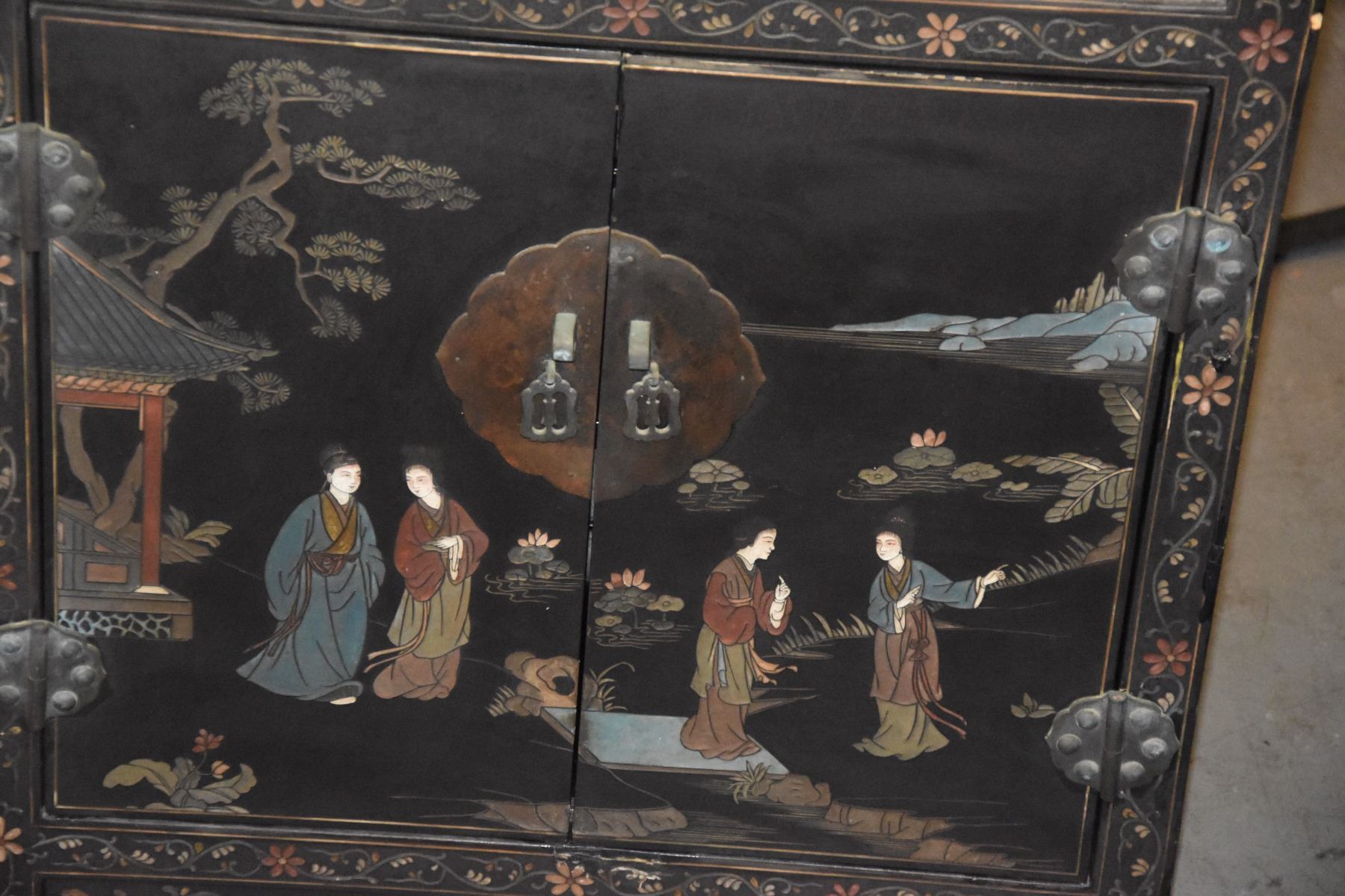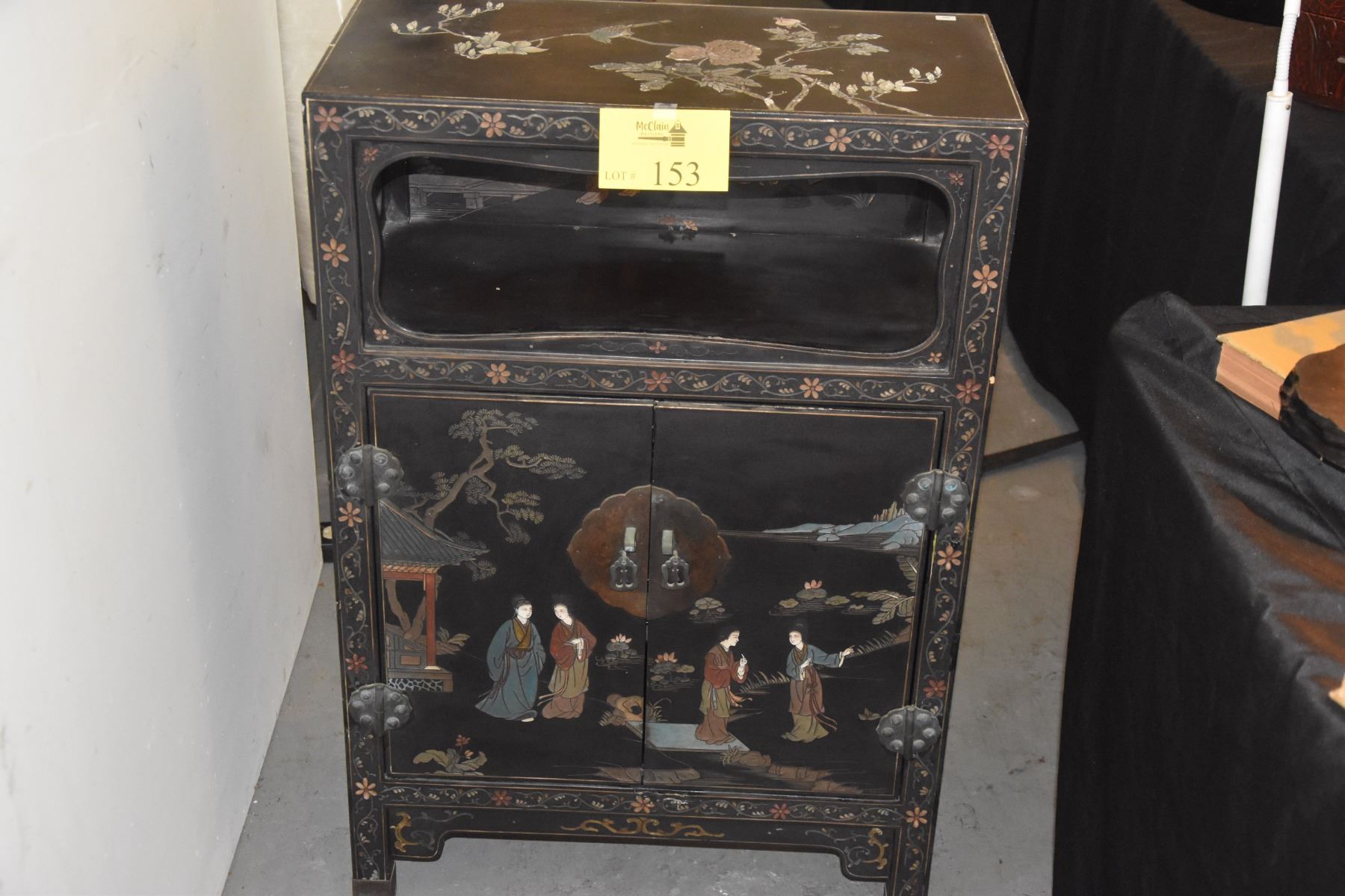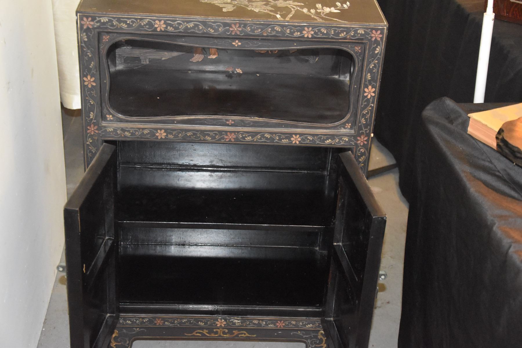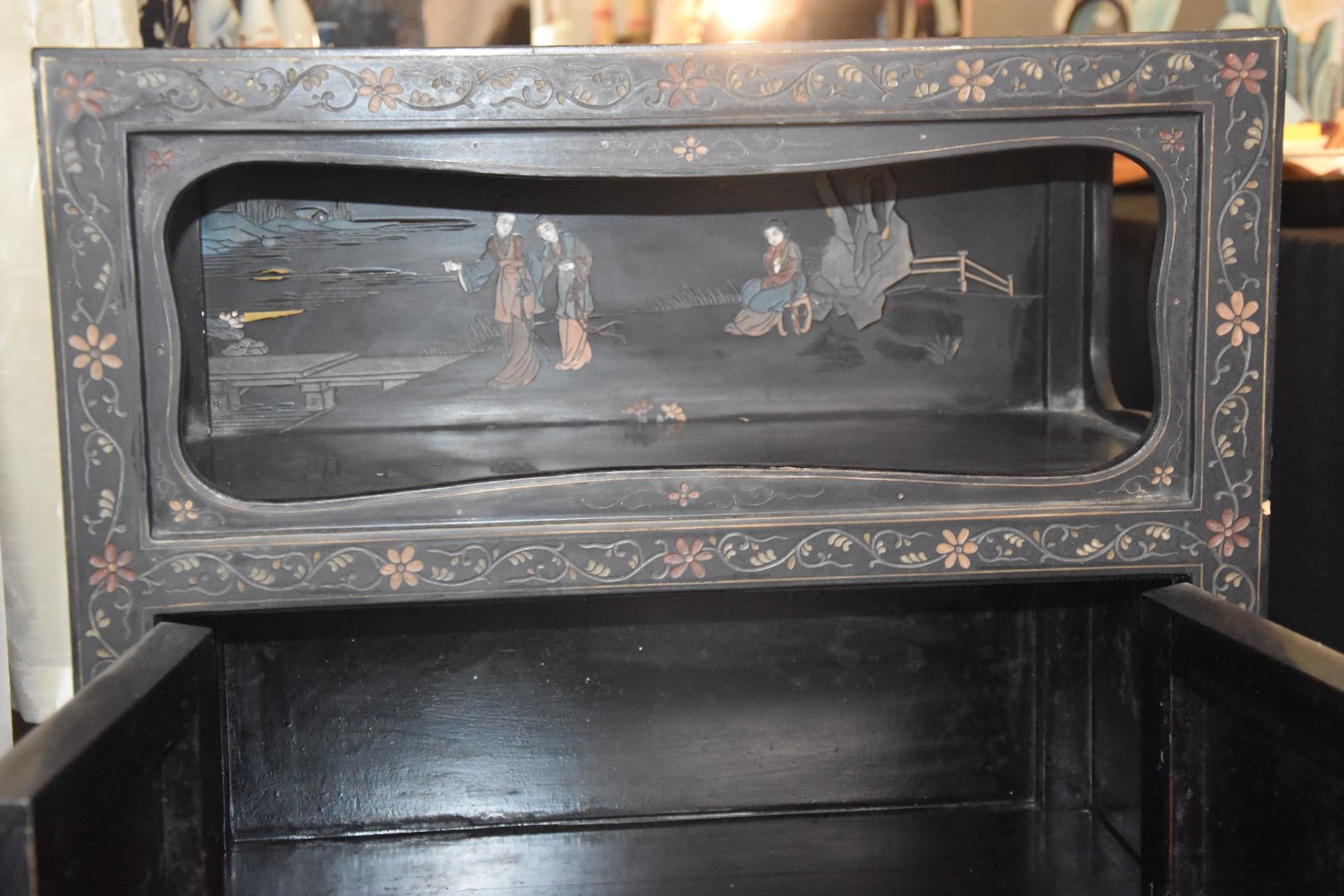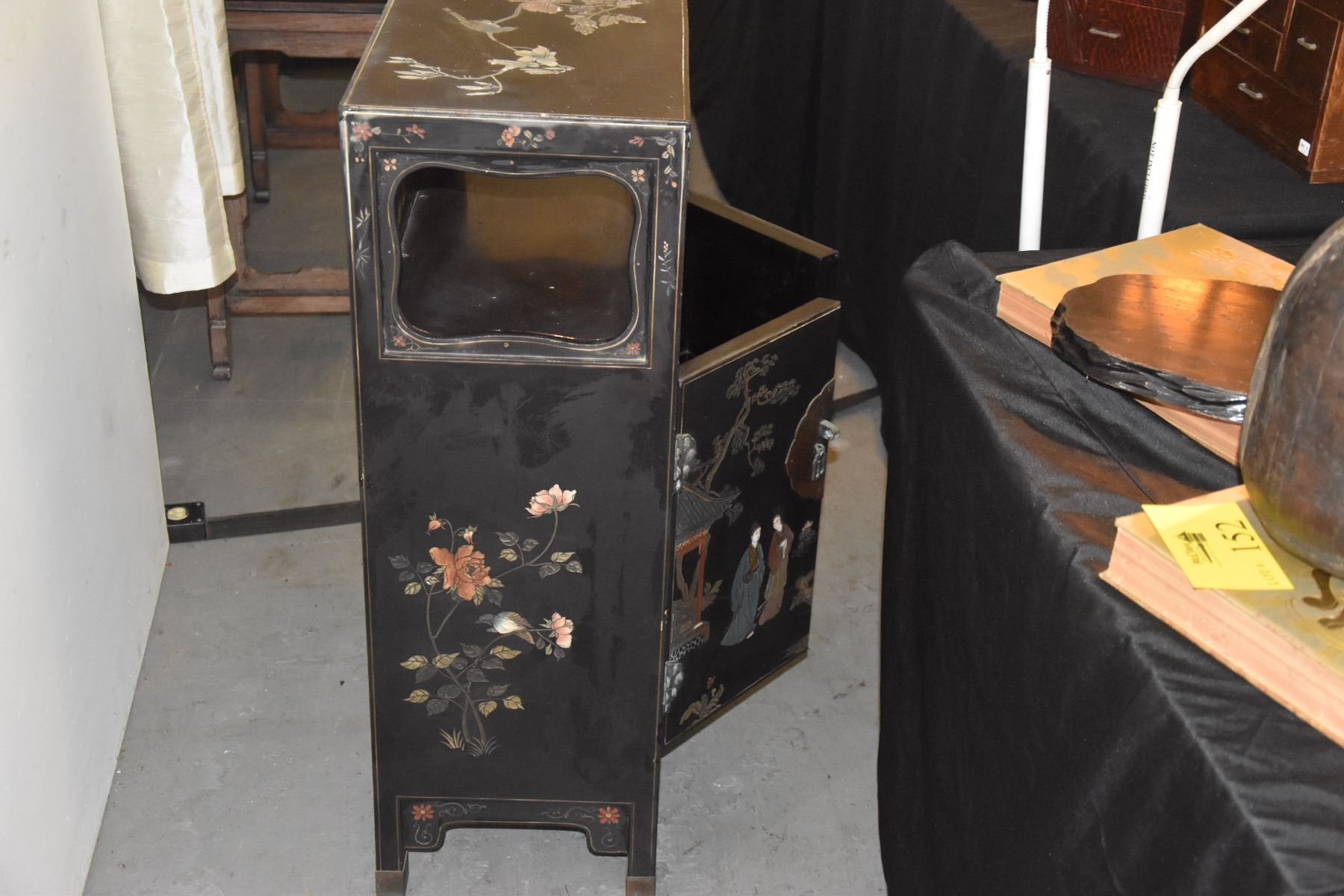 CHINESE BLACK LACQUER CABINET W/HAND PAINTED MOTIFS (24" X 12" X 36 1/2")