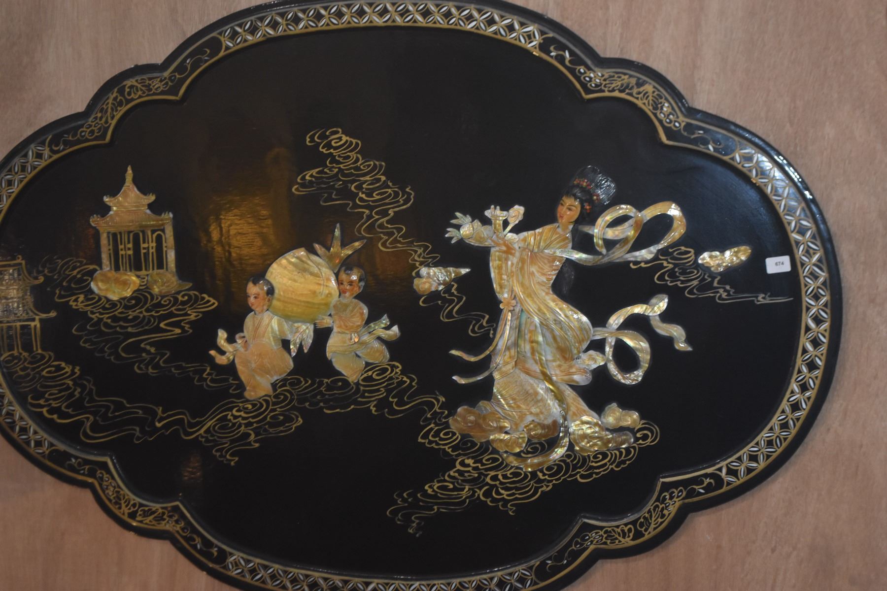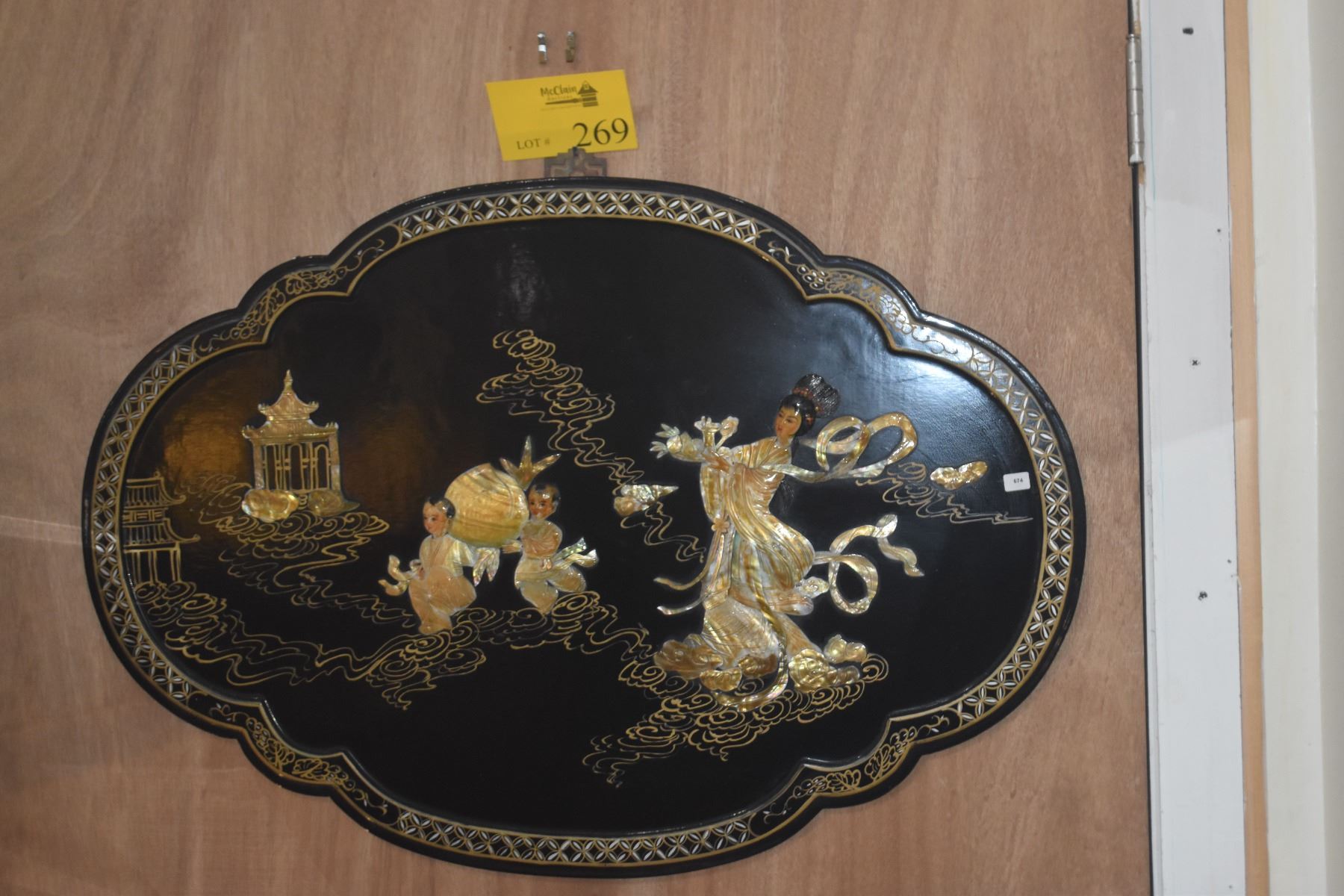 CHINESE BLACK LACQUER WALL PLAQUE W/MOTHER OF PEARL