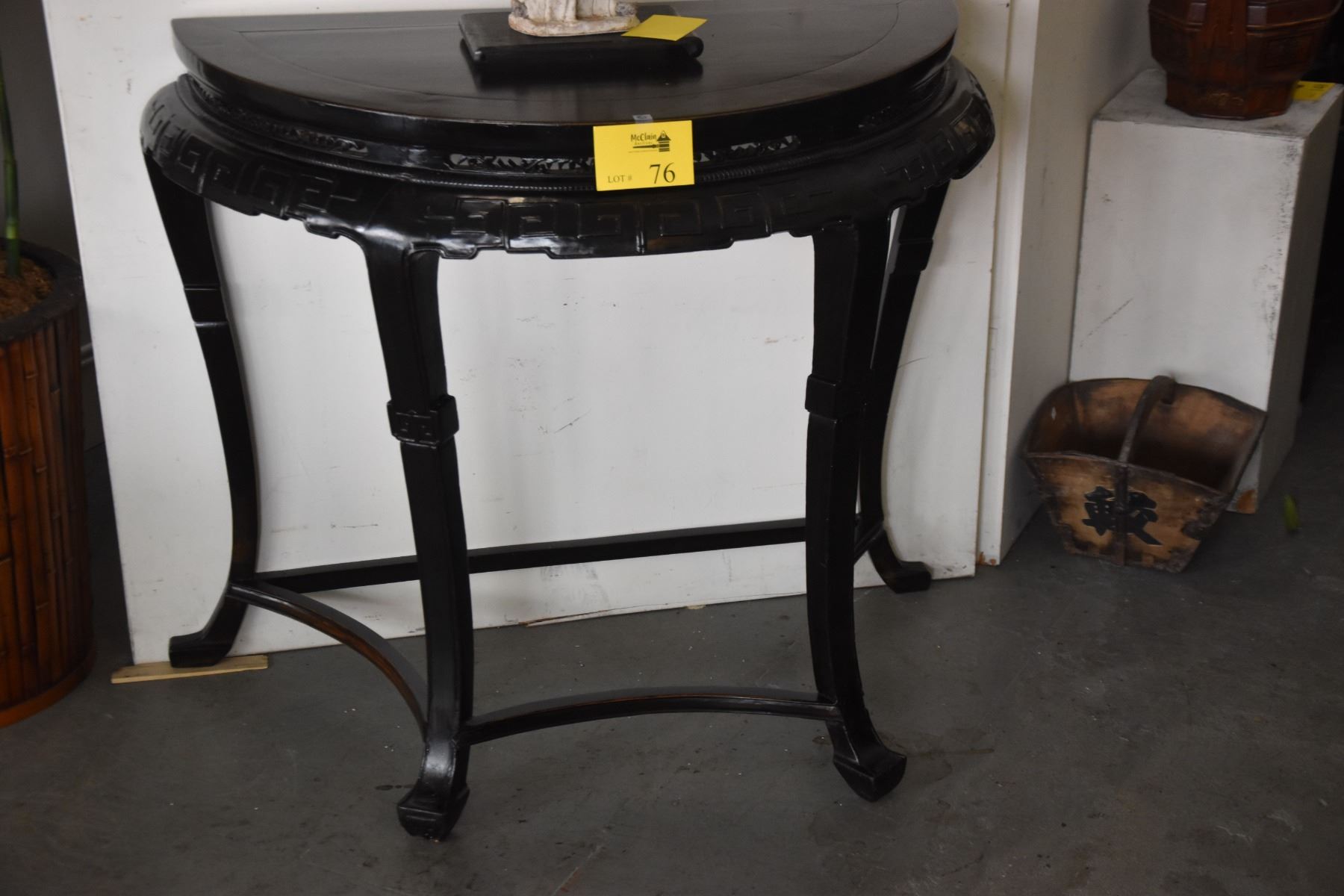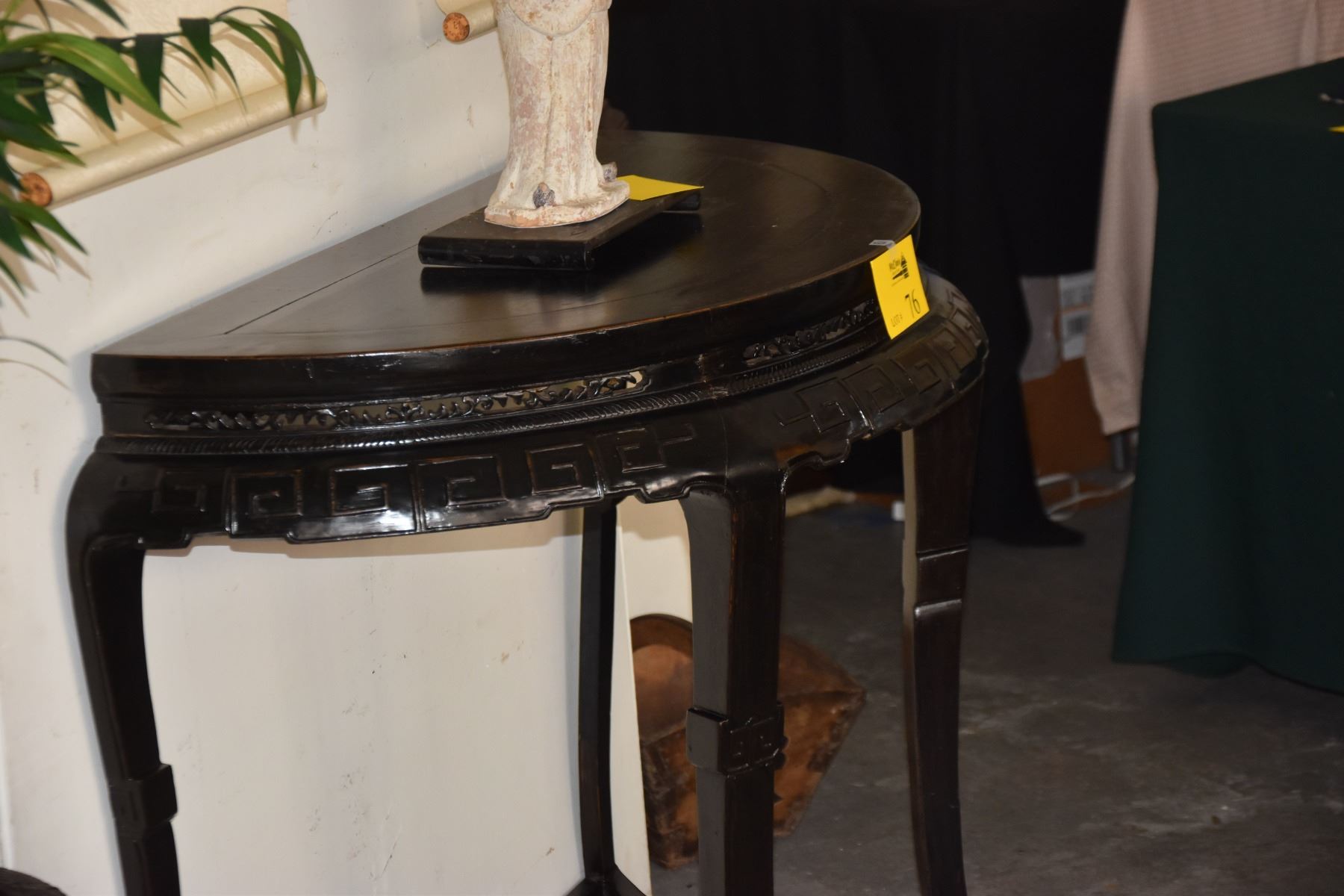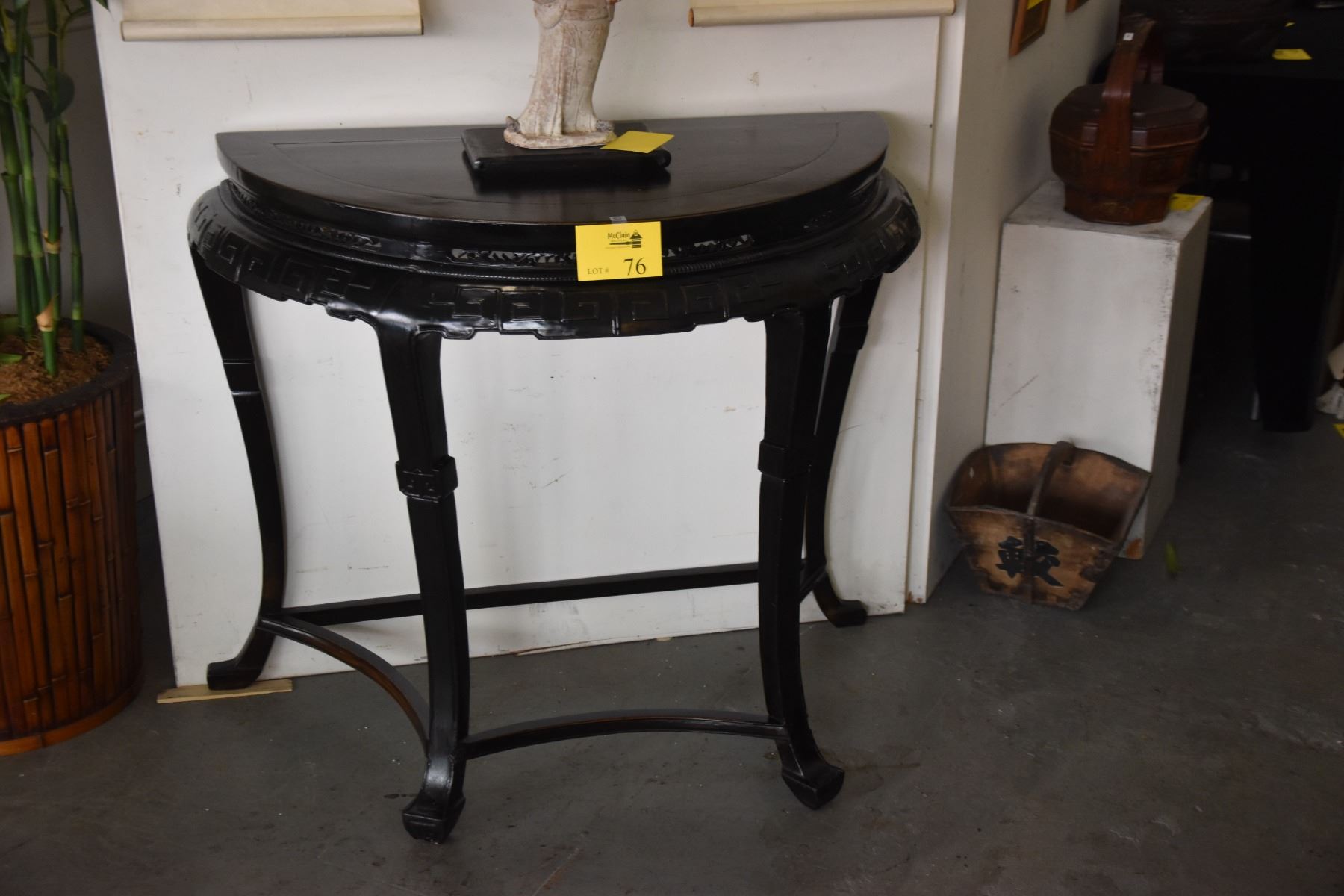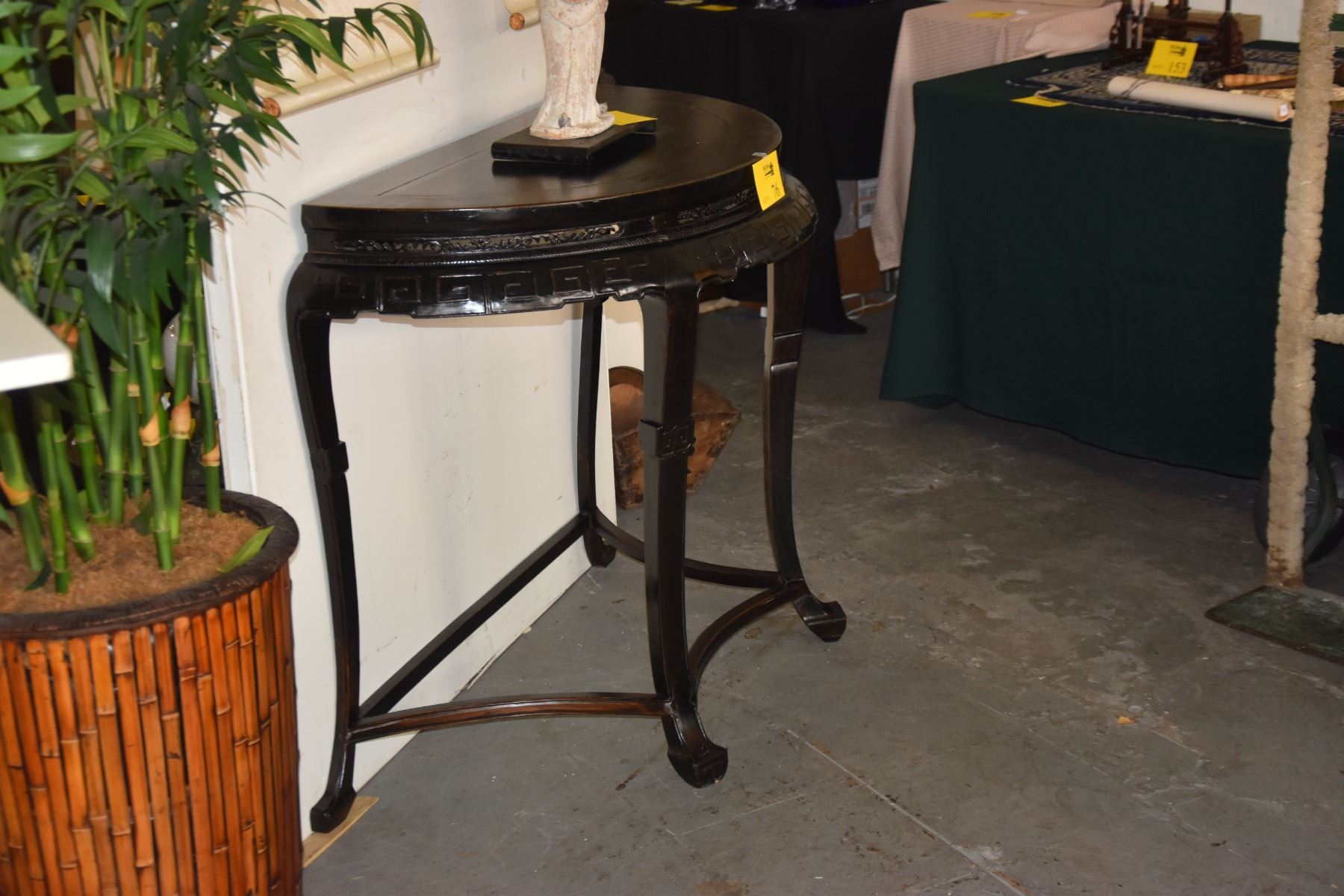 CHINESE BLACK LACQUERED DEMI-LUNE WOOD TABLE (31" X 20" X 35 1/2")