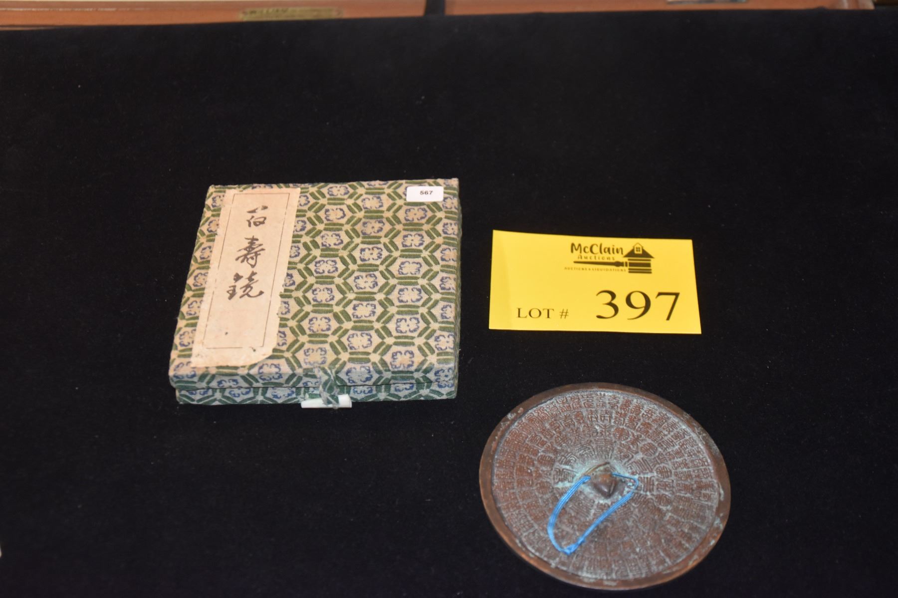 CHINESE BRONZE MIRROR W/100 LONG LIFE CHARACTERS W/BOX (4 3/8")