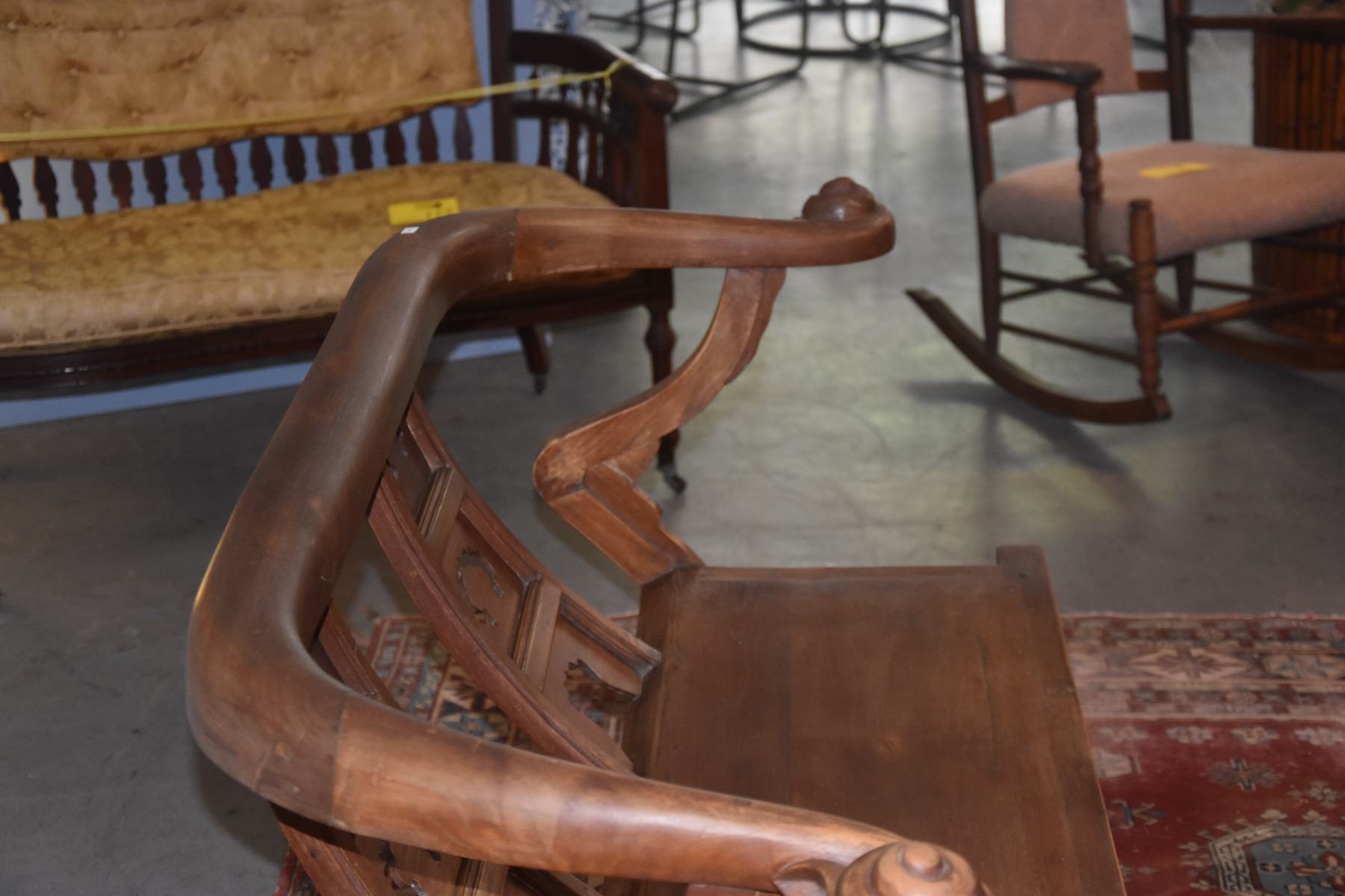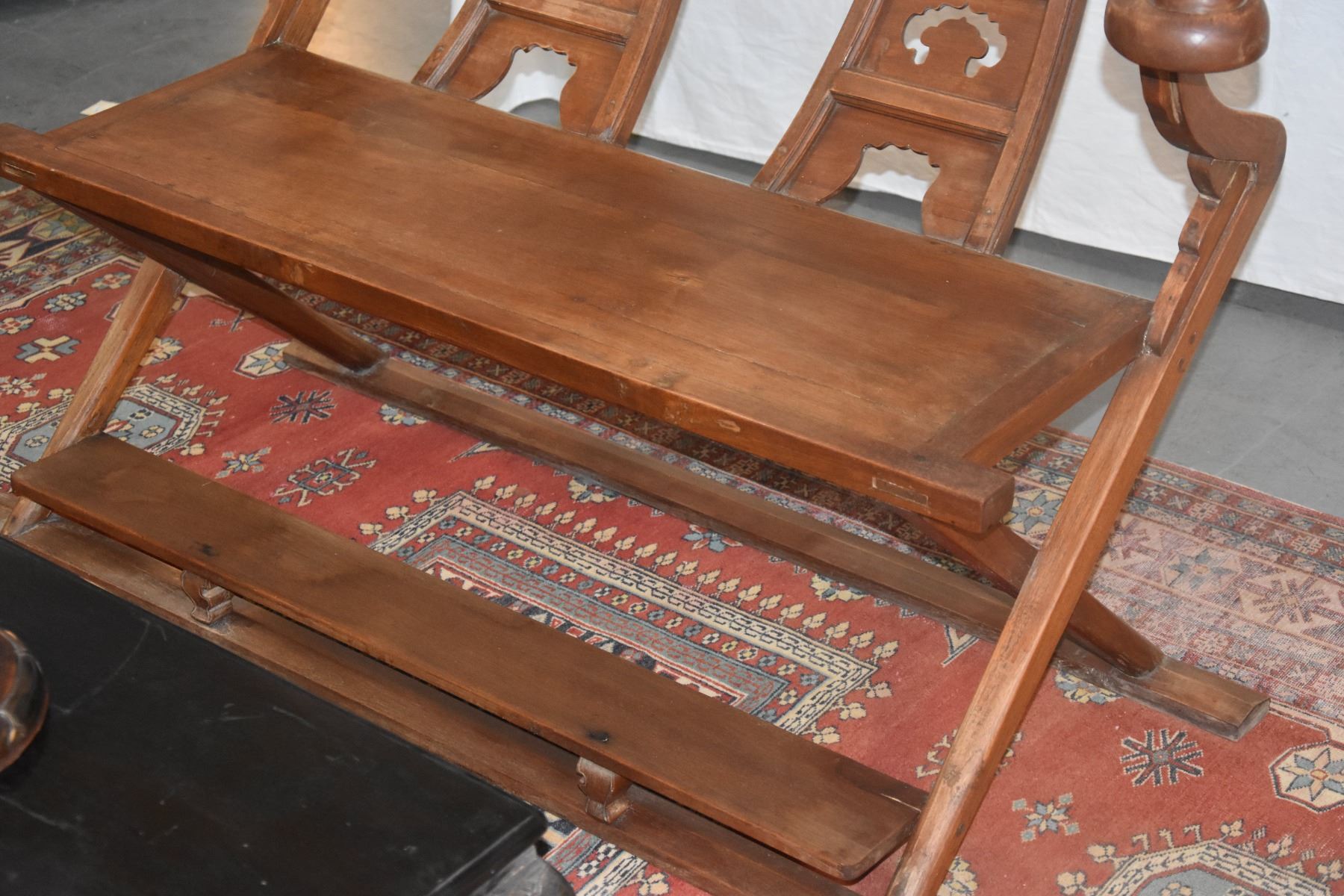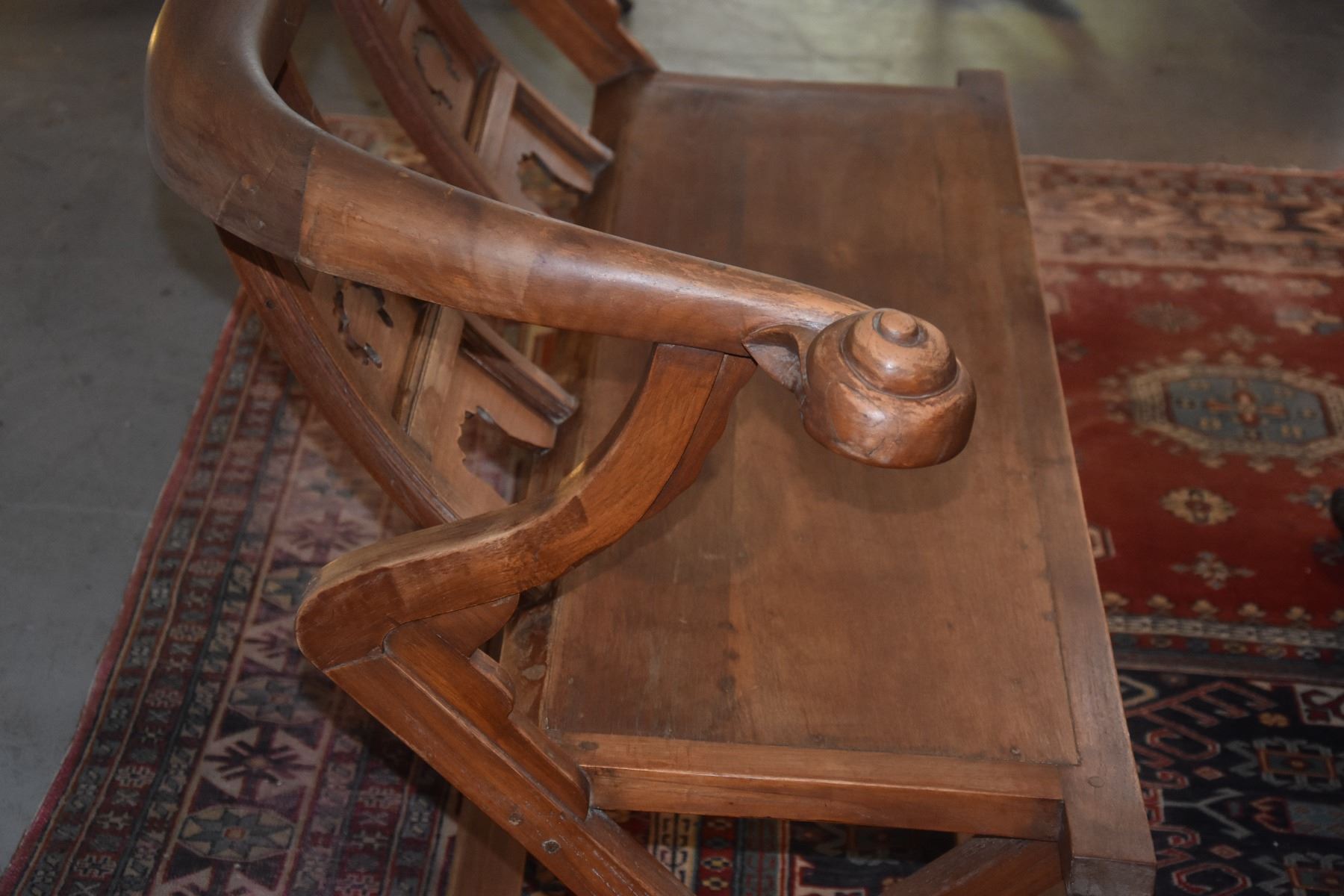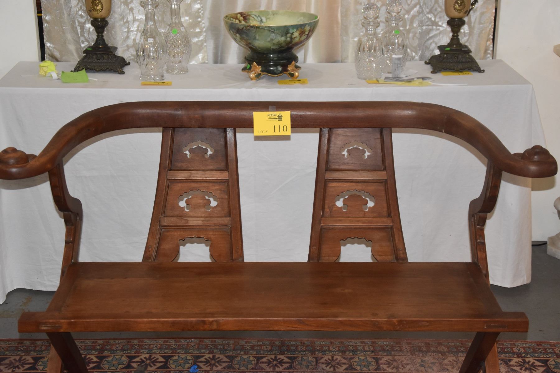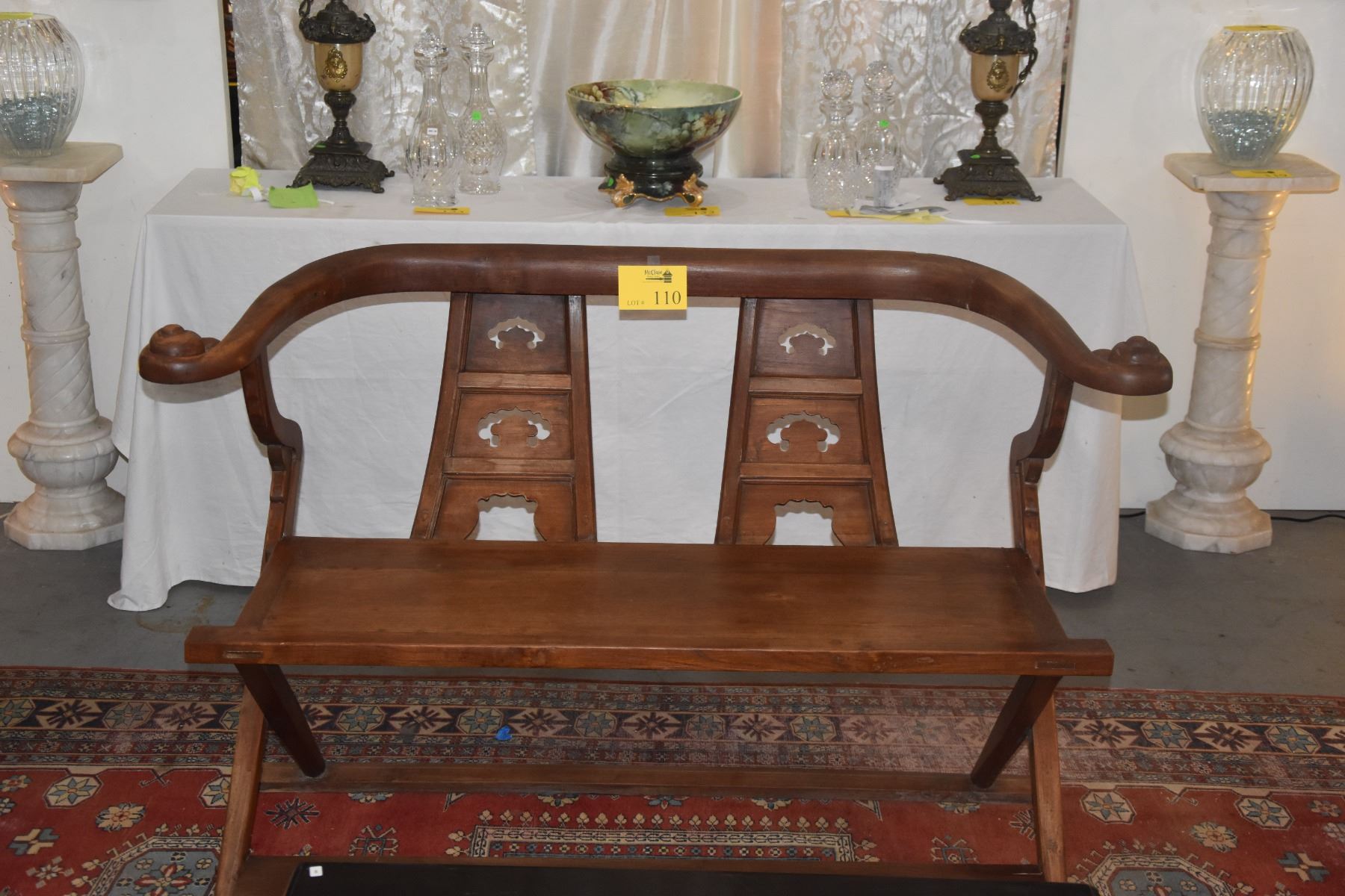 CHINESE CARVED WOOD BENCH, HORSE SHOE STYLE (54 1/2" X 34")