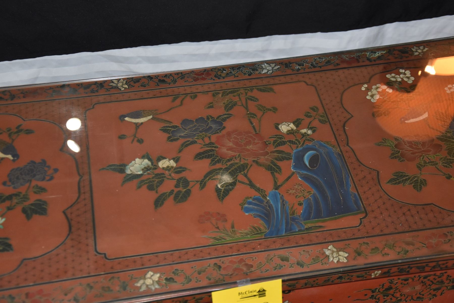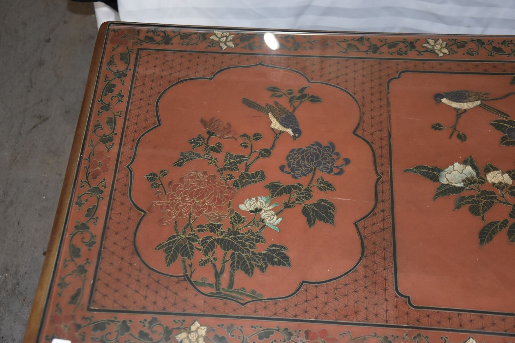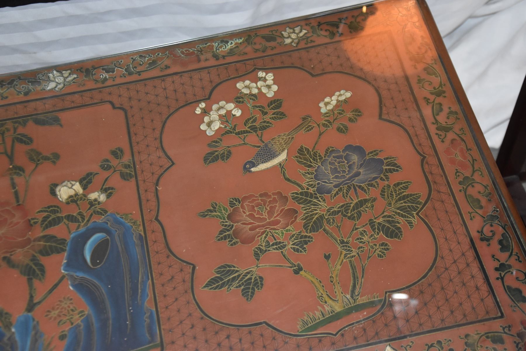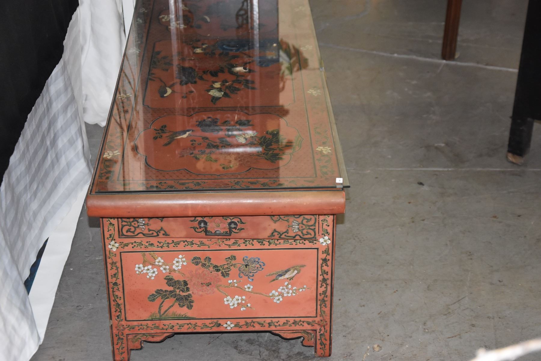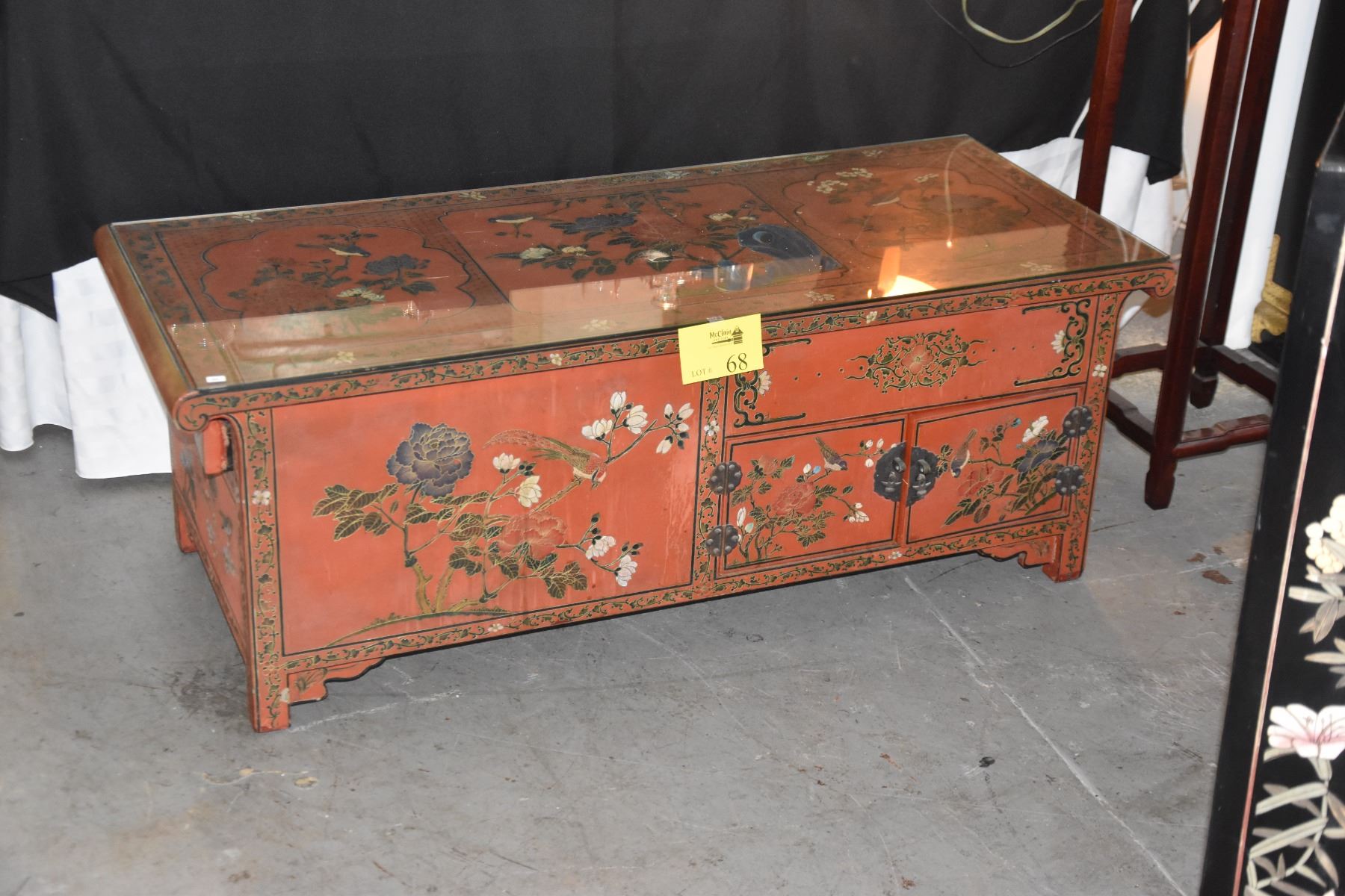 CHINESE COROMANDEL LOW STORAGE CABINET, DOORS ON BOTH SIDES W/GLASS TOP (18" X 48" X 20")