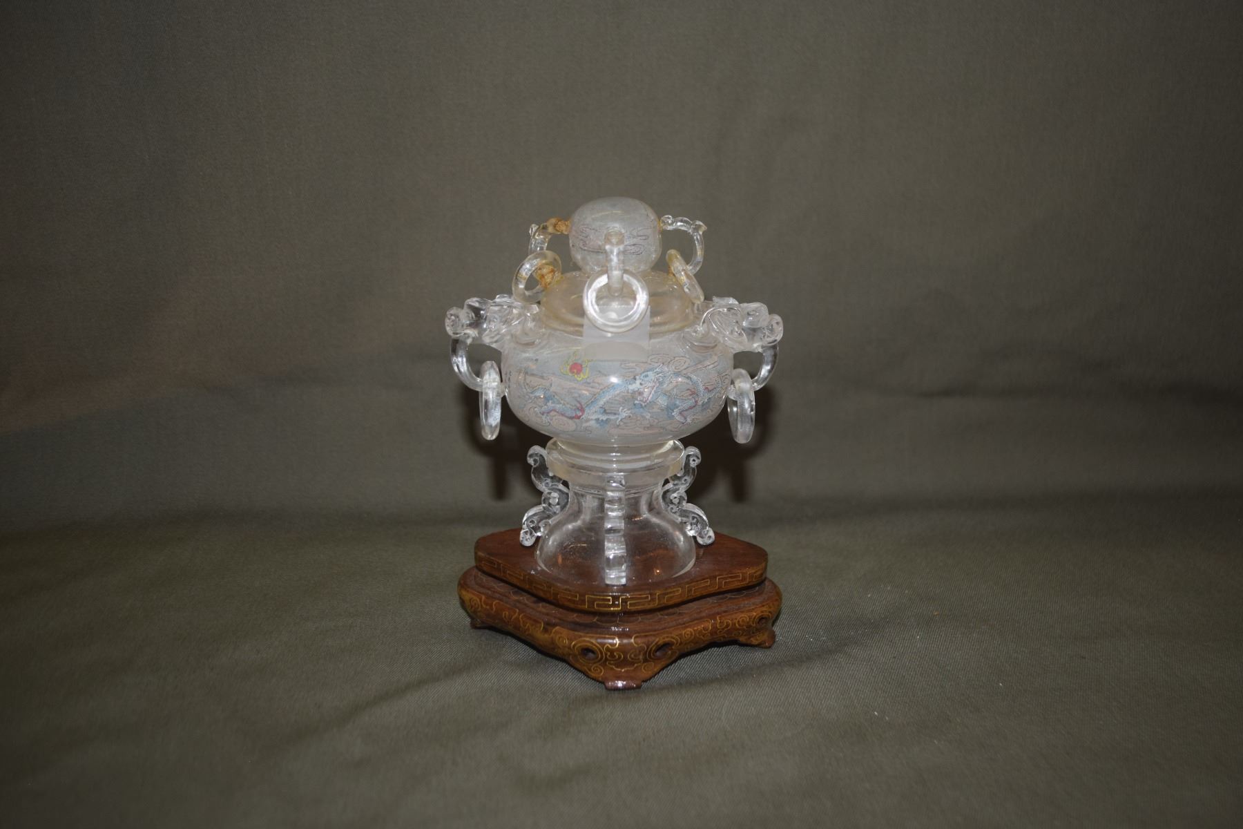 CHINESE CRYSTAL GLASS REVERSED PAINTED DRAGON ORNAMENTAL CENSER W/STAND (SOME DAMAGE) (6")