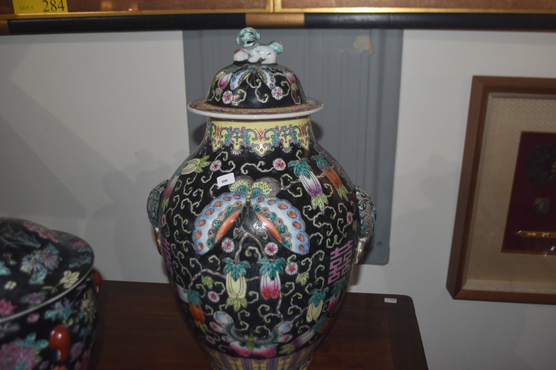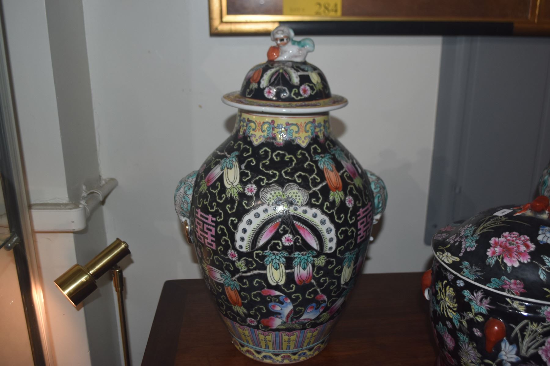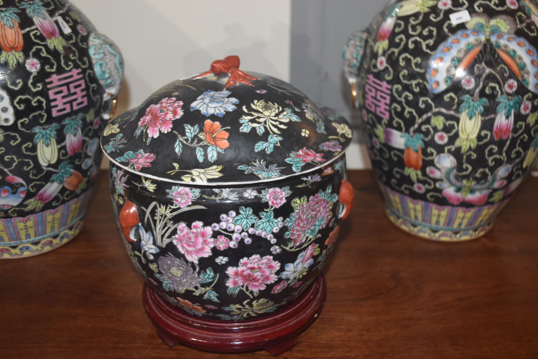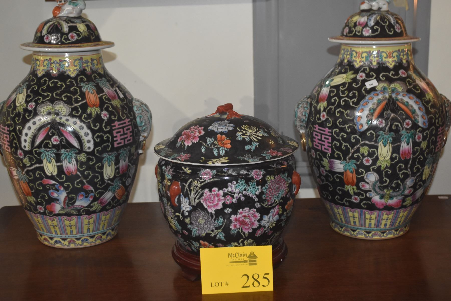 CHINESE FAMILLE NOIRE PORCELAIN GINGER JARS & TUREEN W/STAND (10 1/2" - 17")(3 PCS)