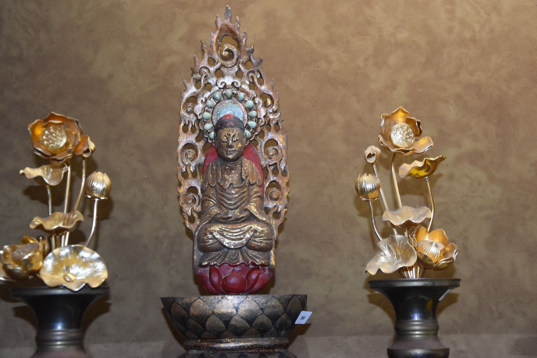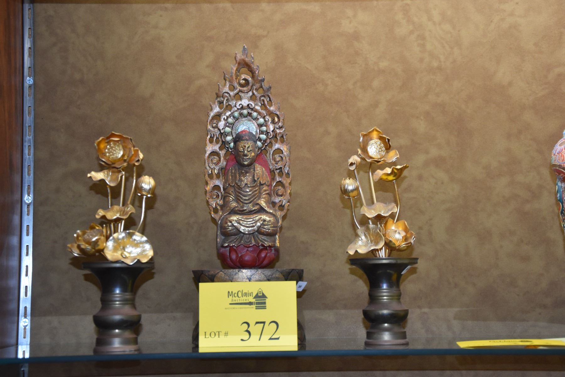 CHINESE GILT SEATED BUDDHA & BRONZE LOTUS VASES (3 PCS)