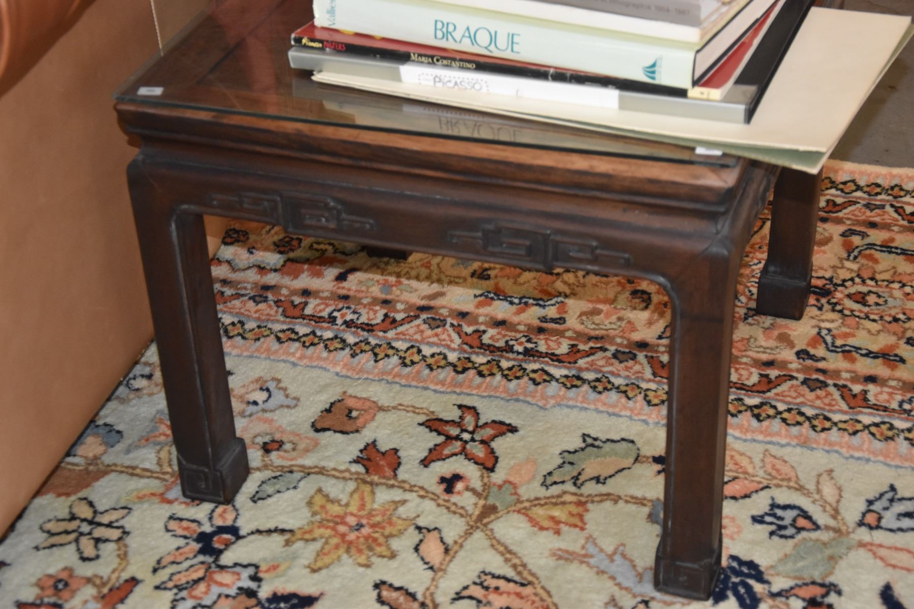 CHINESE HARDWOOD SIDE TABLES W/GLASS (20" X 20" X 16") (PAIR)