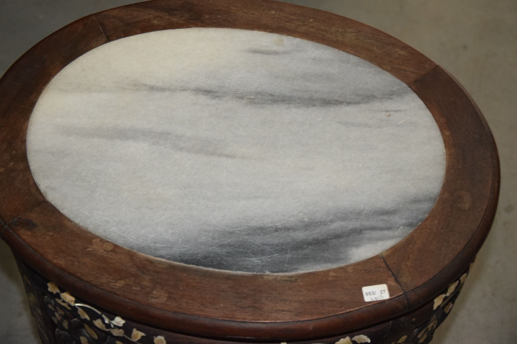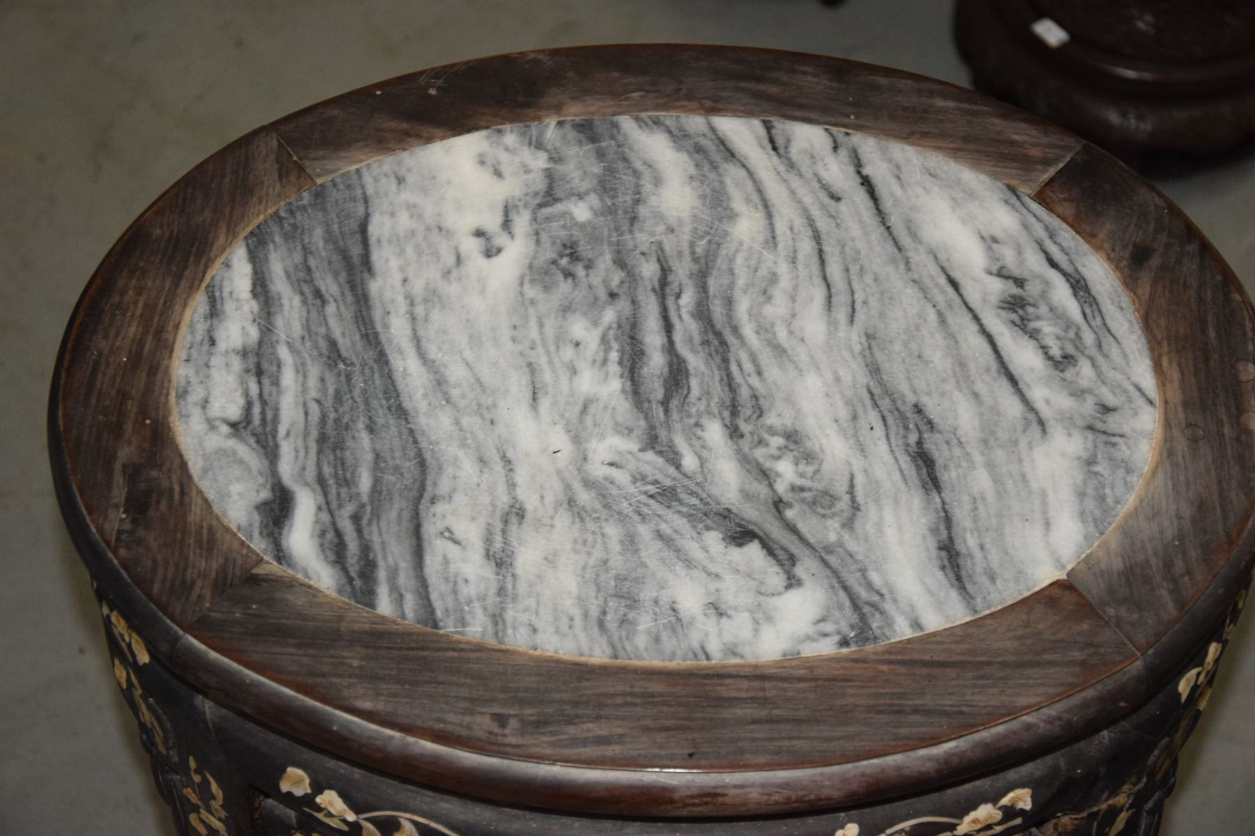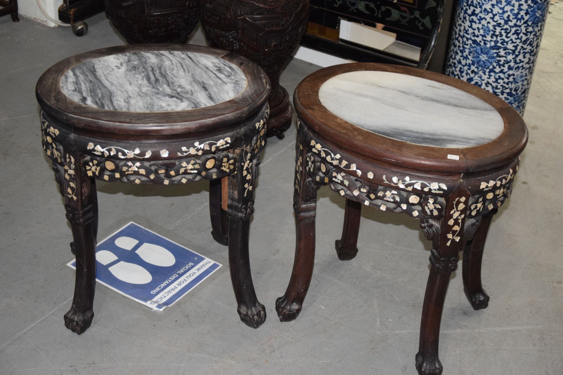 CHINESE HARDWOOD SIDE TABLES W/MARBLE TOPS & MOTHER OF PEARL INLAY (2 PCS) (DOWRY GIVEN TO CONVENT) (FROM REV. CLARENCE GUERREIRO COLLECTION)