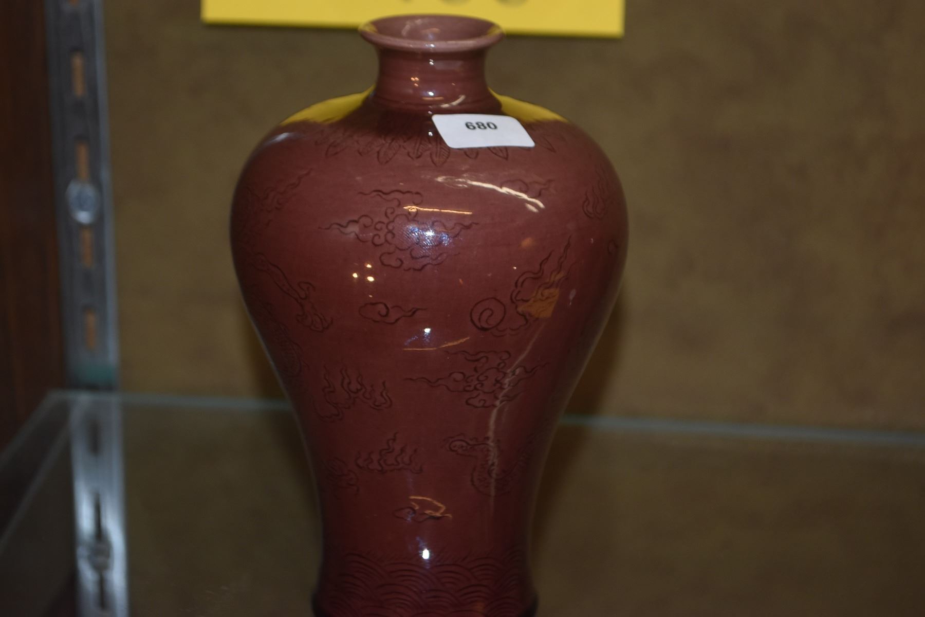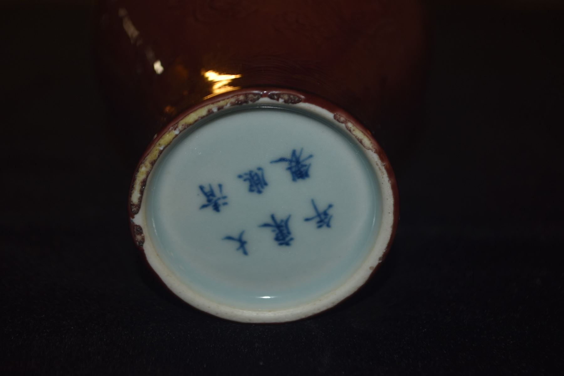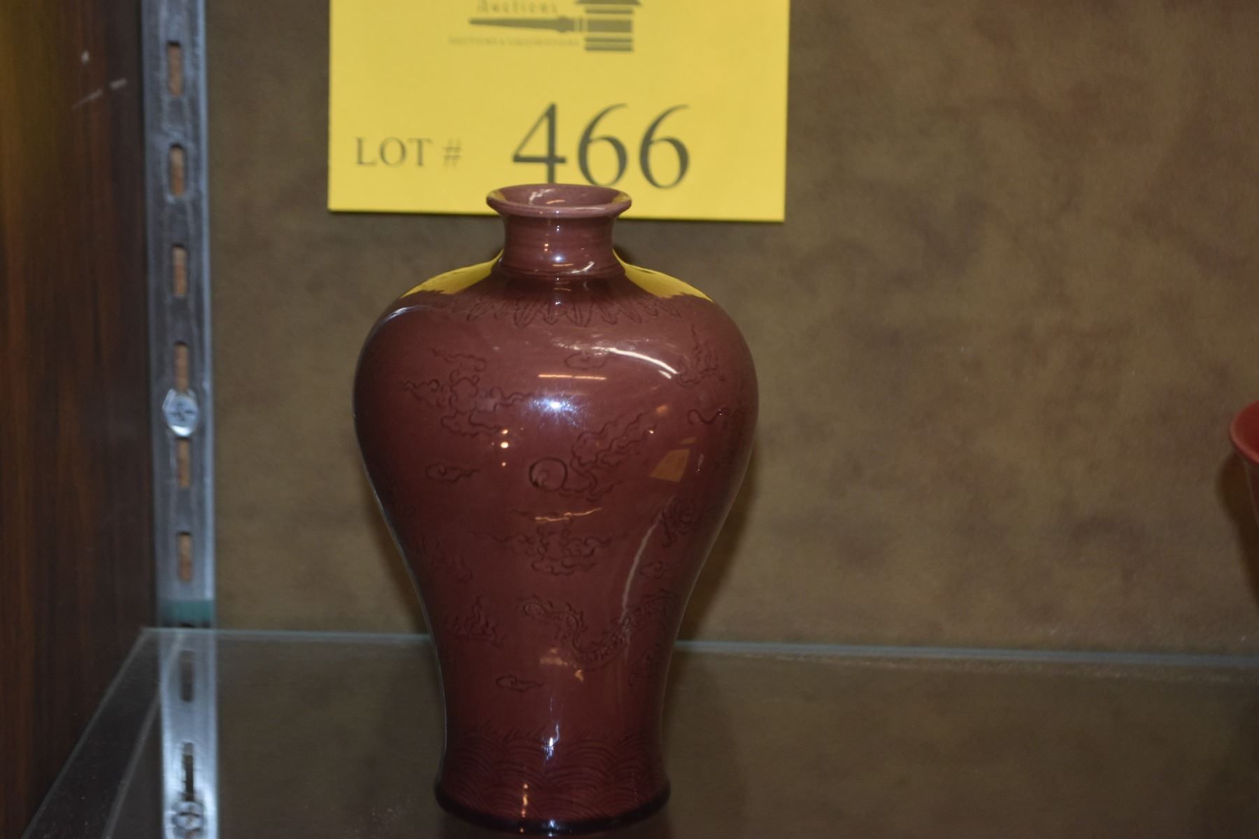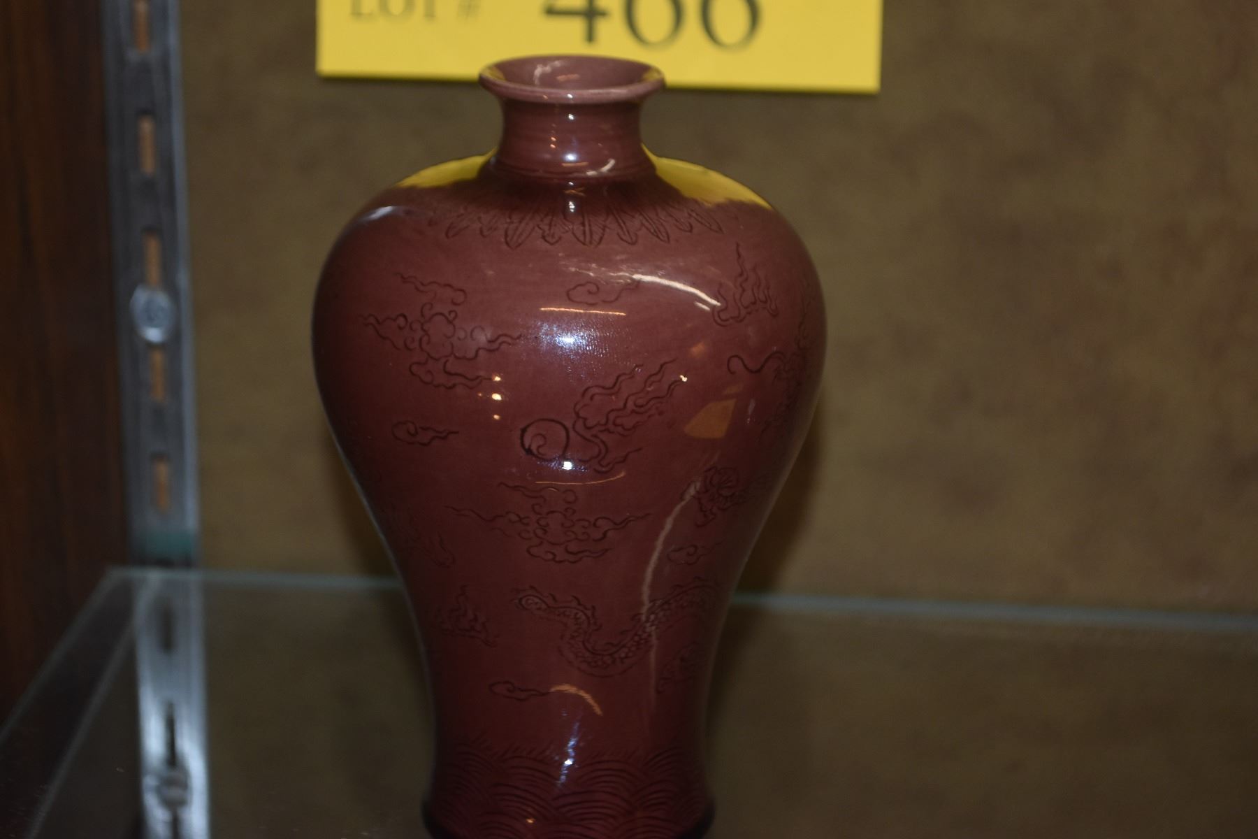 CHINESE INCISED DRAGON PORCELAIN PLUM TONE VASE; SIGNED (5 1/4")