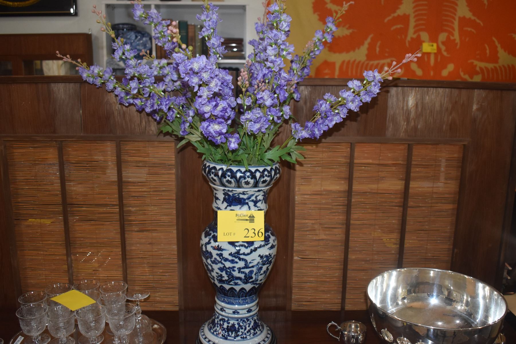 CHINESE MING STYLE BLUE & WHITE PORCELAIN VASE (17 1/2") (DOES NOT INCLUDE STAND OR FLOWERS)