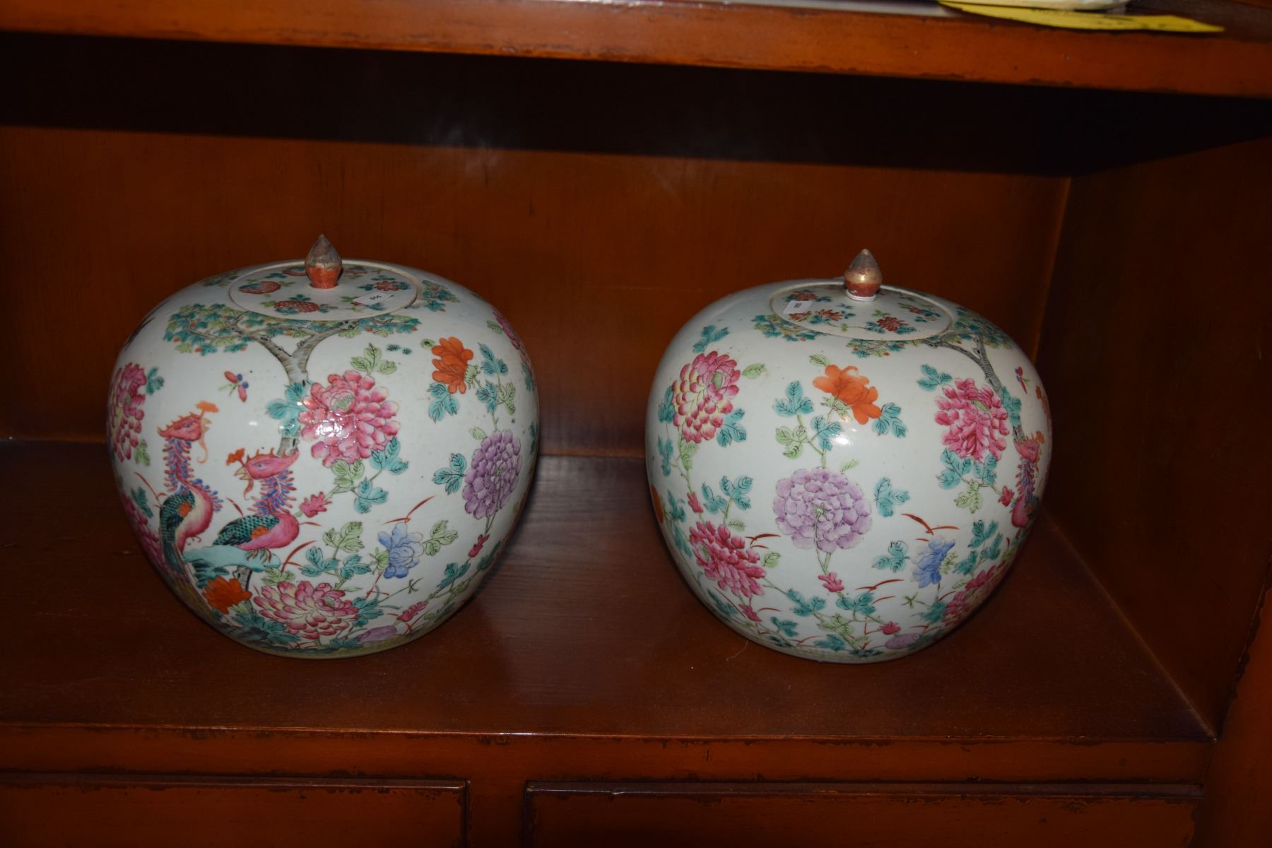 CHINESE POLYCHROME PORCELAIN GINGER JARS (PAIR) (9")