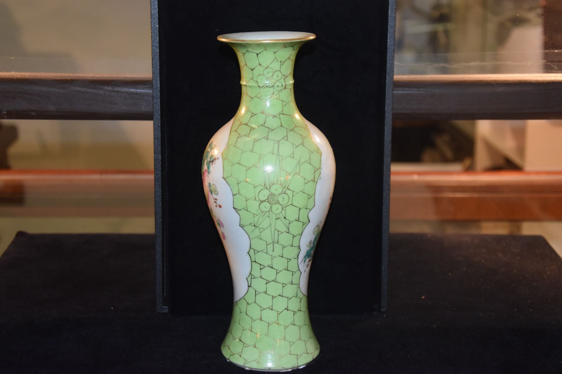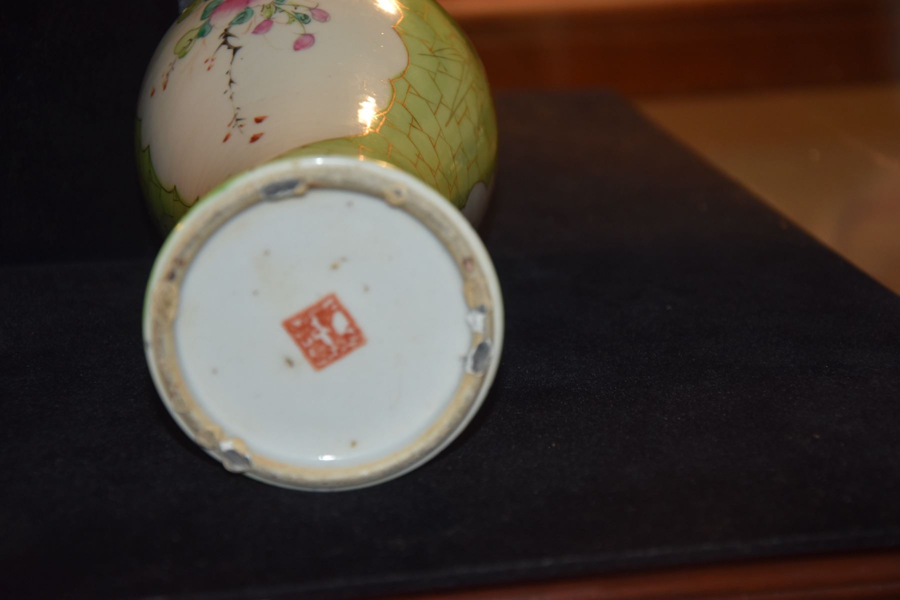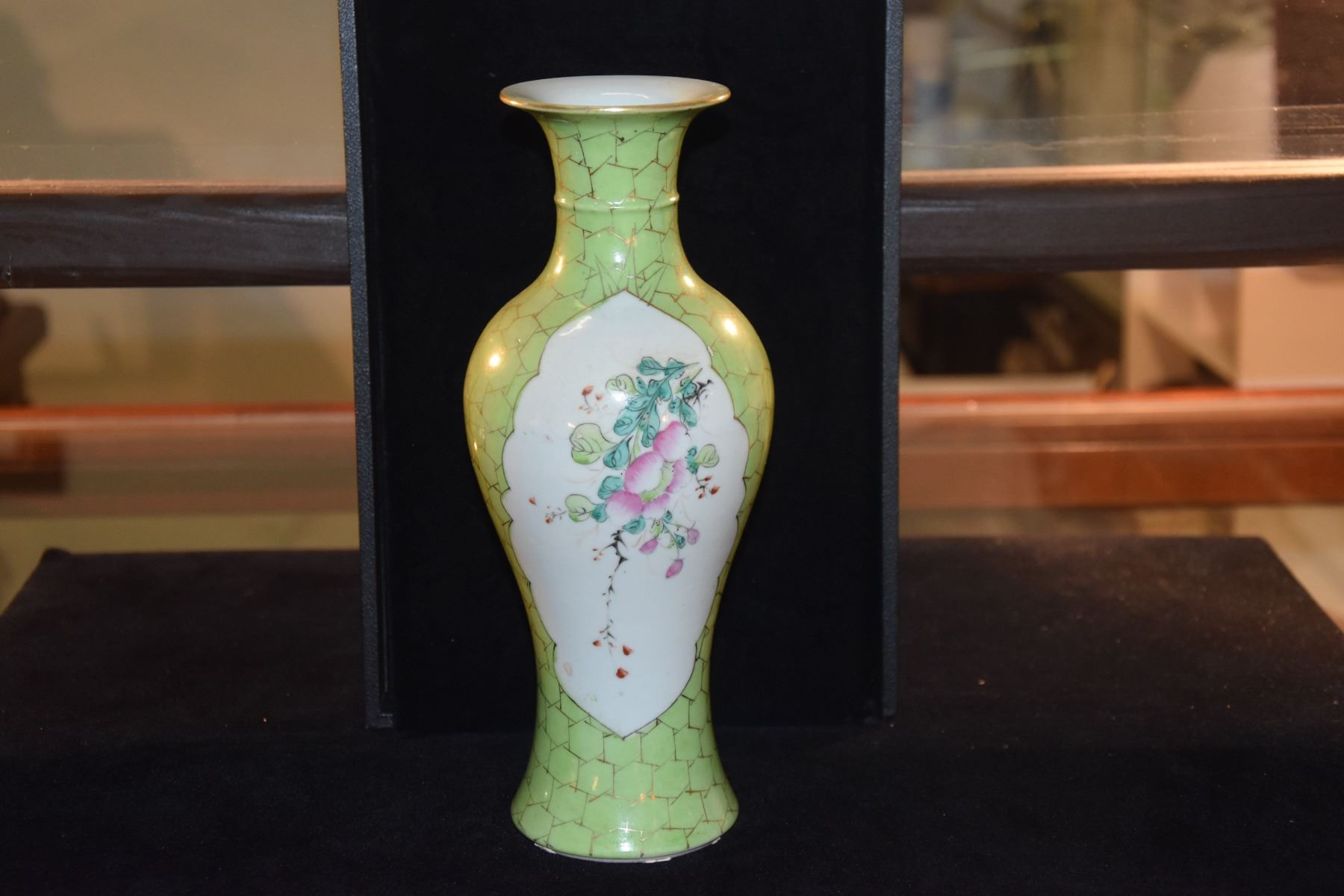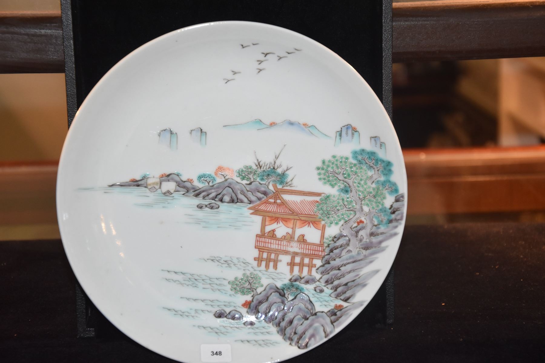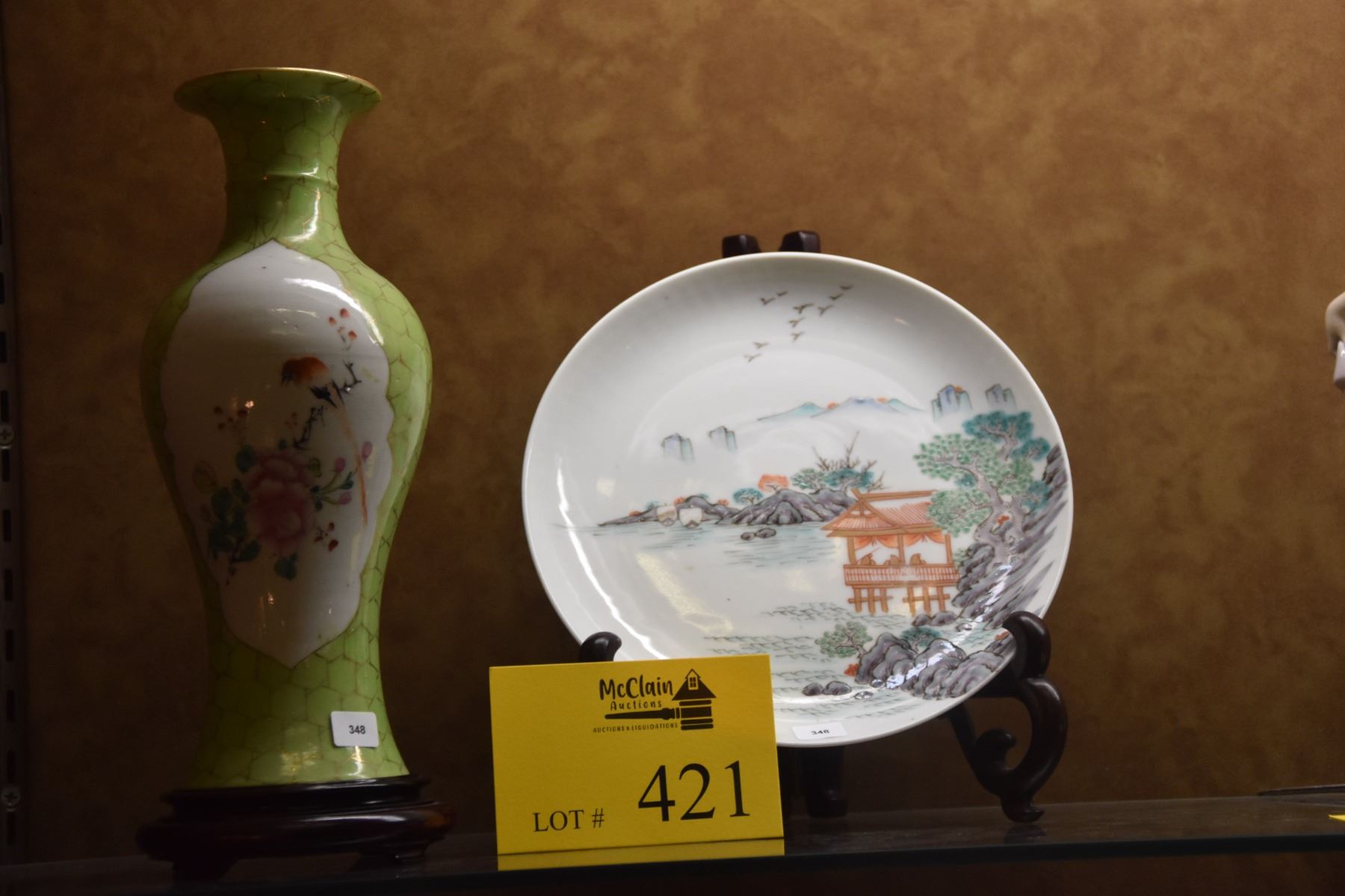 CHINESE PORCELAIN FLORAL BEAKER VASE; SIGNED (10 1/4") & POLYCHROME PLATE, LANDSCAPE MOTIF (8 1/2") (2 PCS) (DOES NOT INCLUDE STAND)