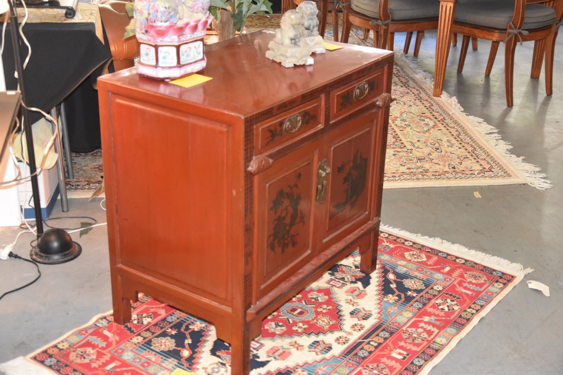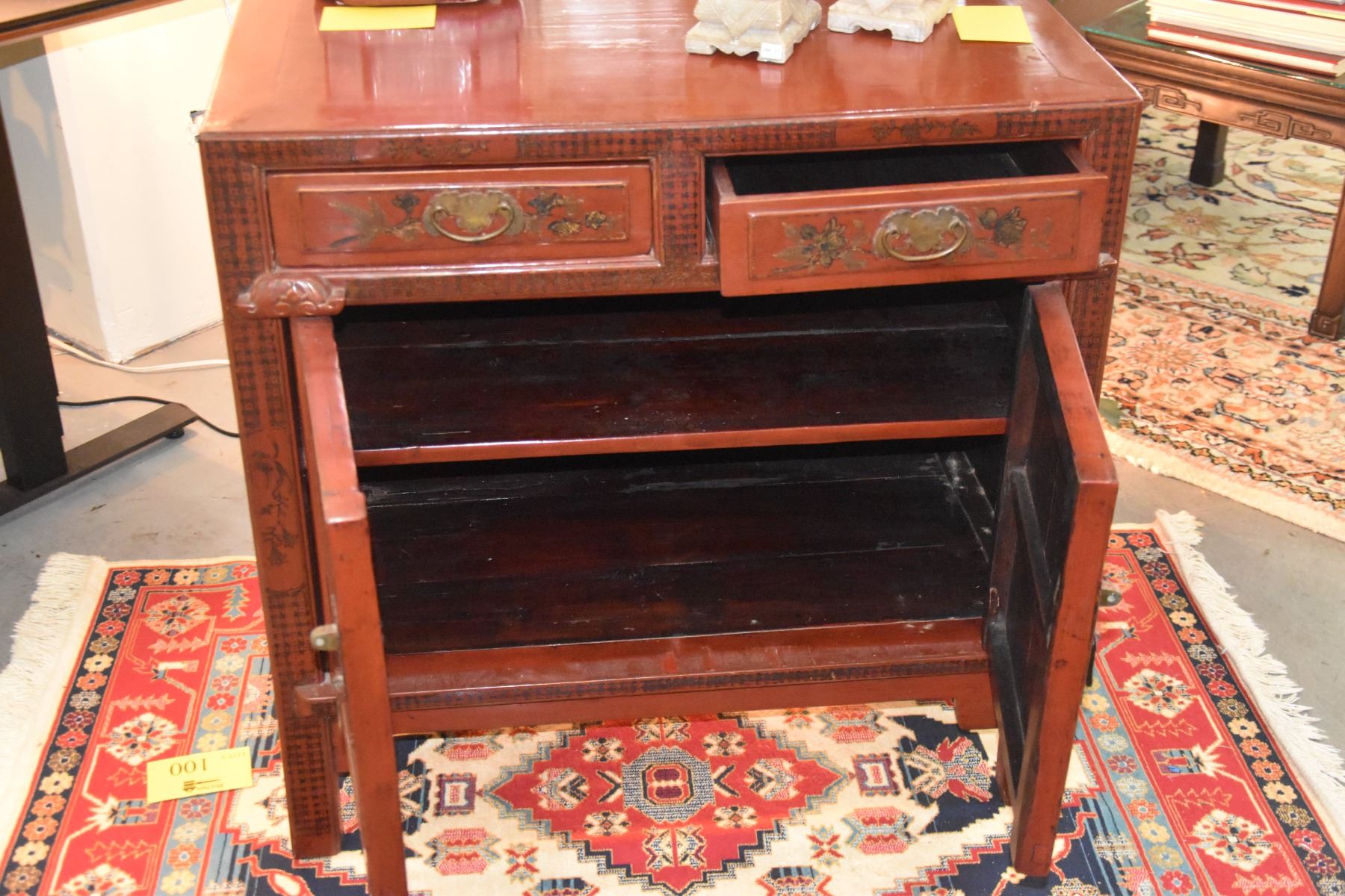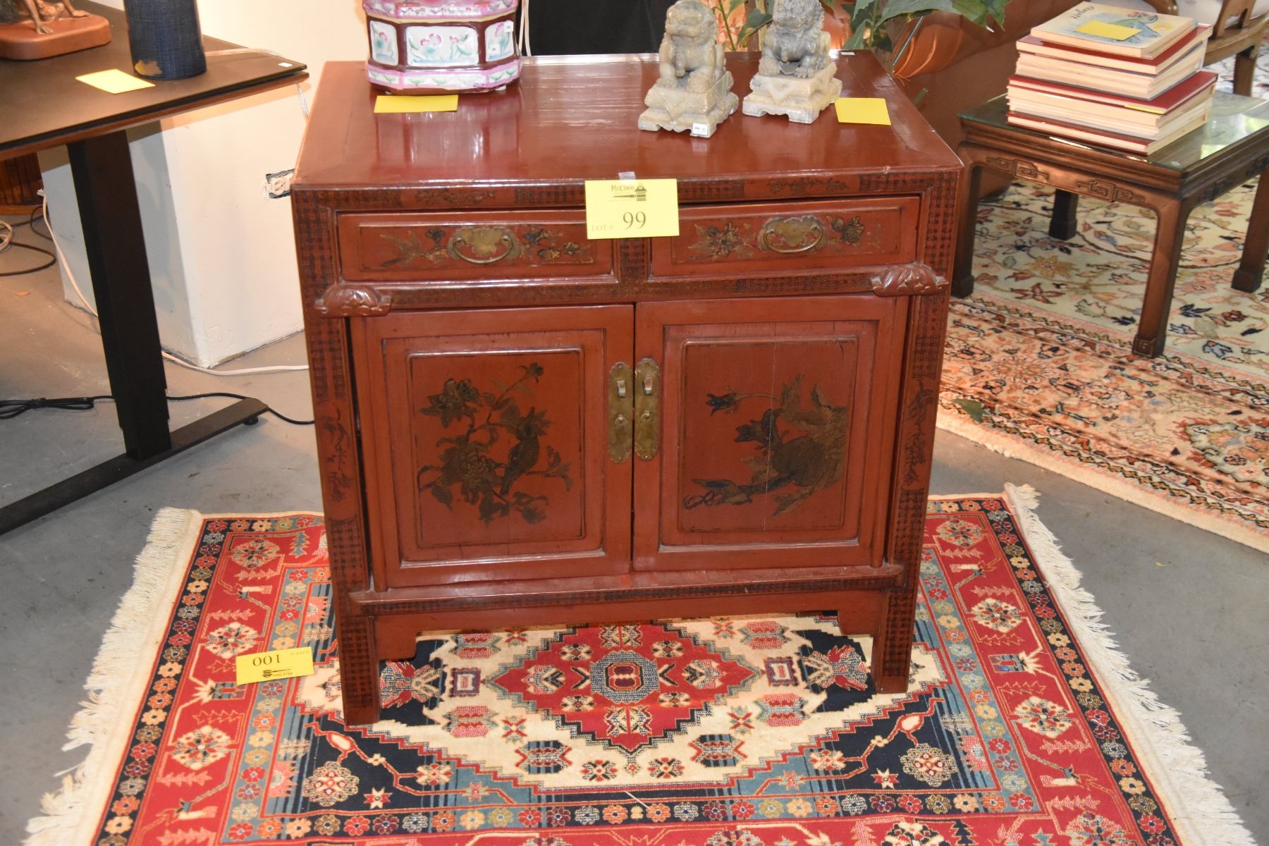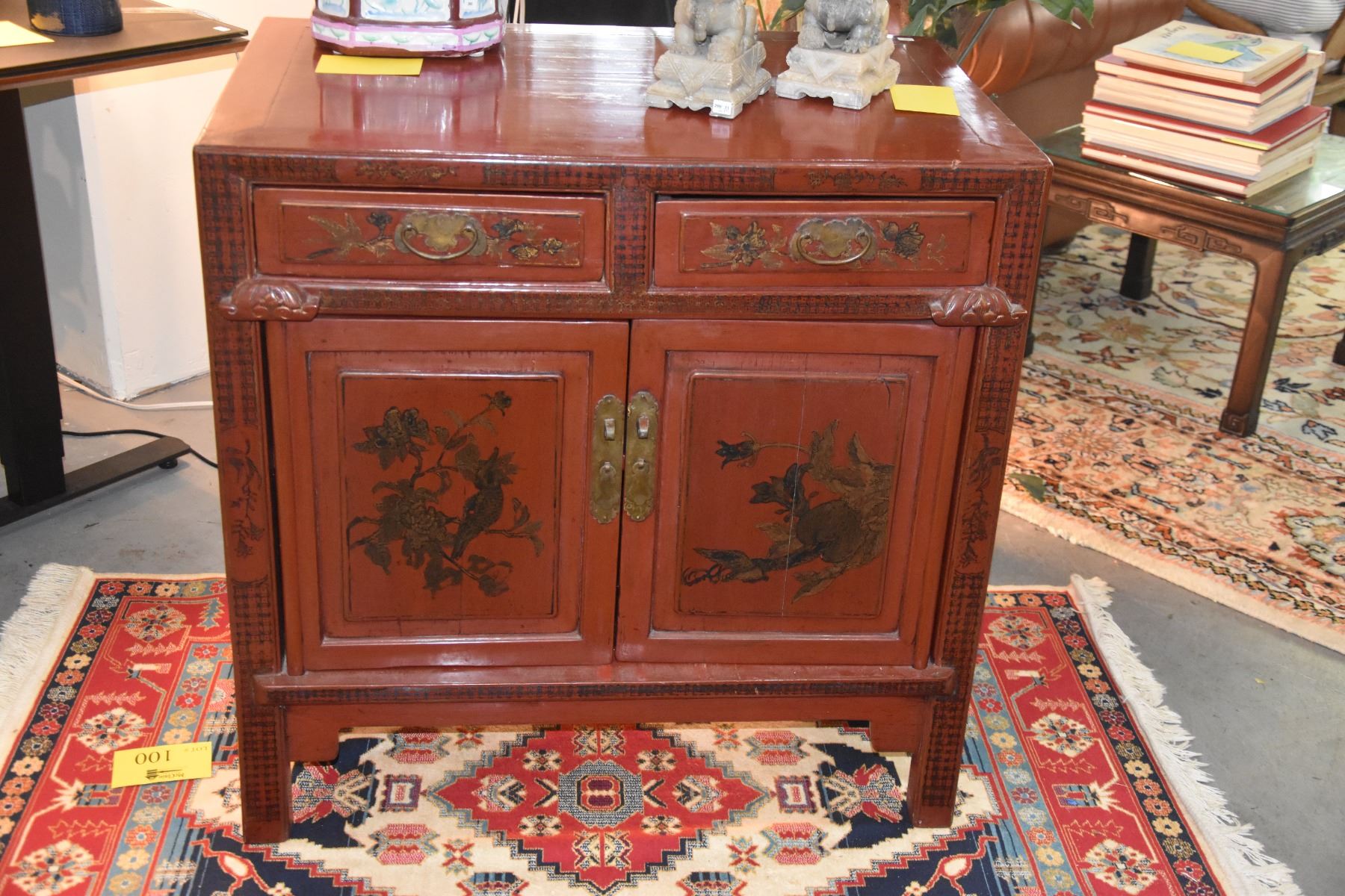 CHINESE RED LACQUER CHEST W/2 DRAWERS & 2 DOORS W/FLOWER & BIRD MOTIF (32" X 20 1/4" X 32")