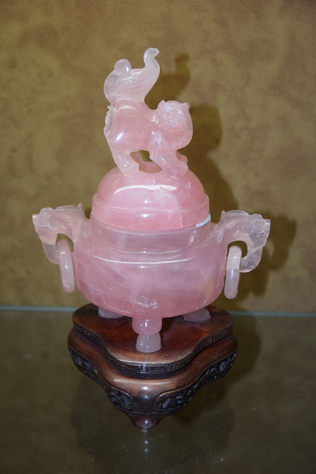 CHINESE ROSE QUARTZ CENSER W/FU DOG & STAND (6 1/2")