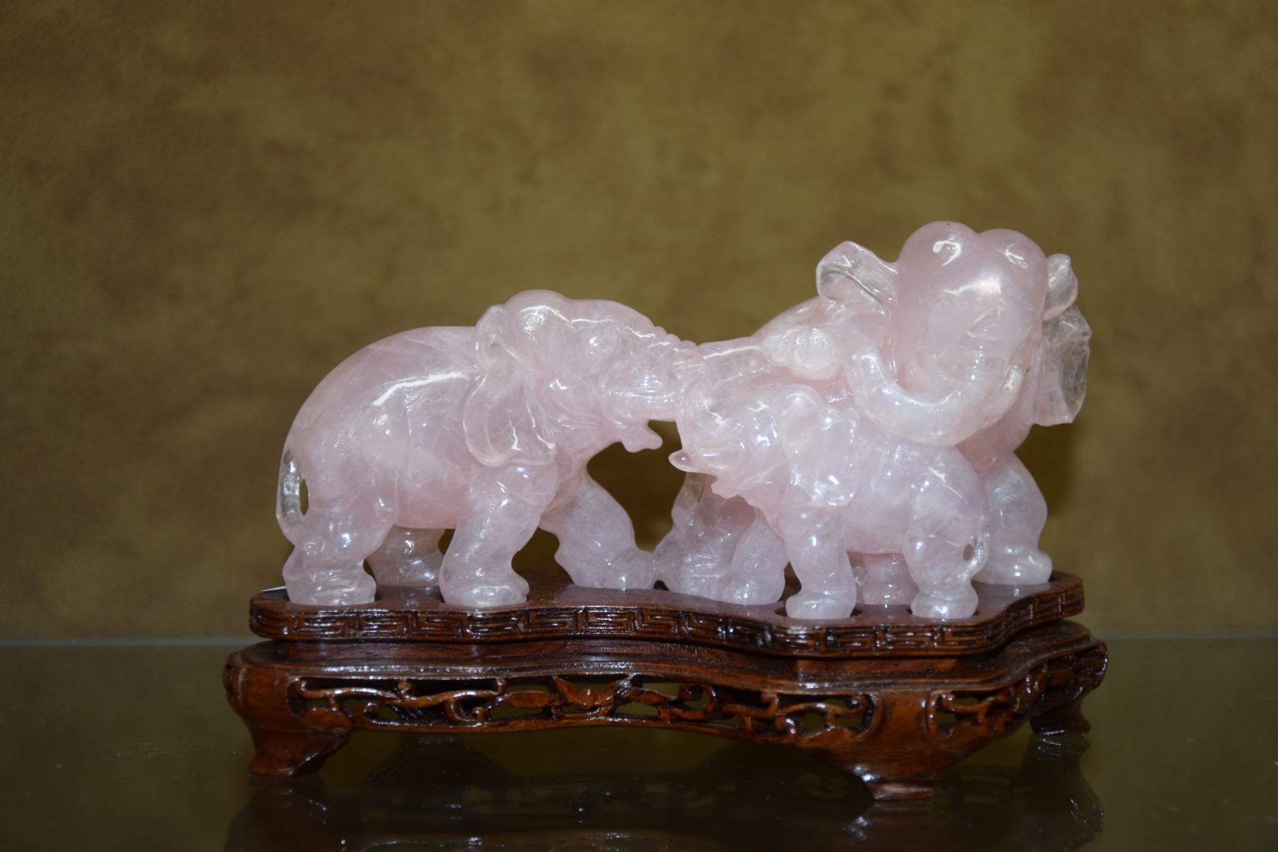 CHINESE ROSE QUARTZ ELEPHANT CARVING ON STAND (6" X 2 1/2")