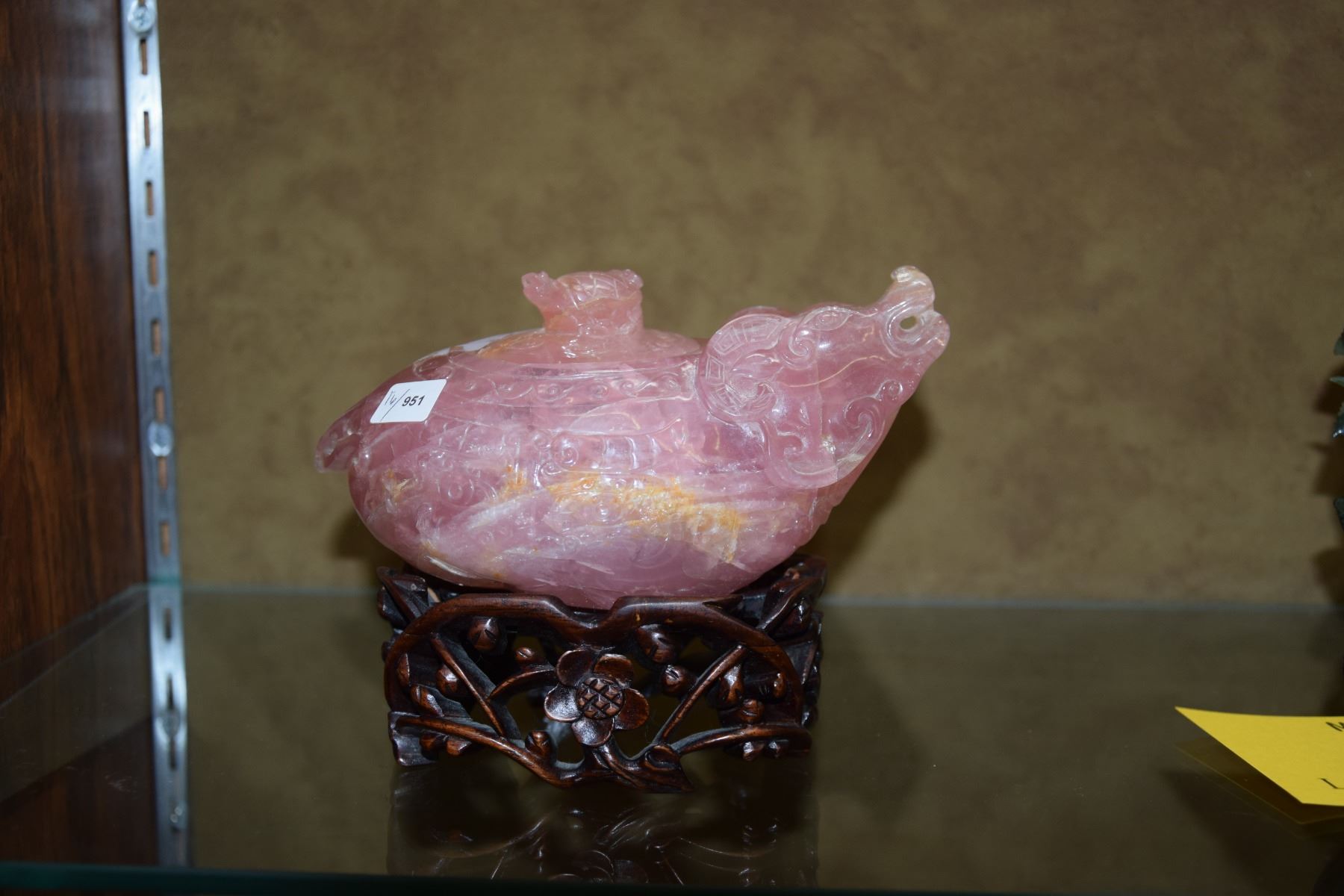 CHINESE ROSE QUARTZ RAM LIDDED BOWL W/STAND (6 1/2" X 3 1/2")
