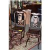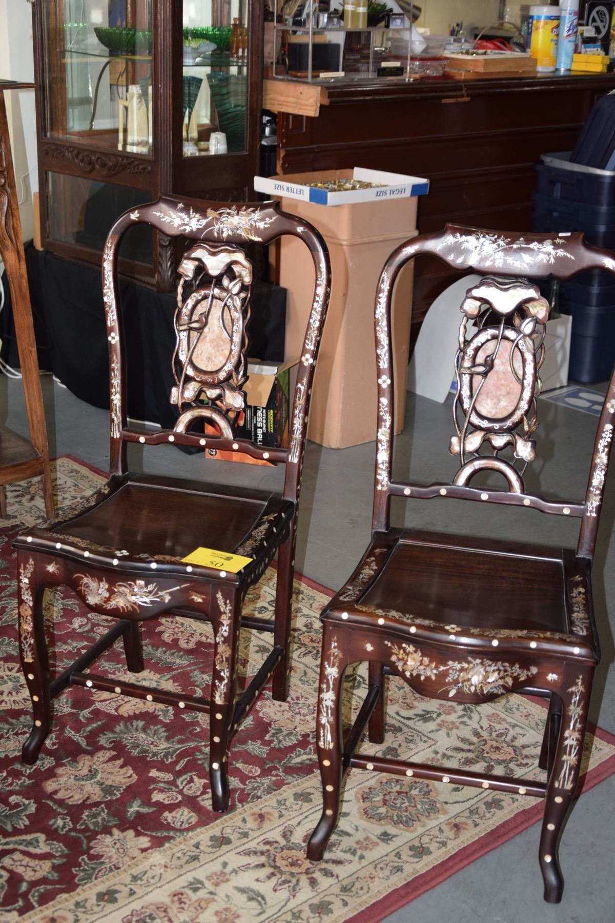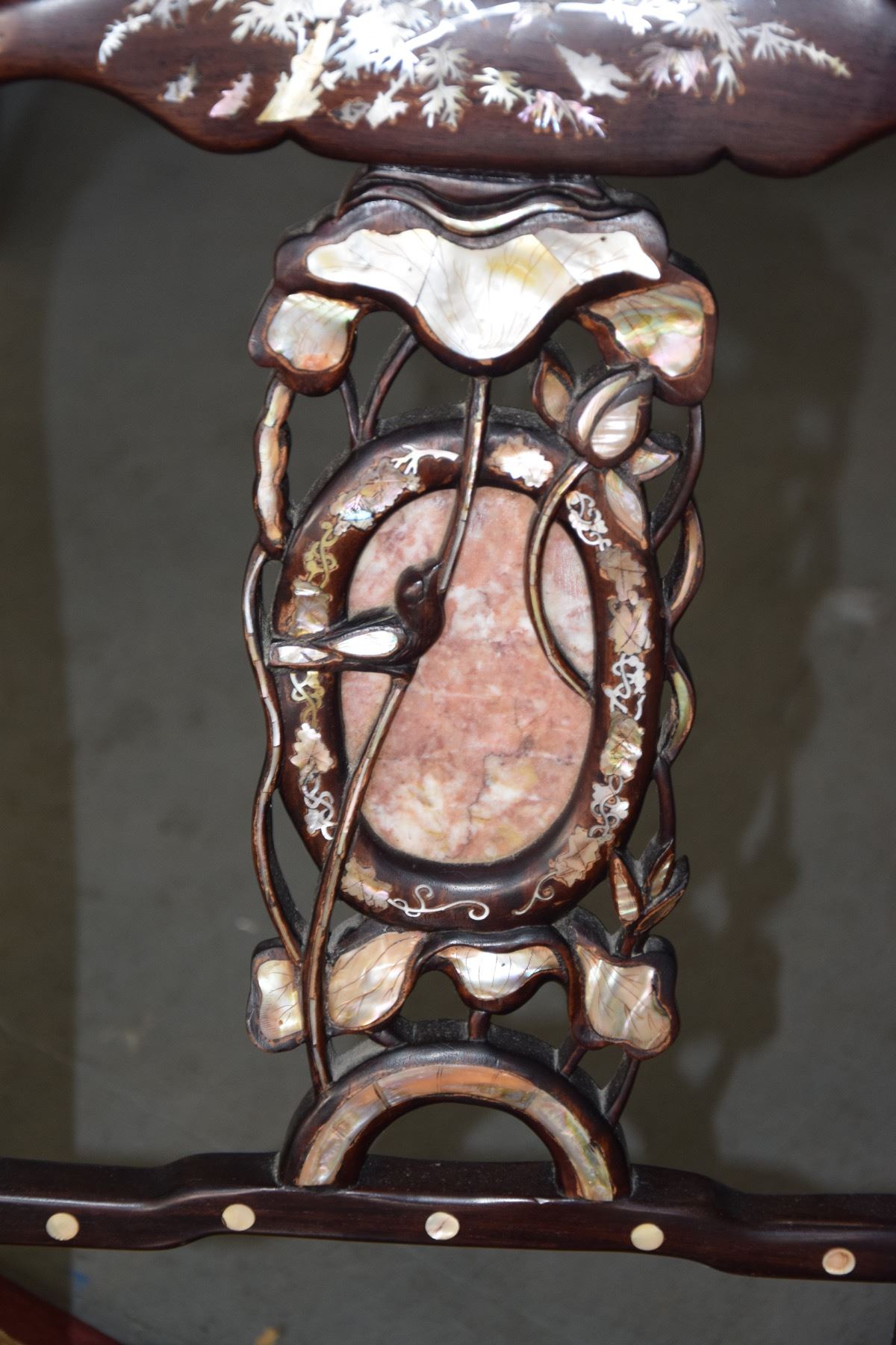 CHINESE ROSEWOOD SIDE CHAIRS W/MOTHER OF PEARL INLAY OF FLOWERS & BIRDS, THE BACK SPLAT W/CARVED LOTUS FLOWERS & BIRDS DESIGN W/OVAL STORY MARBLE INSET (38 3/4" H) (PAIR)