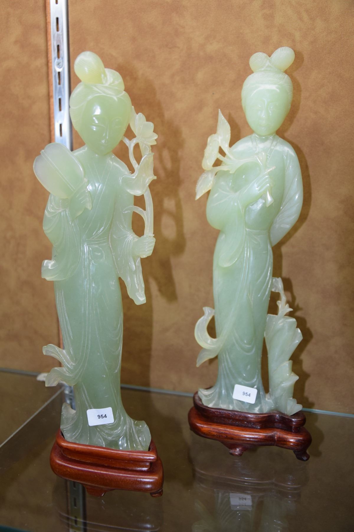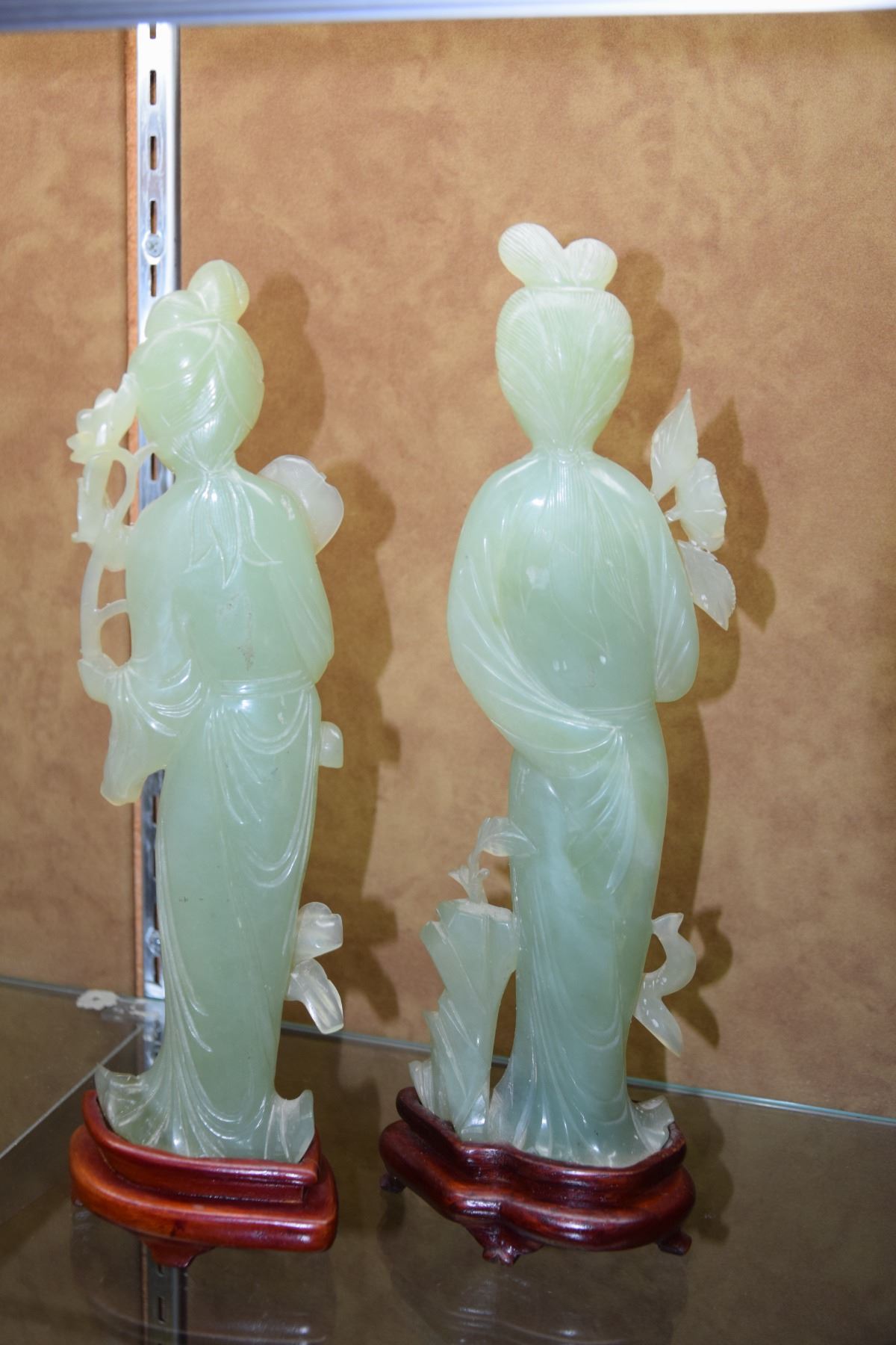 CHINESE SERPINTINE JADE BEAUTIES ON STANDS (10 1/2" X 11") (PAIR)