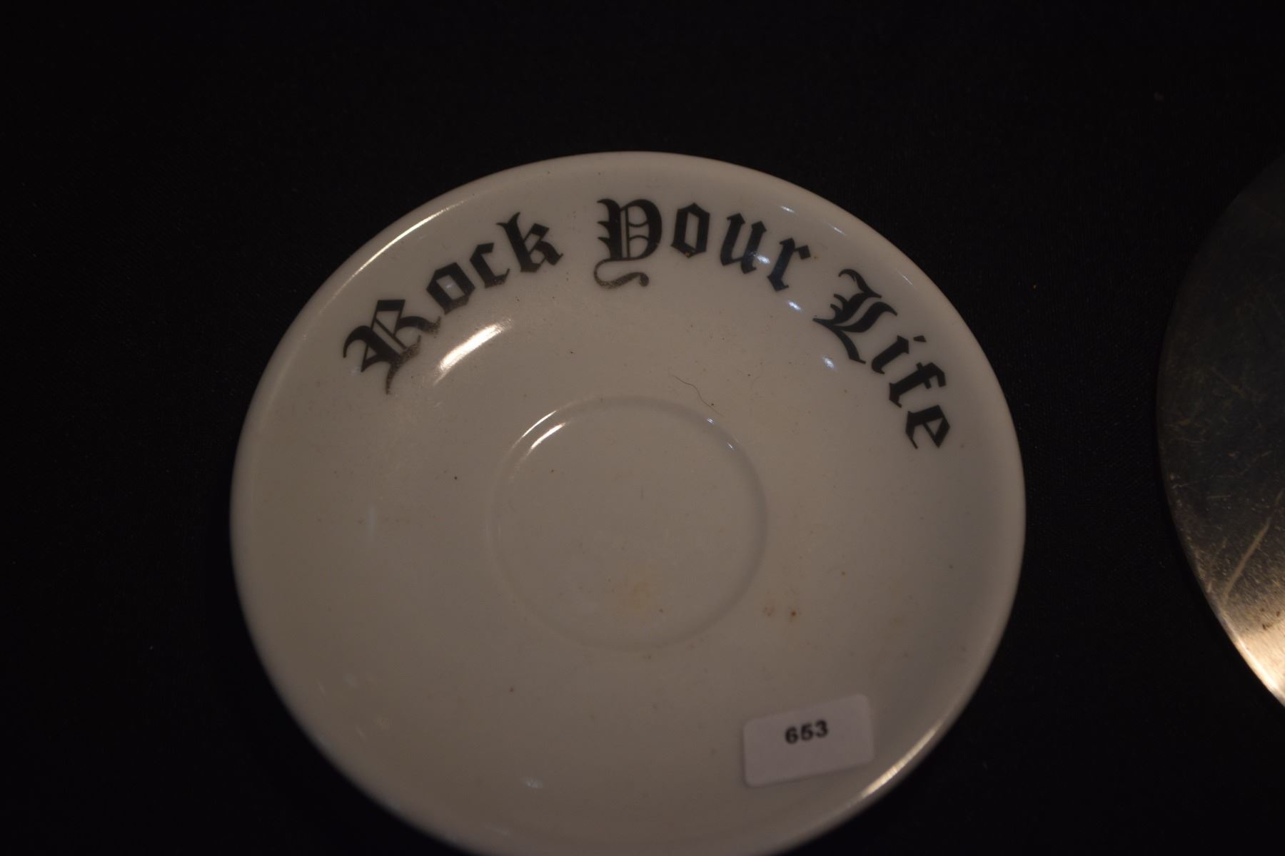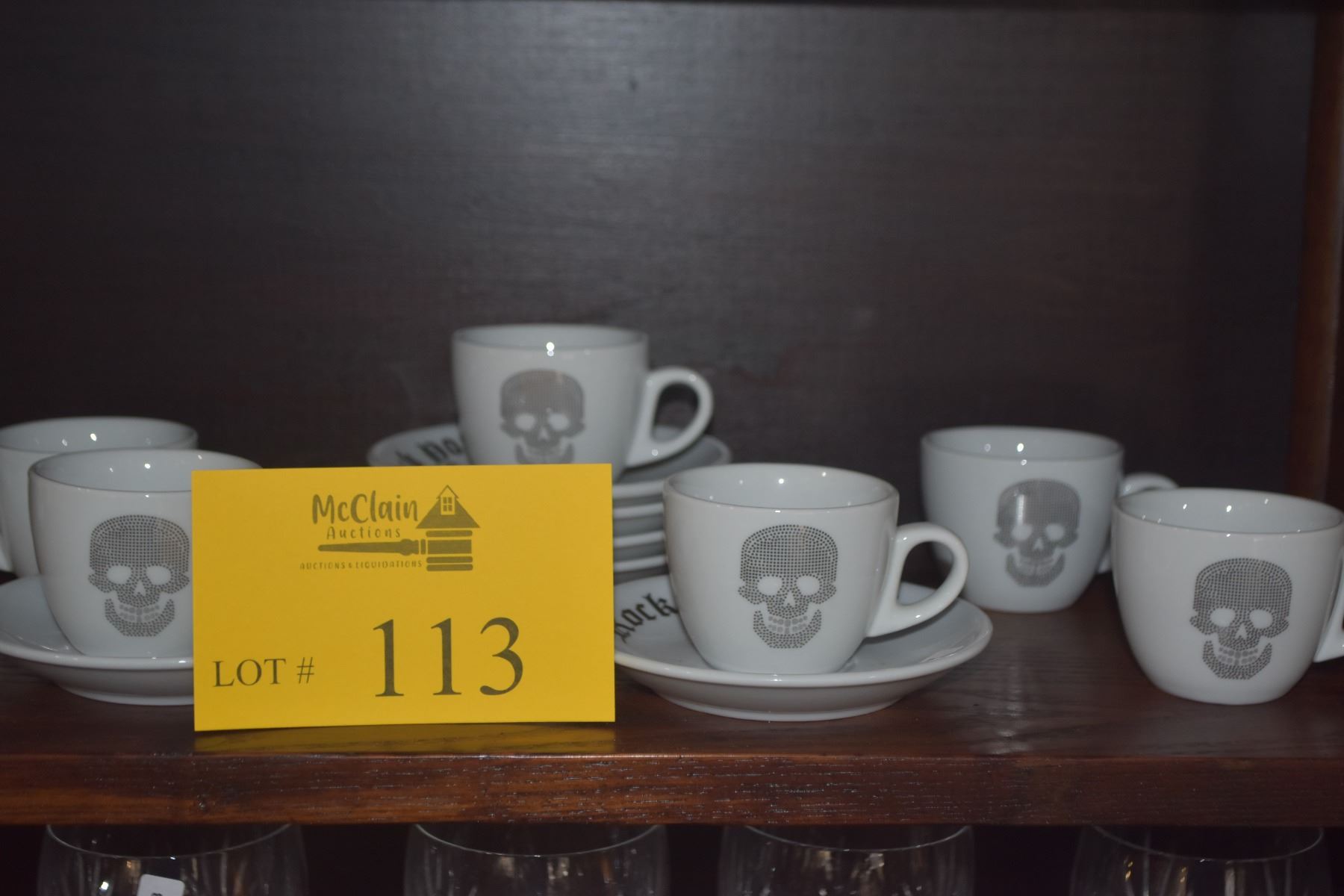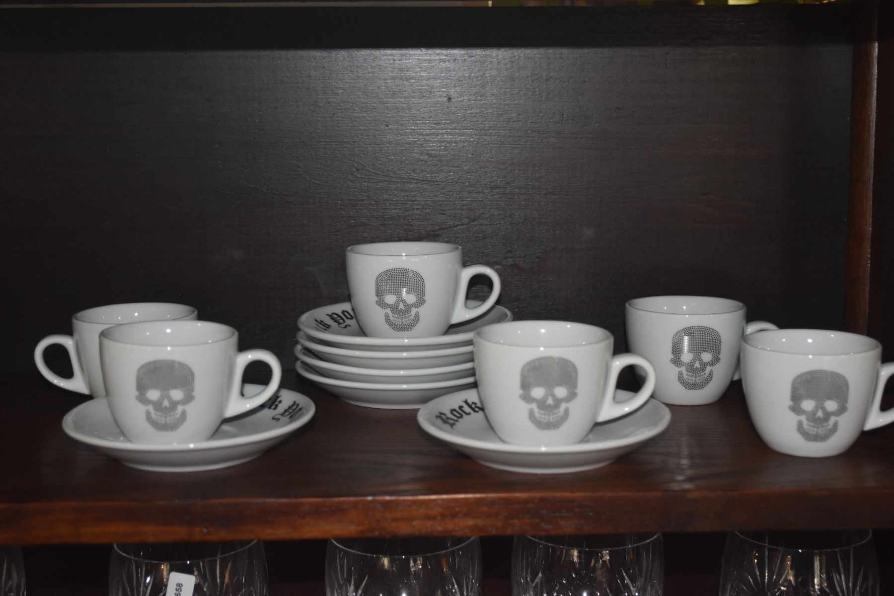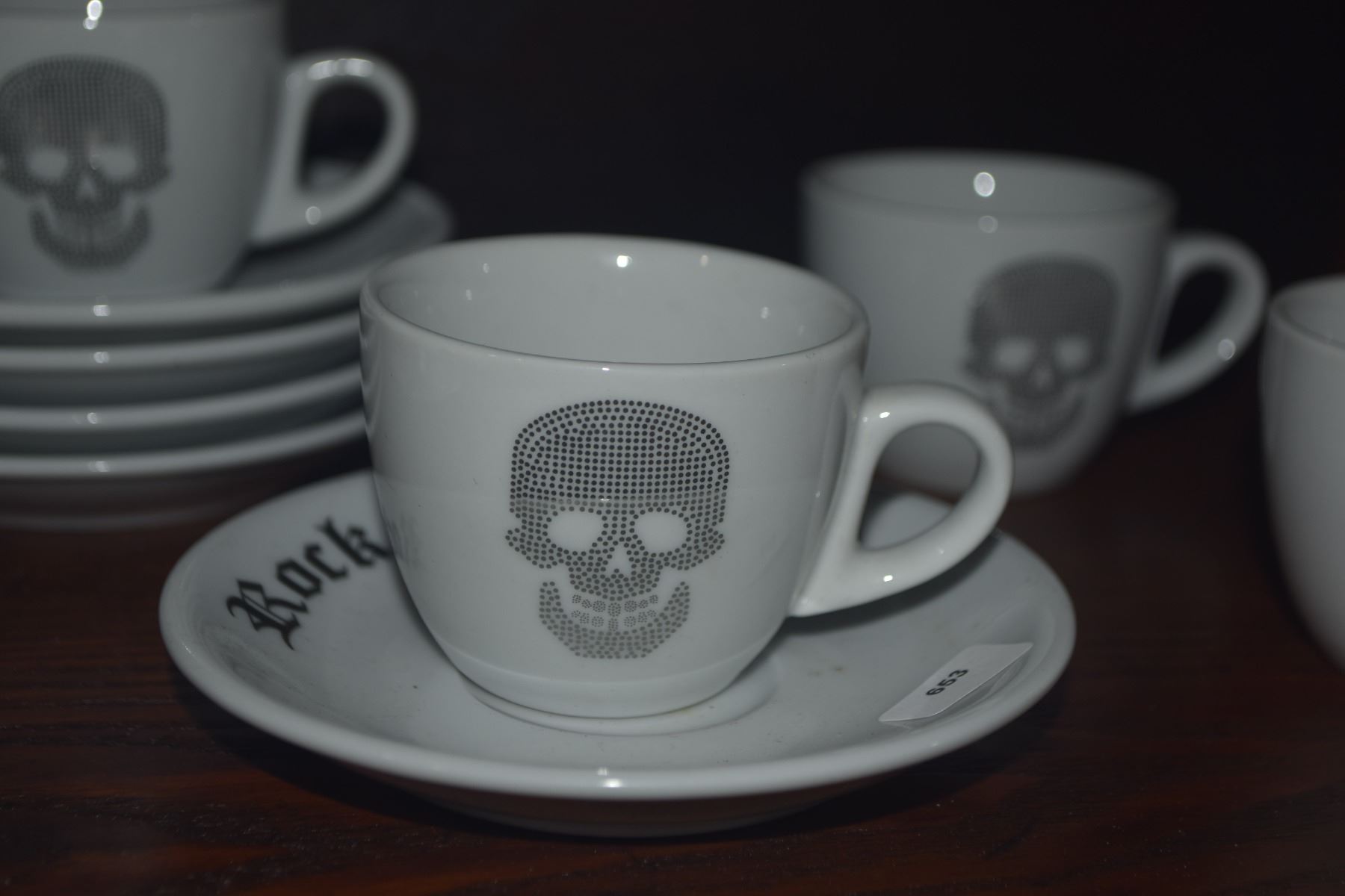CHRISTIAN AUDIGIER PORCELAIN TEA CUPS & SAUCERS SET W/SKULL MOTIF & "ROCK YOUR LIFE" TEXT (SET OF 6)