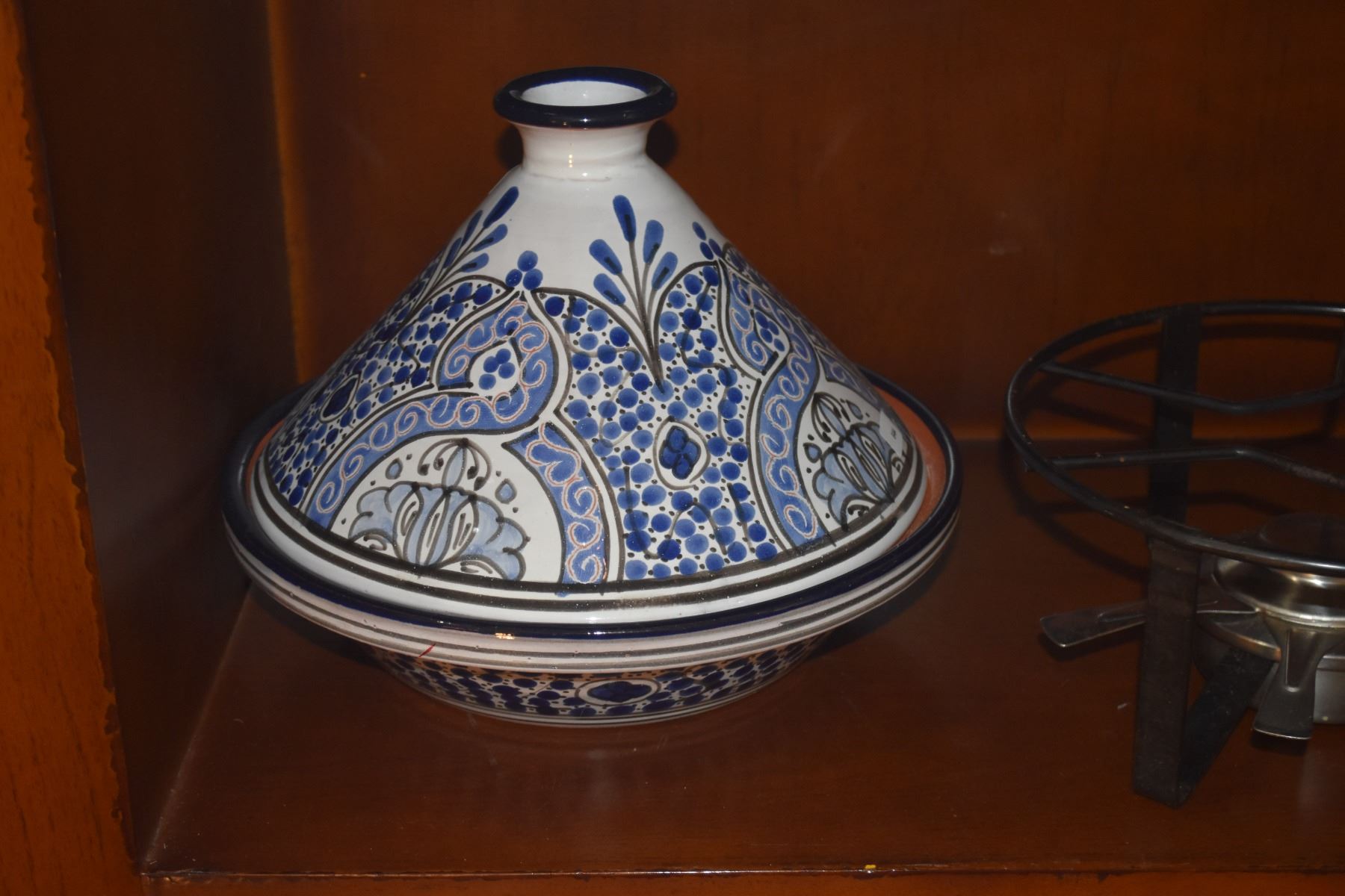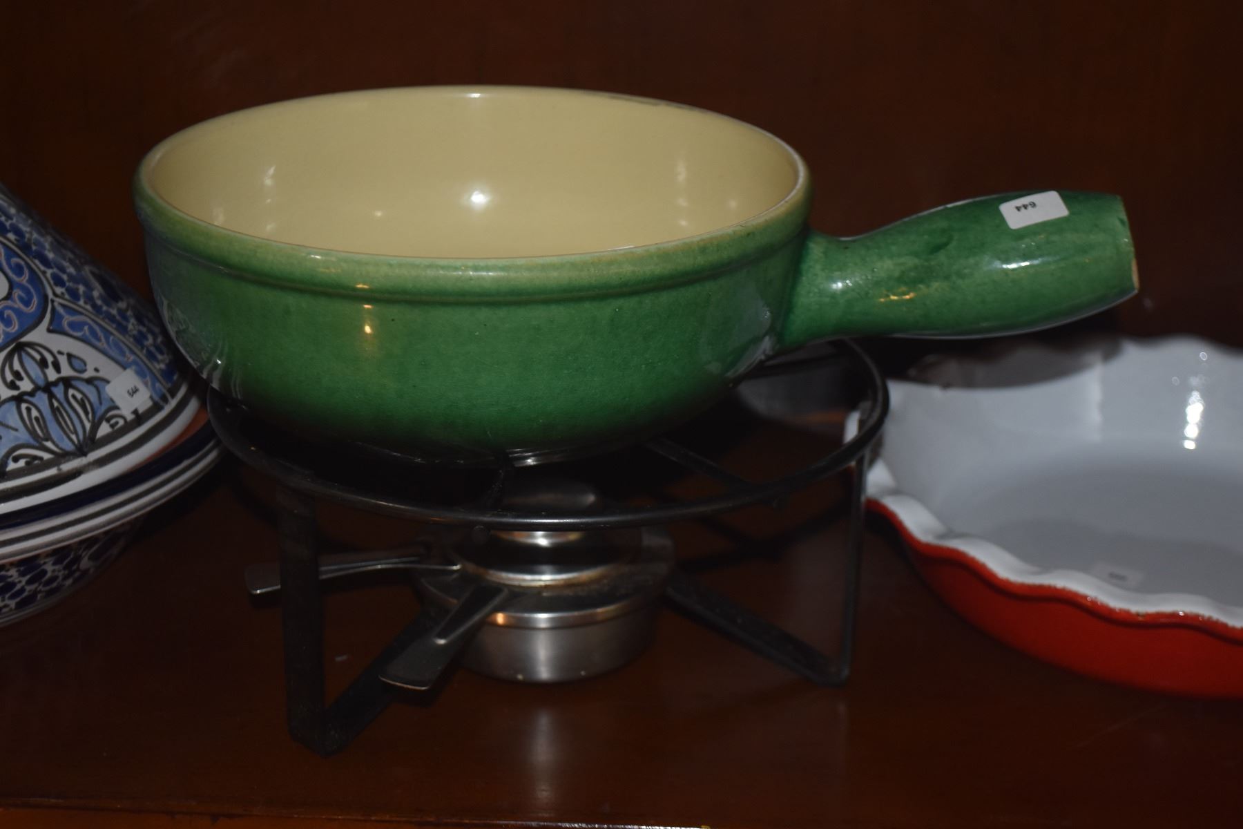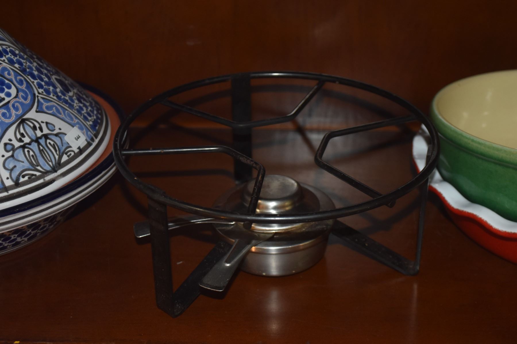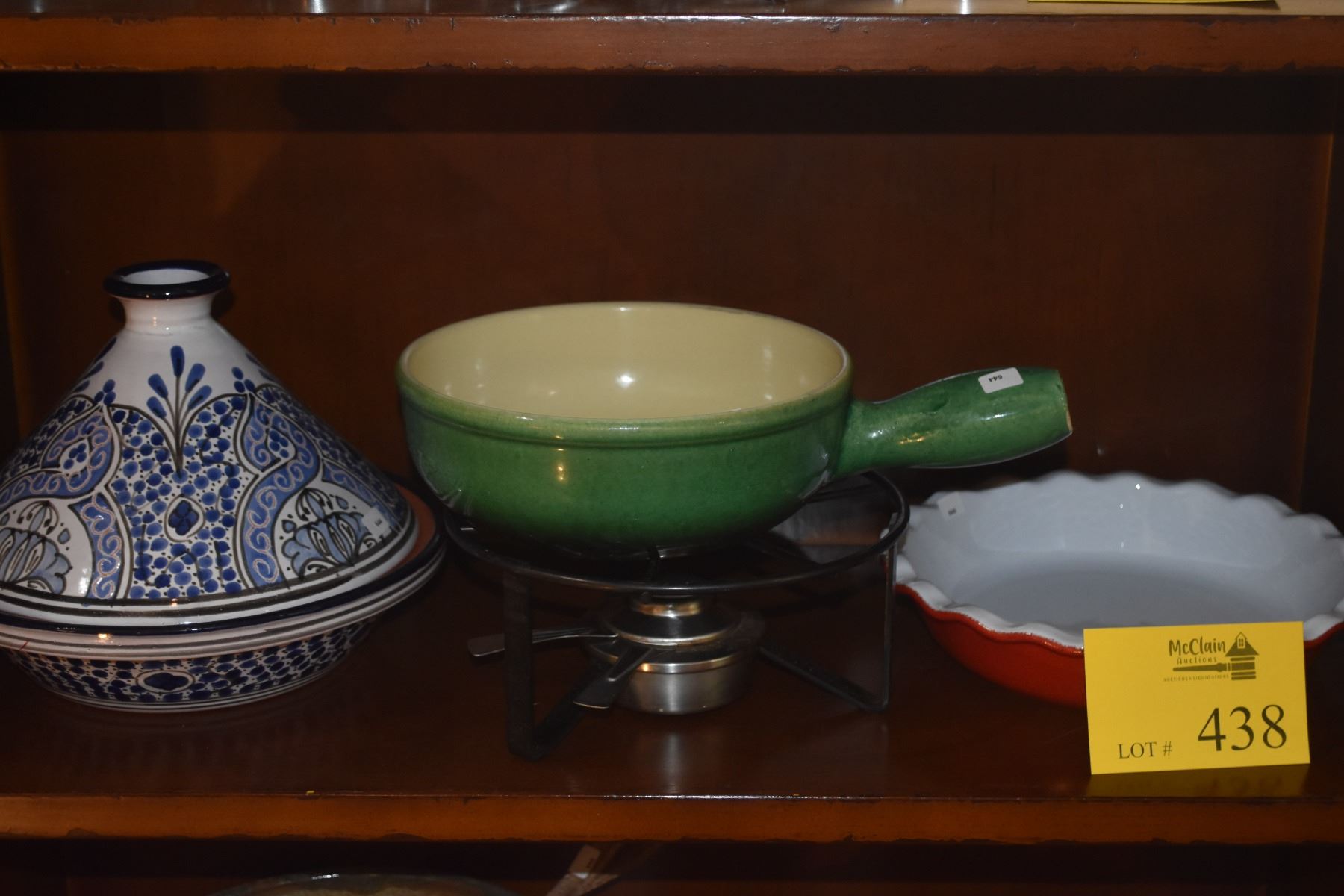 CLAY TAGINE, MID CENTURY LANDERT FONDUE POT W/STAND & EMILY HENRY PIE DISH (3 PCS)