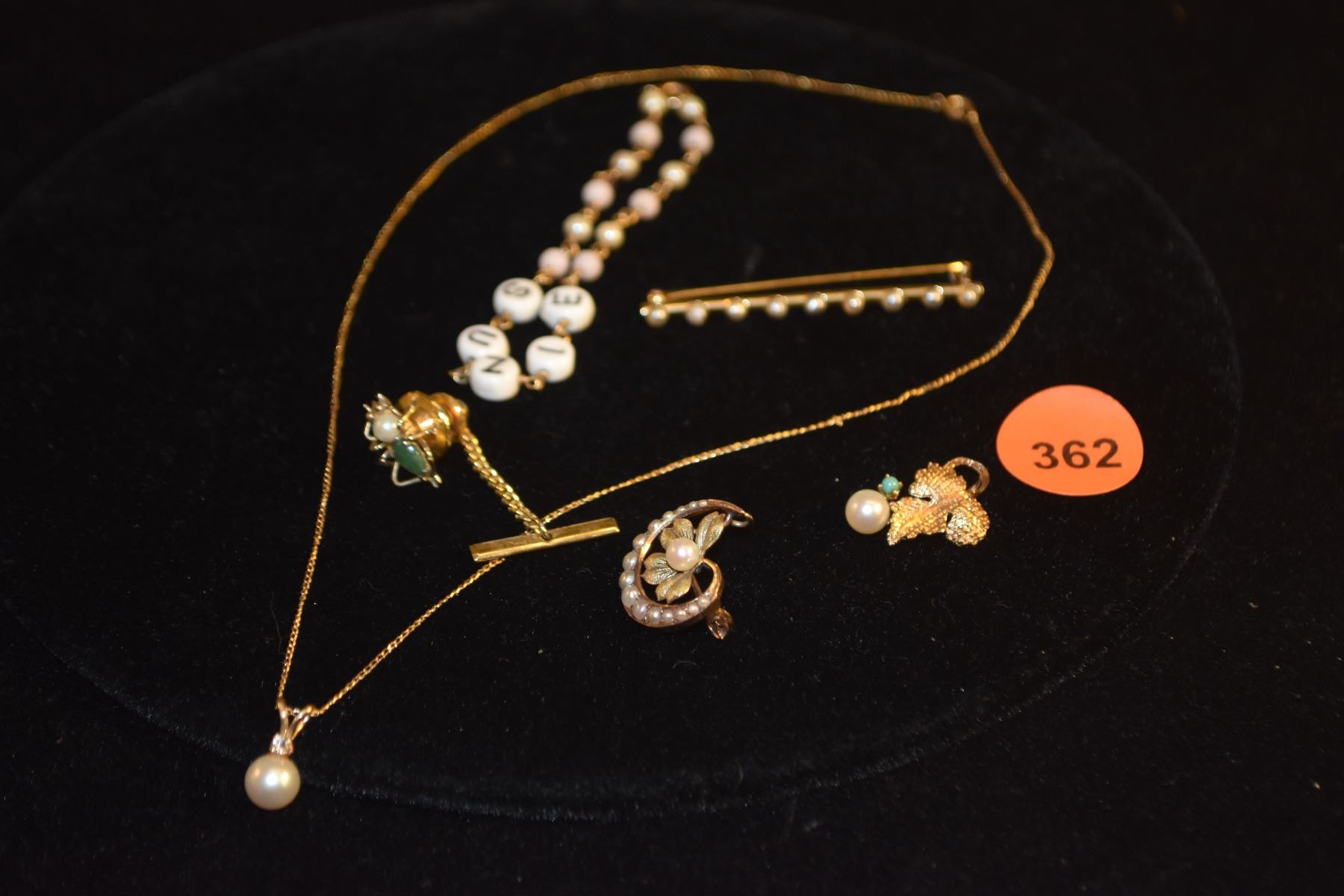 COLLECTION OF 14K PEARL PENDANTS (1 W/CHAIN), BRACELET, PINS & TIE PIN (6 PCS) (12.3 GTW)
