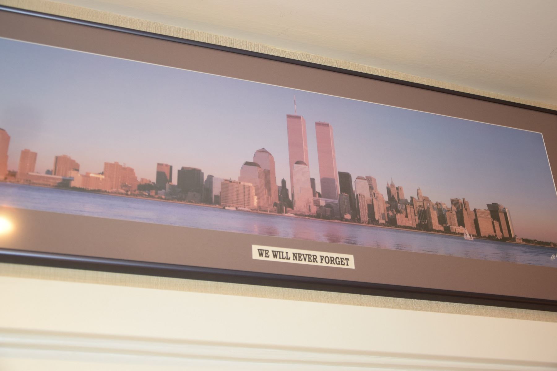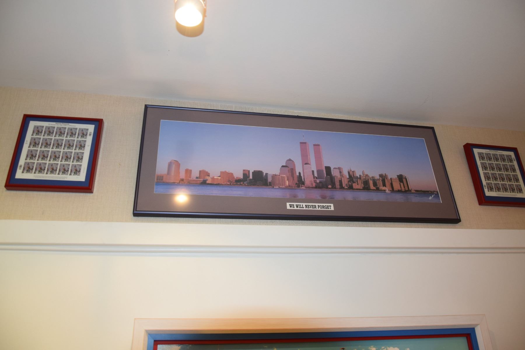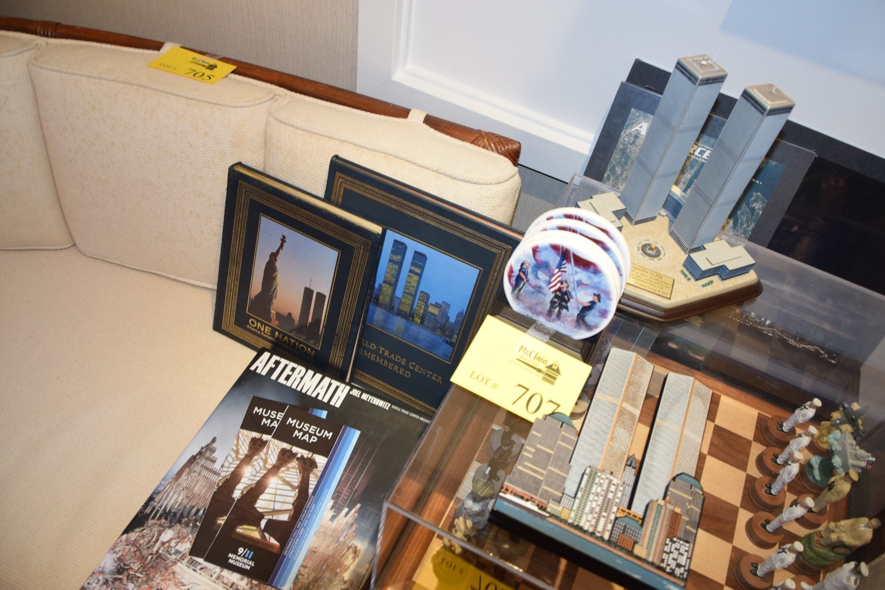 COLLECTION OF 9/11 MEMORABILIA: FRAMED PRINT, STAMPS, BOOKS, COASTERS & MINI MODEL OF THE TOWERS (8 PCS)