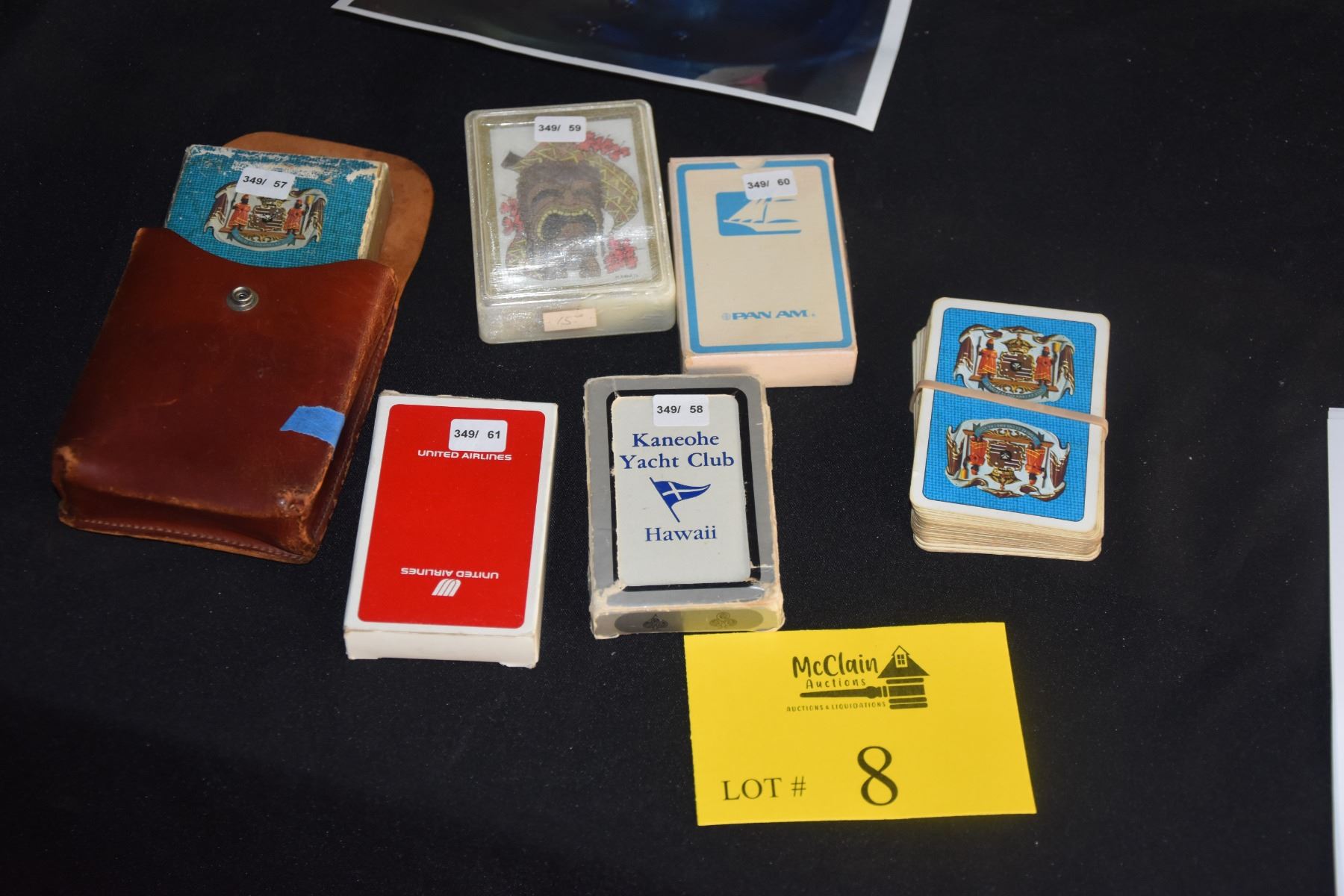 COLLECTION OF ASSORTED PLAYING CARDS & LEATHER POUCH (PAN AM, KANEOHE YACHT CLUB, UNITED AIRLINES, ETC.) (6 DECKS)