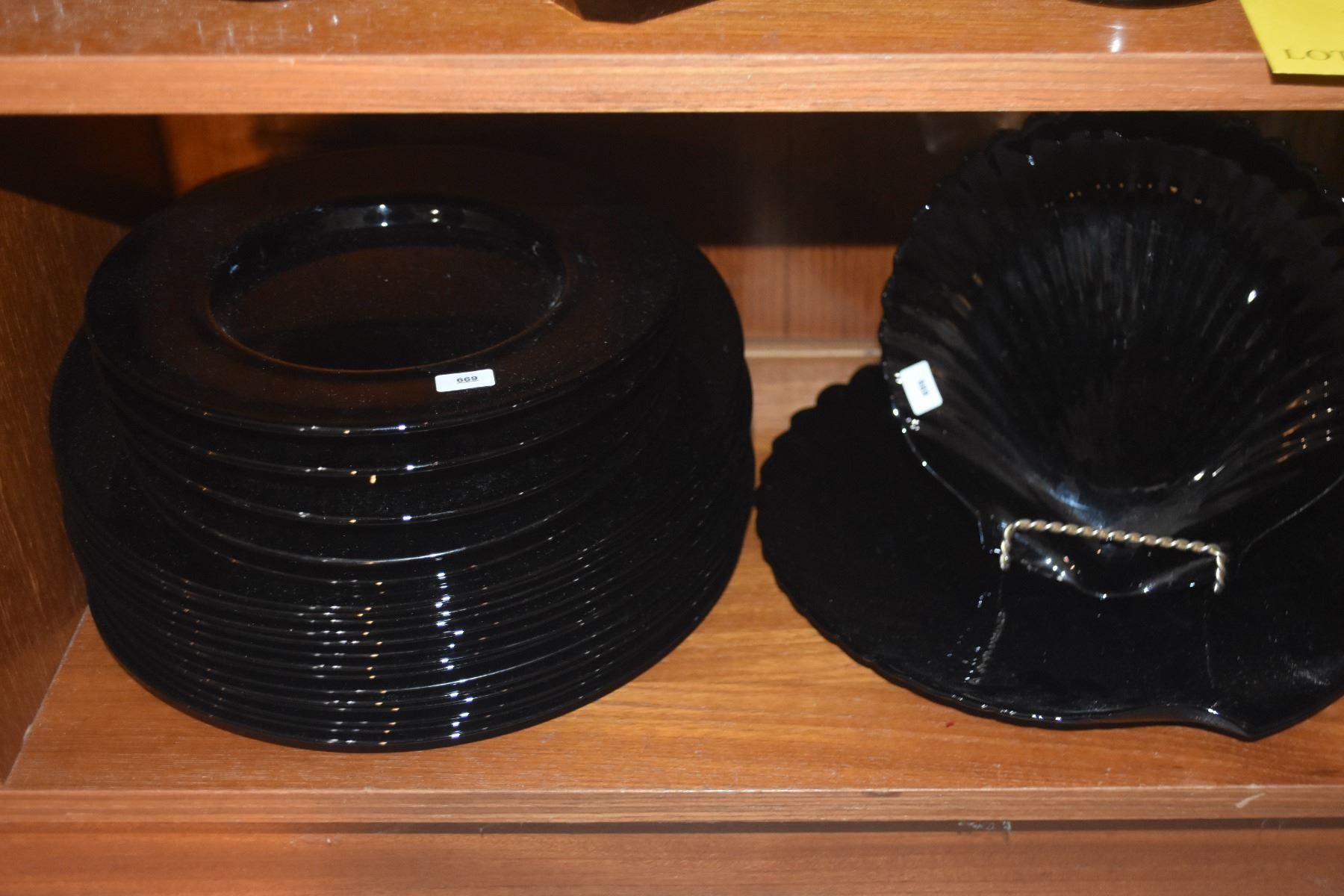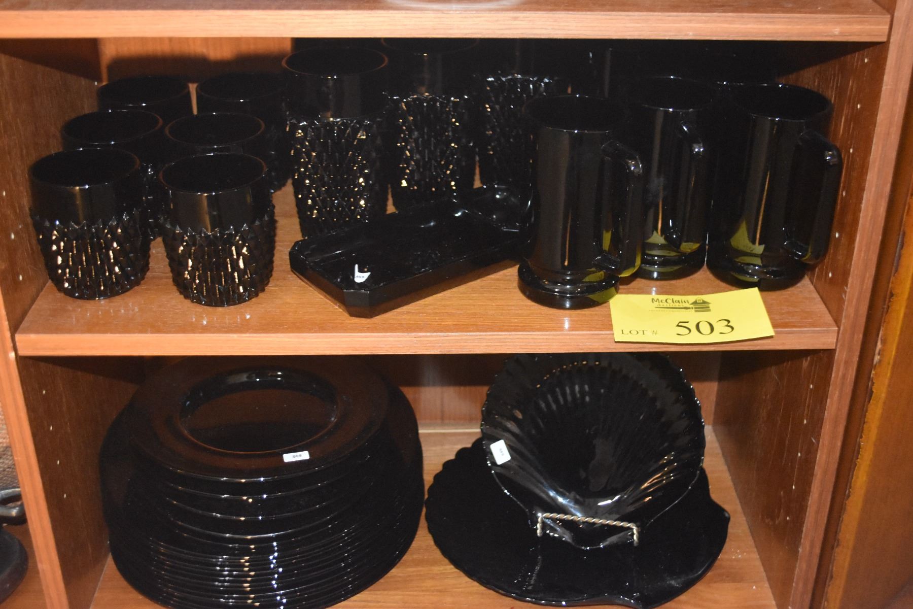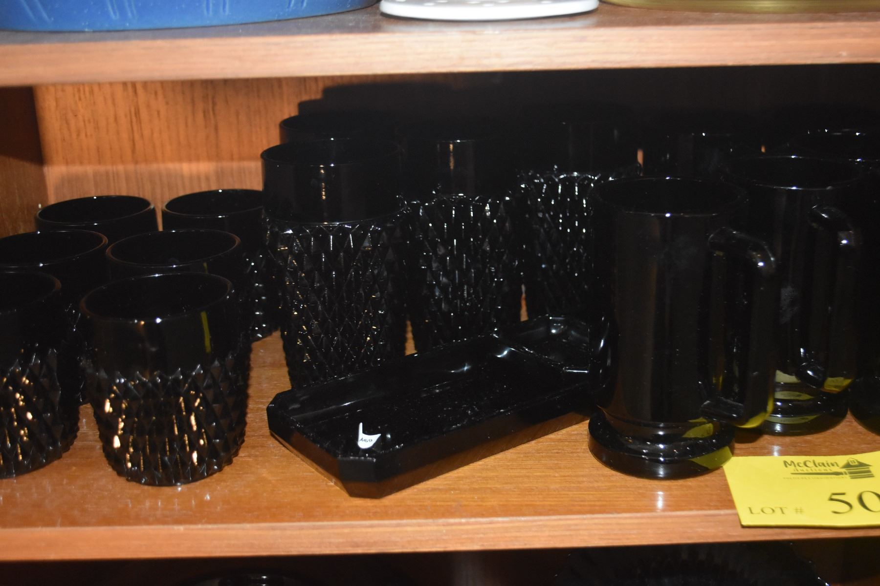 COLLECTION OF BLACK GLASS PLATES, MUGS & GLASSES (38 PCS) (DOES NOT INCLUDE STAND)