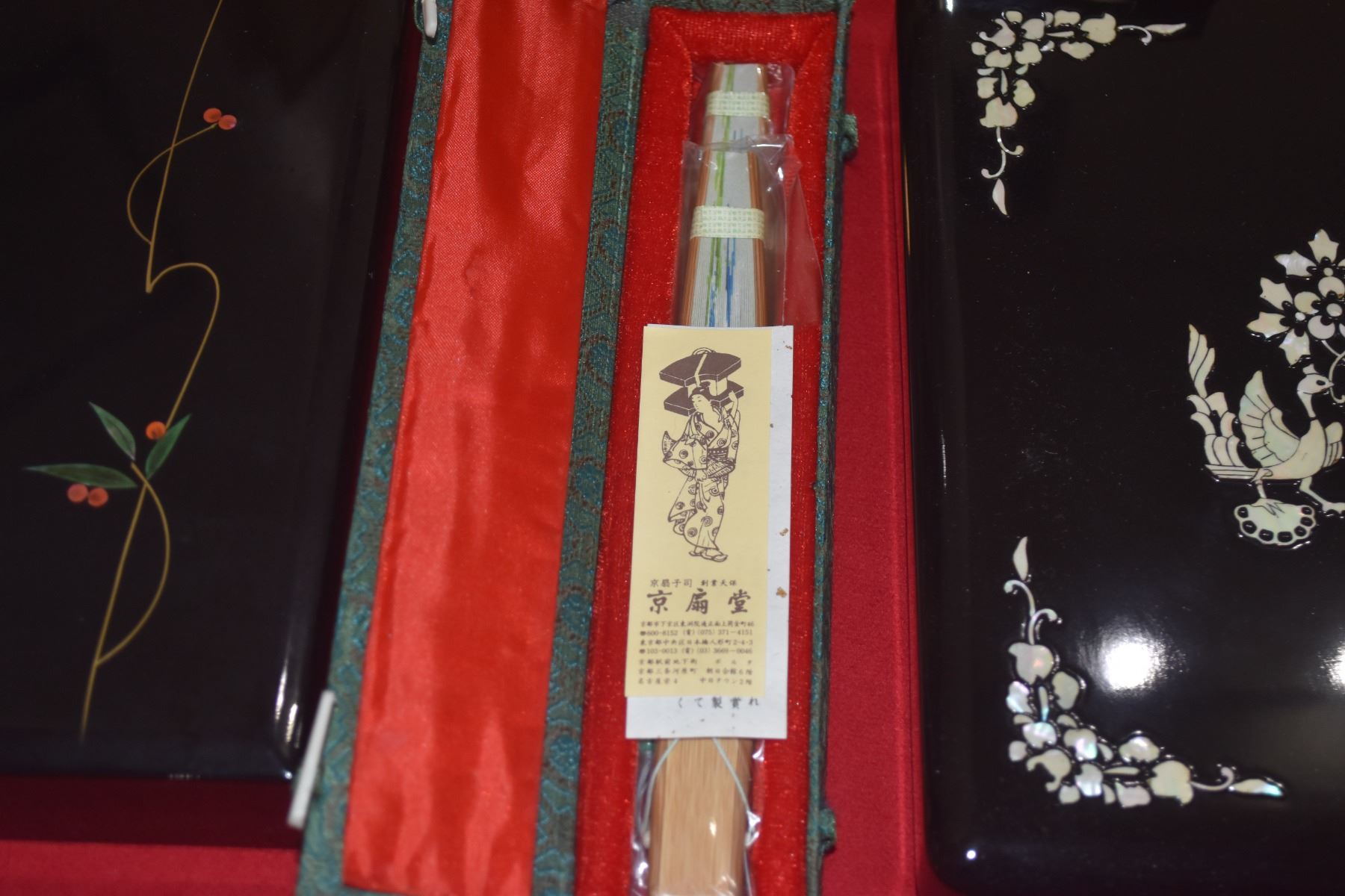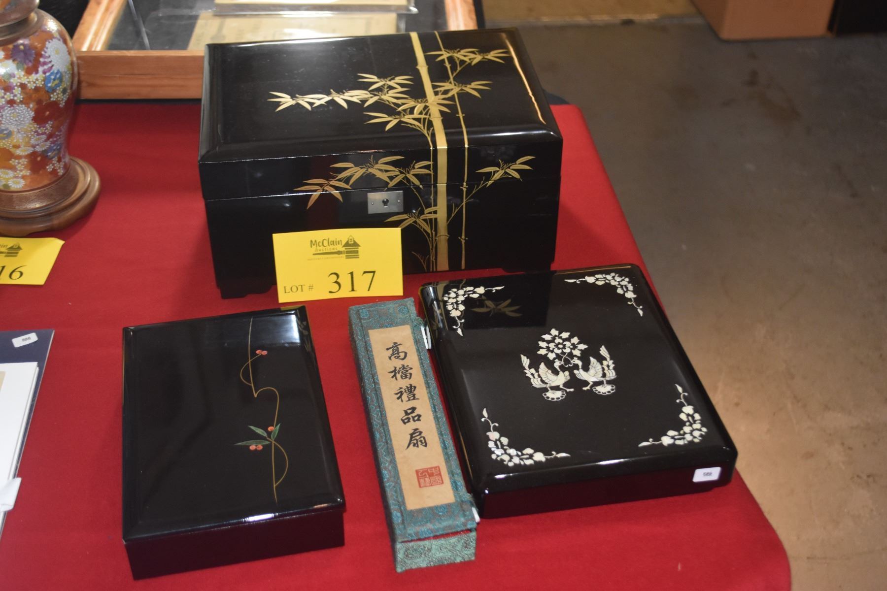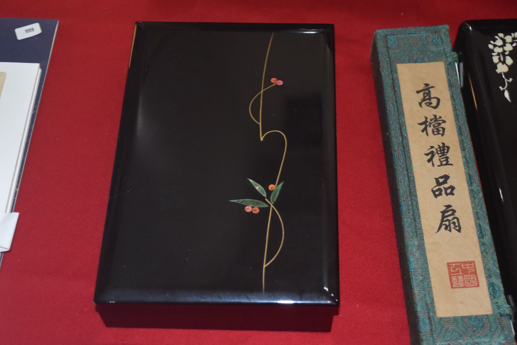 COLLECTION OF BLACK LACQUER BOXES (STORAGE & JEWELRY) & BOXED SET W/2 FANS