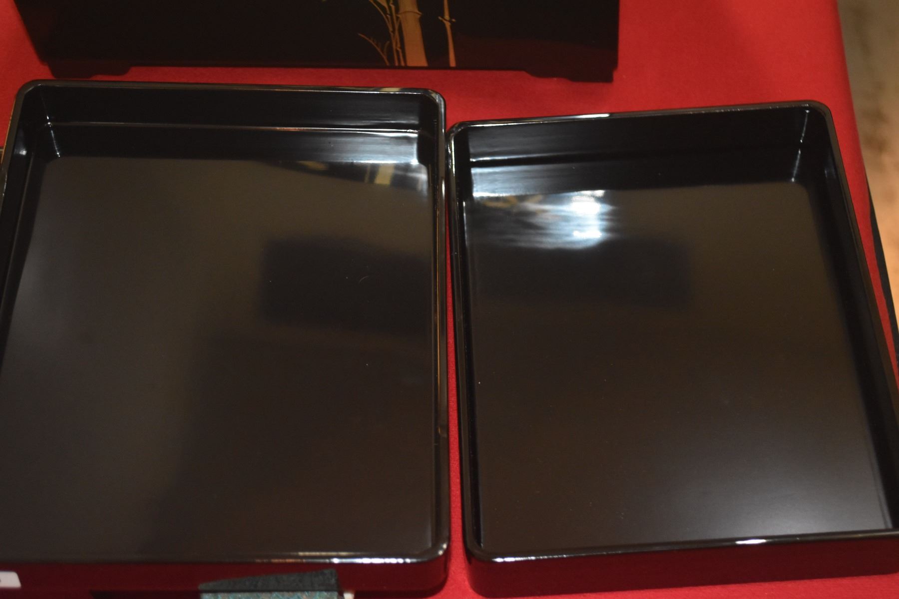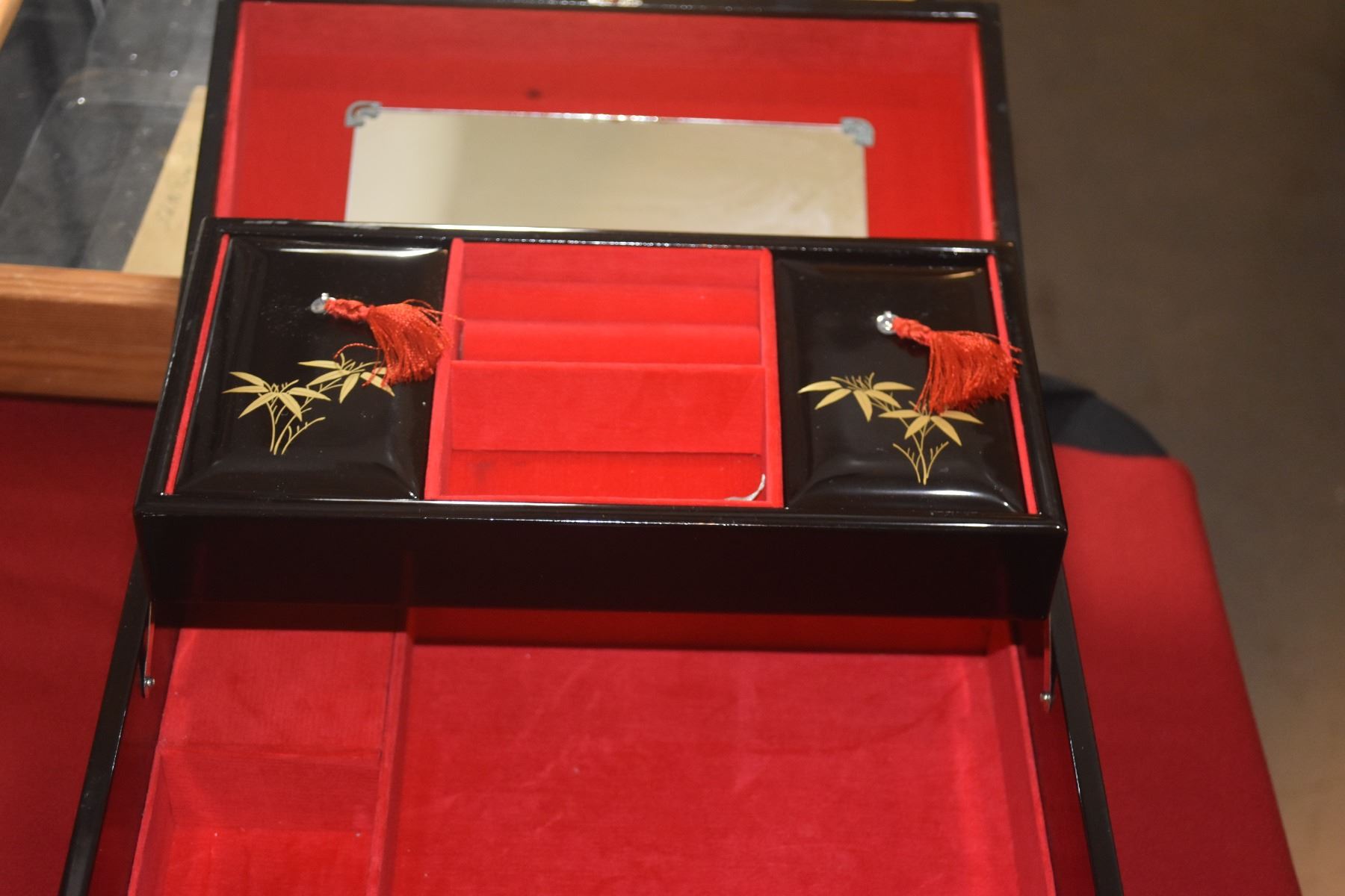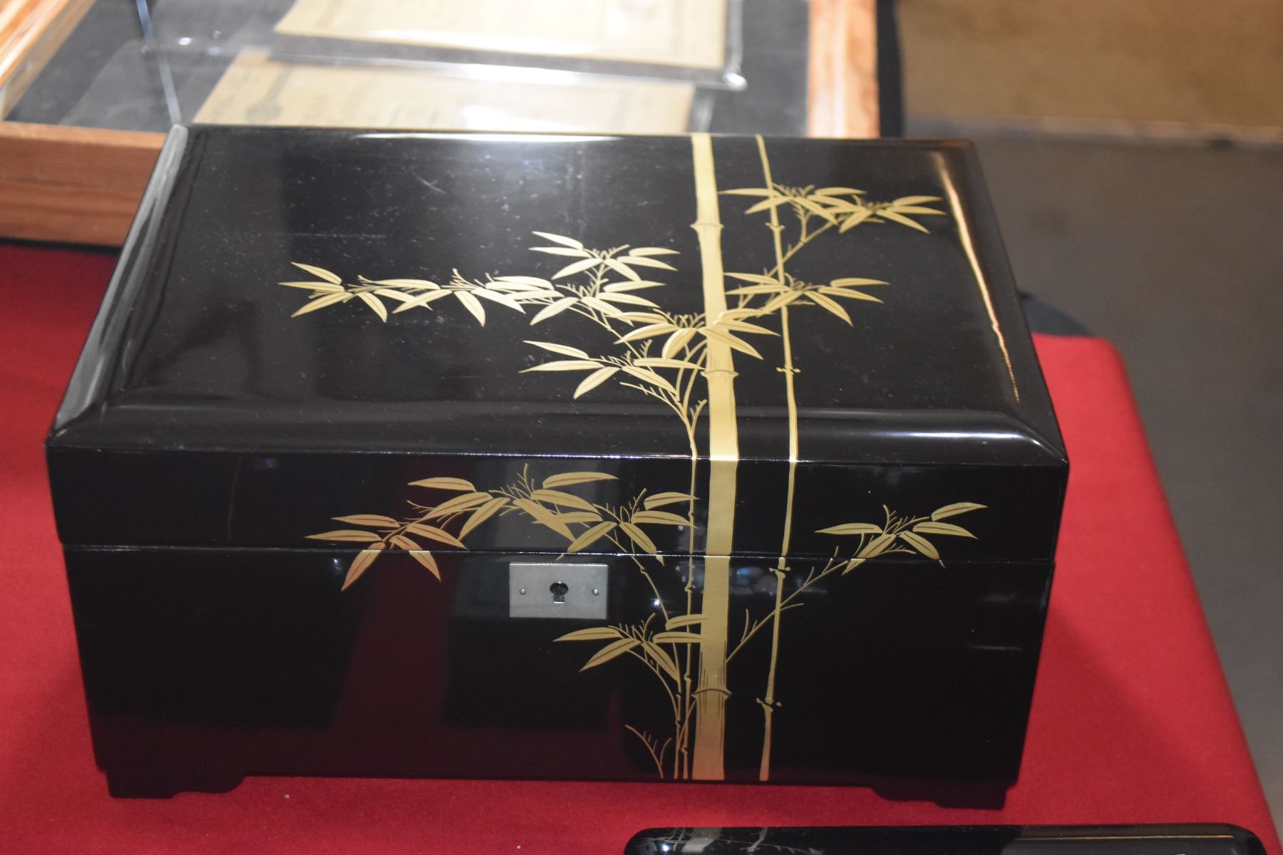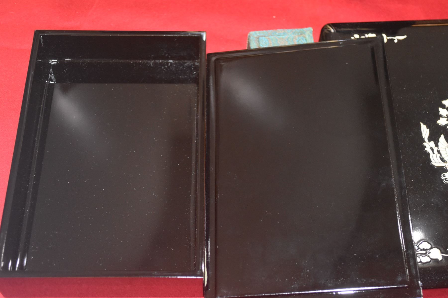 COLLECTION OF BLACK LACQUER BOXES (STORAGE & JEWELRY) & BOXED SET W/2 FANS