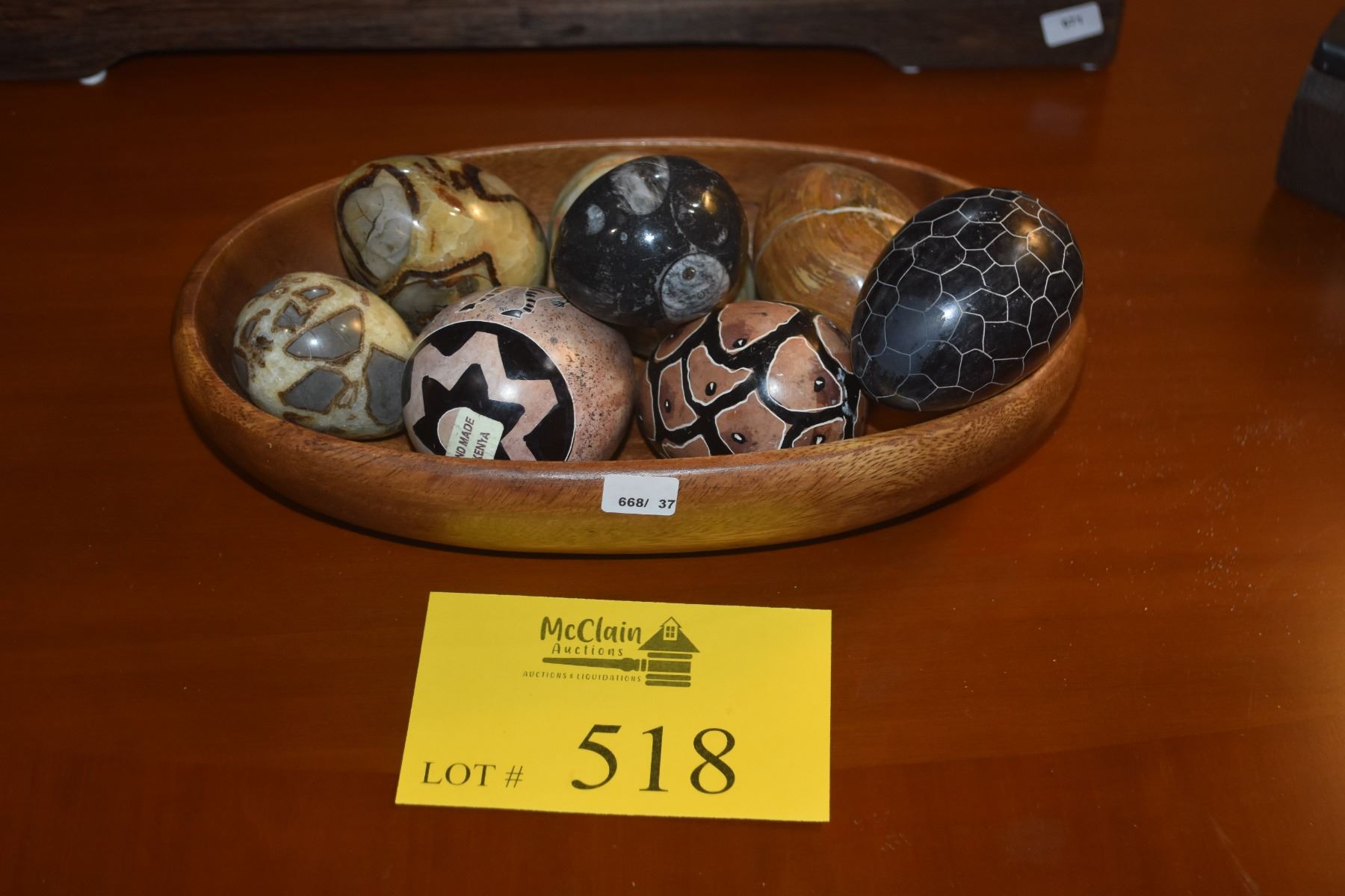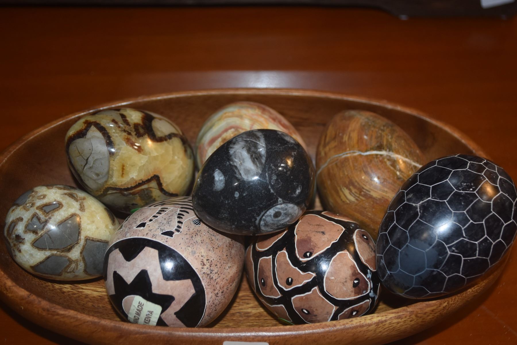 COLLECTION OF EGGS IN MONKEYPOD WOOD BOWL (9 PCS)