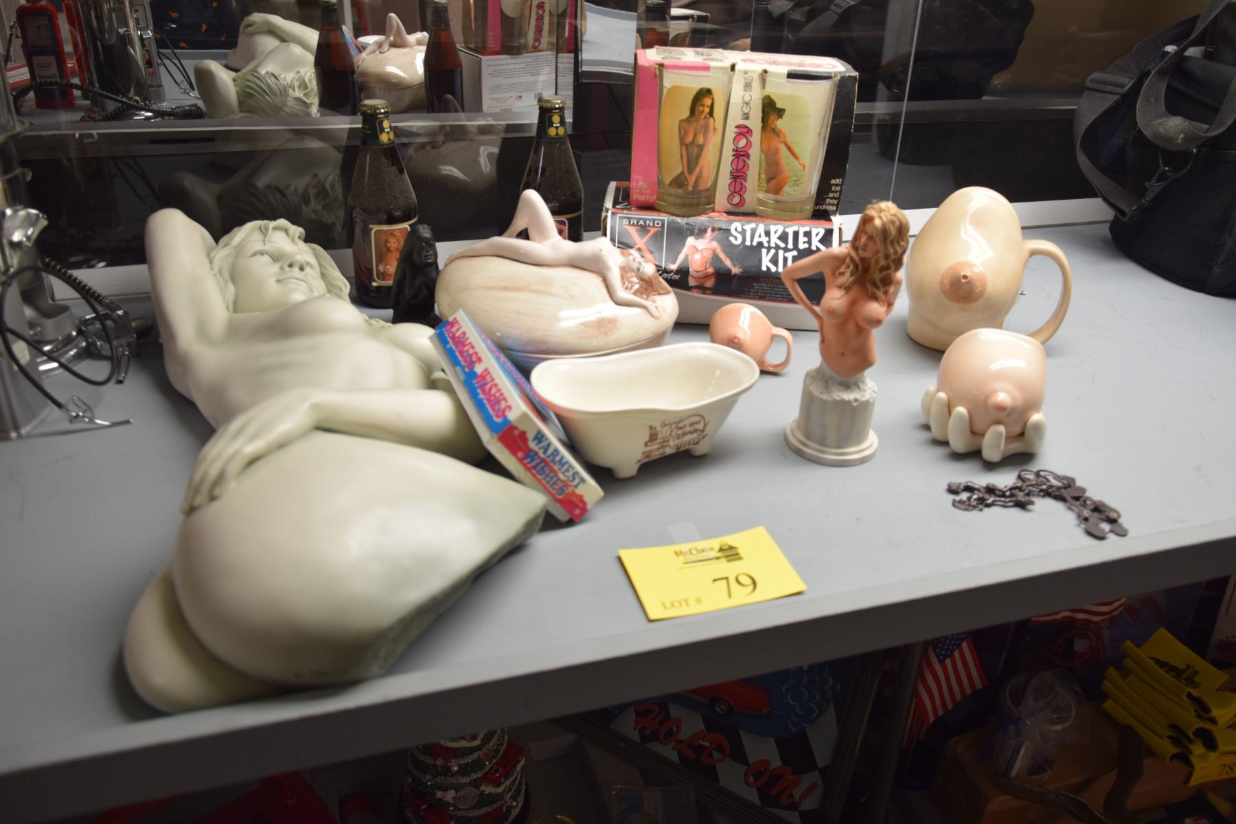 COLLECTION OF EROTICA: GLASSES, CUPS, BEER BOTTLES, COVERED DISH, NUDE FIGURE, KEY CHAINS, ETC. (15
