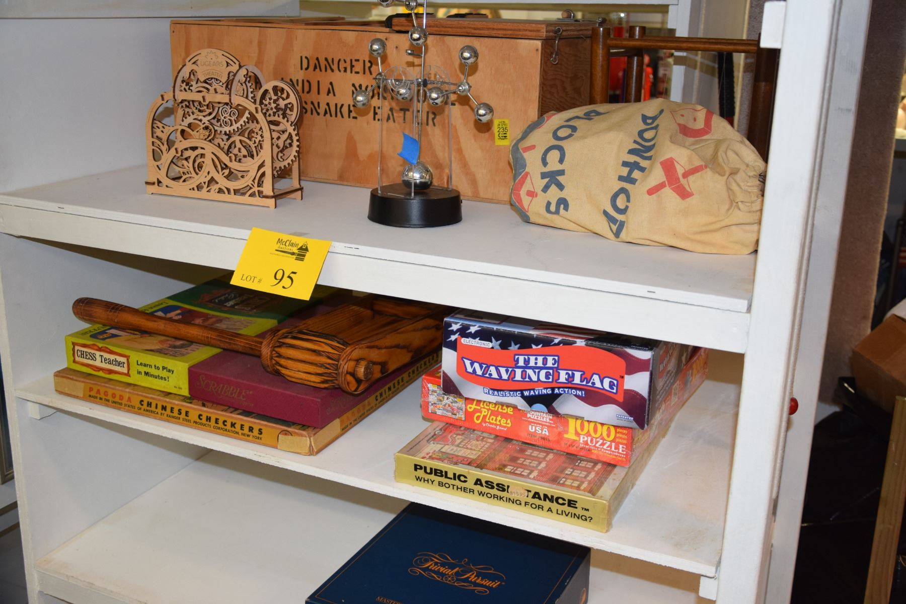 COLLECTION OF GAMES, PUZZLES & TOYS: CHINESE CHECKERS, CHESS, SCRABBLE, TRIVIAL PURSUIT, BONHOP BLOCKS, KINETIC TOYS, ETC. (13 PCS)