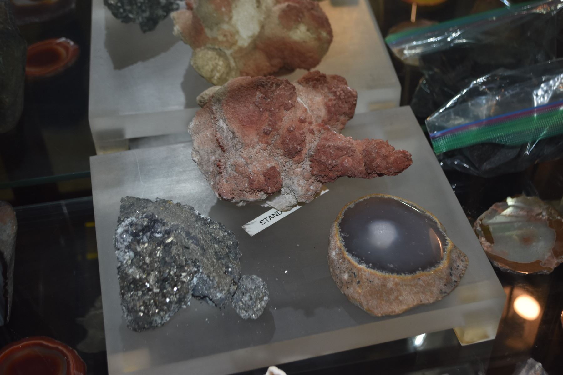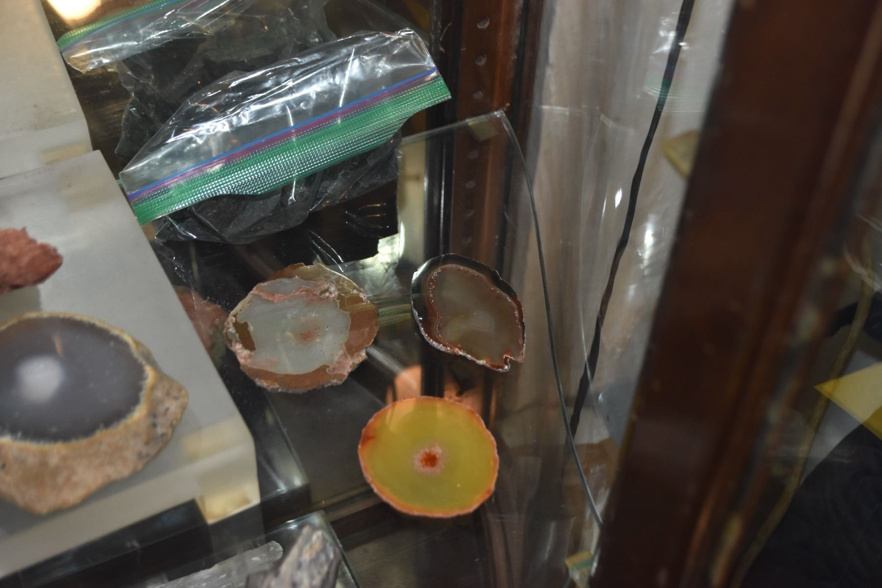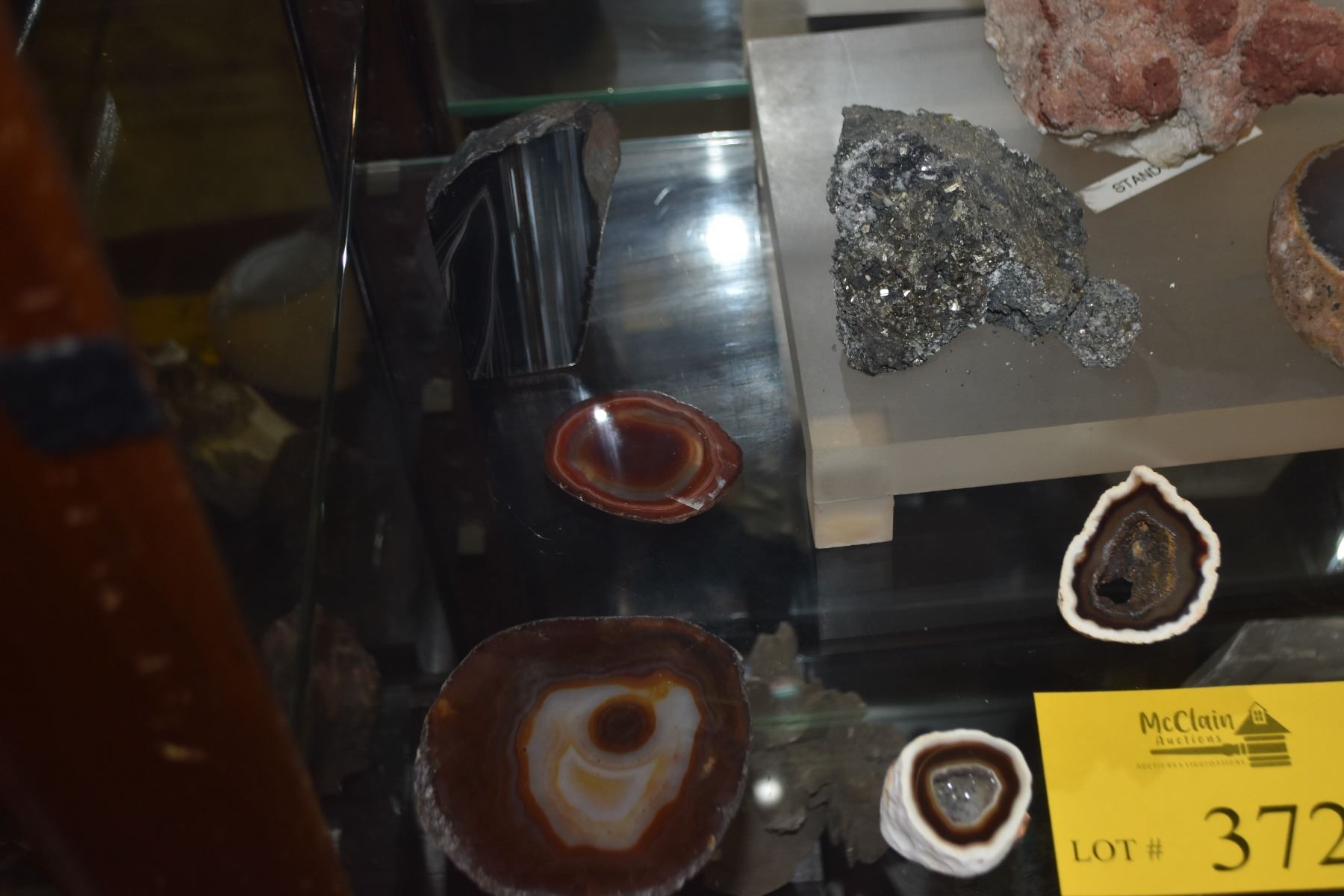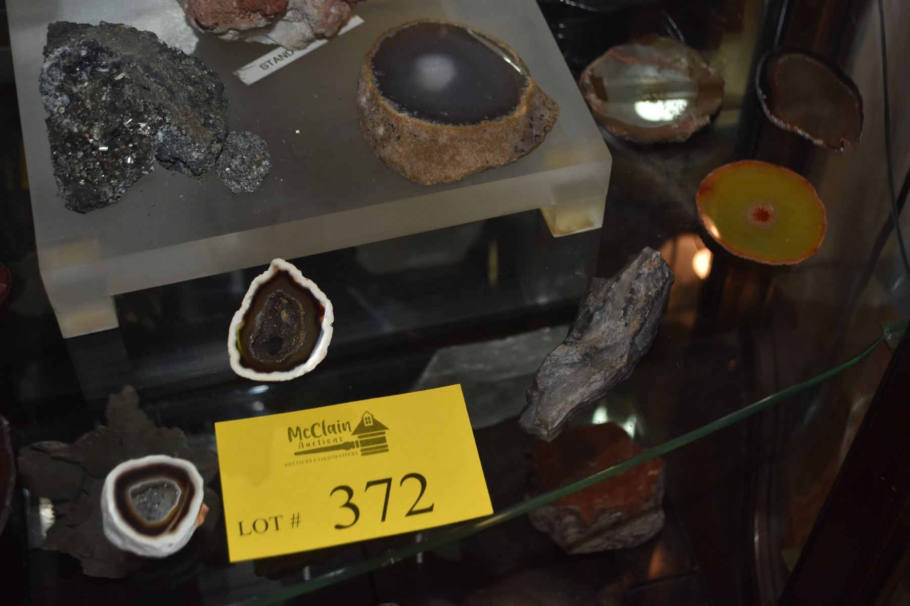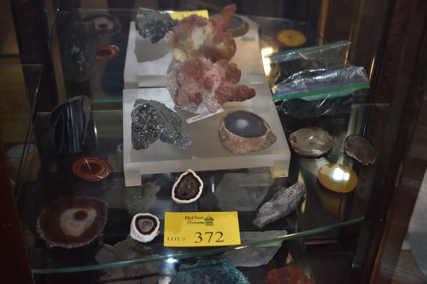 COLLECTION OF GEODE, SLABS, FOSSILIZED WOOD & MINERAL SPECIMENS (DOES NOT INCLUDE STAND)