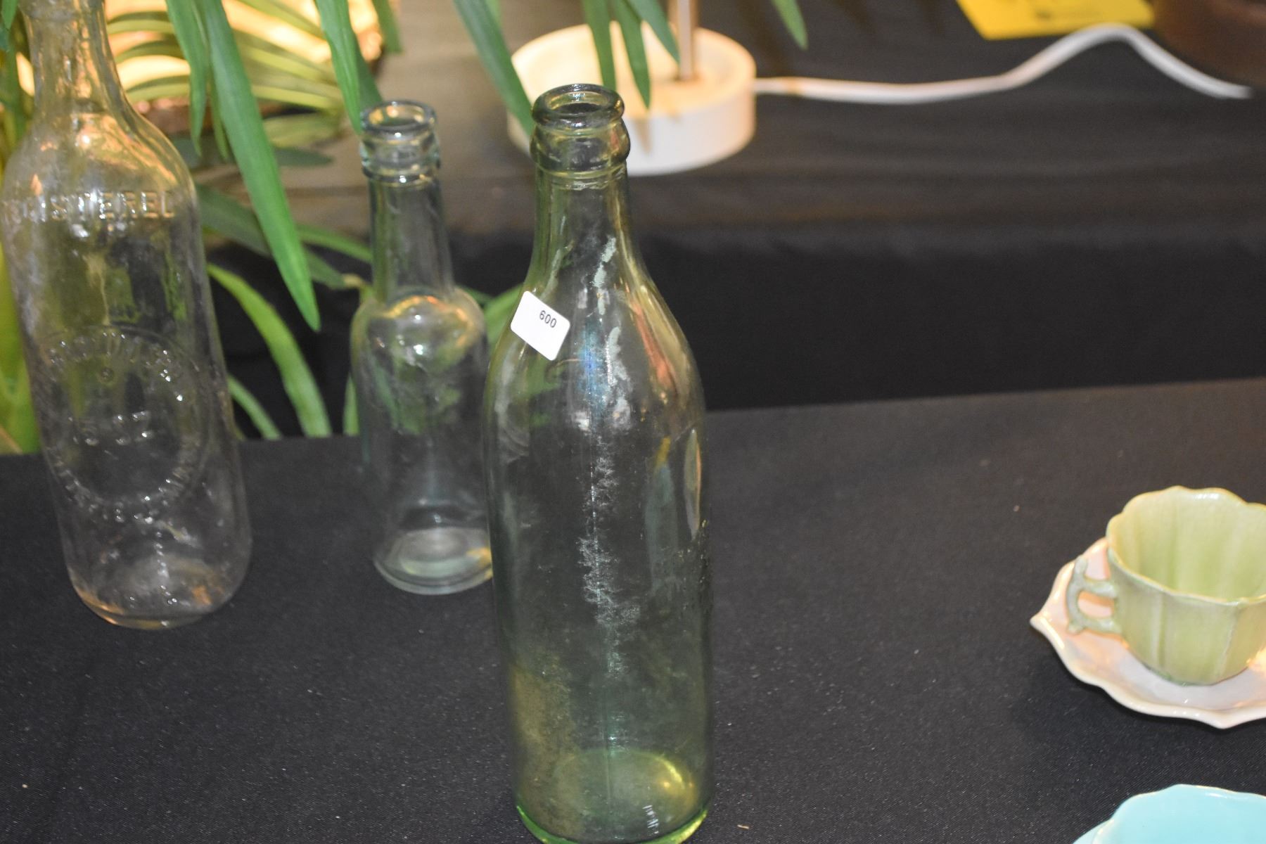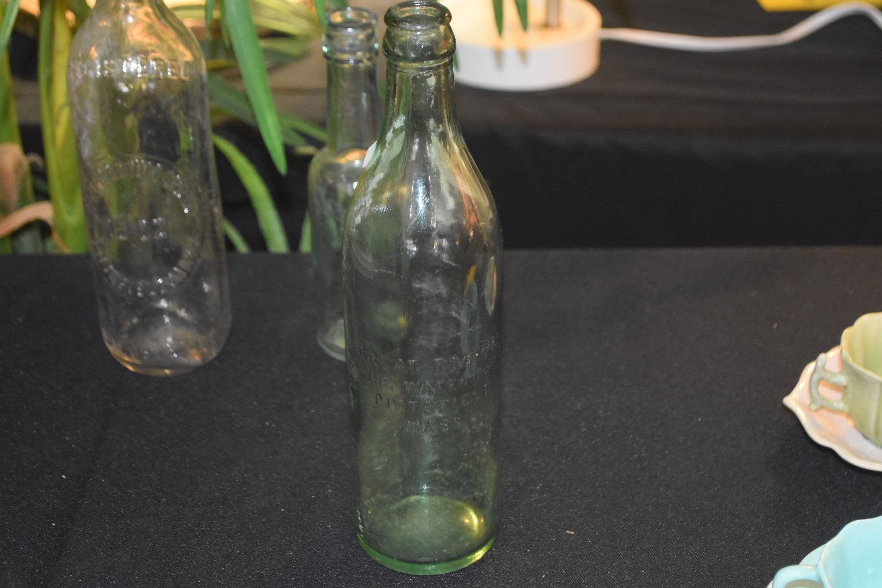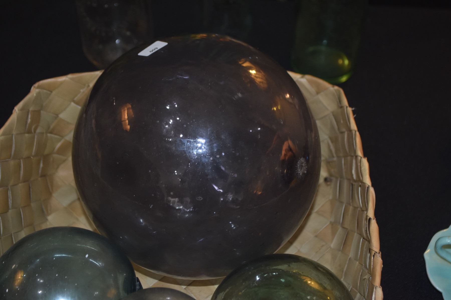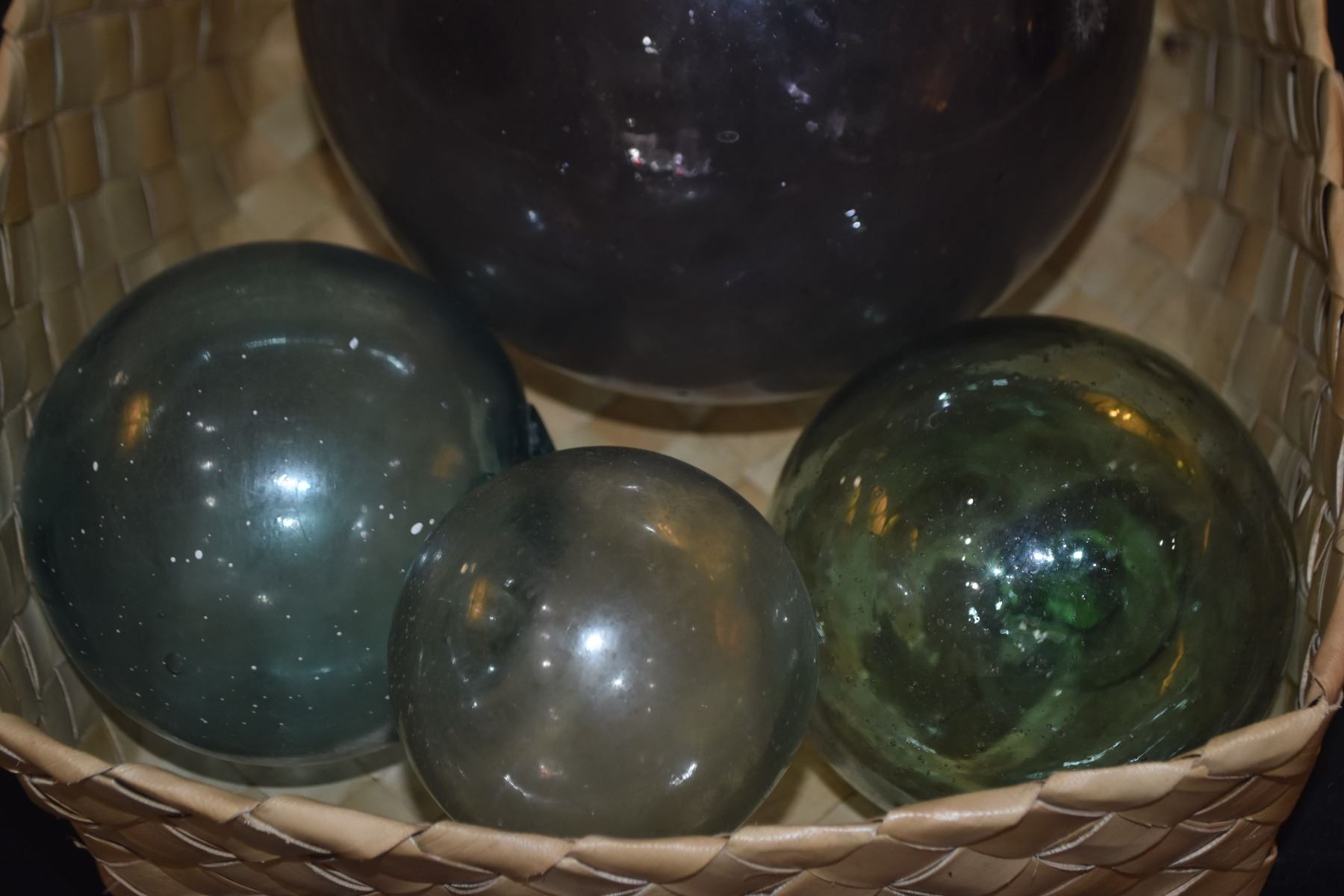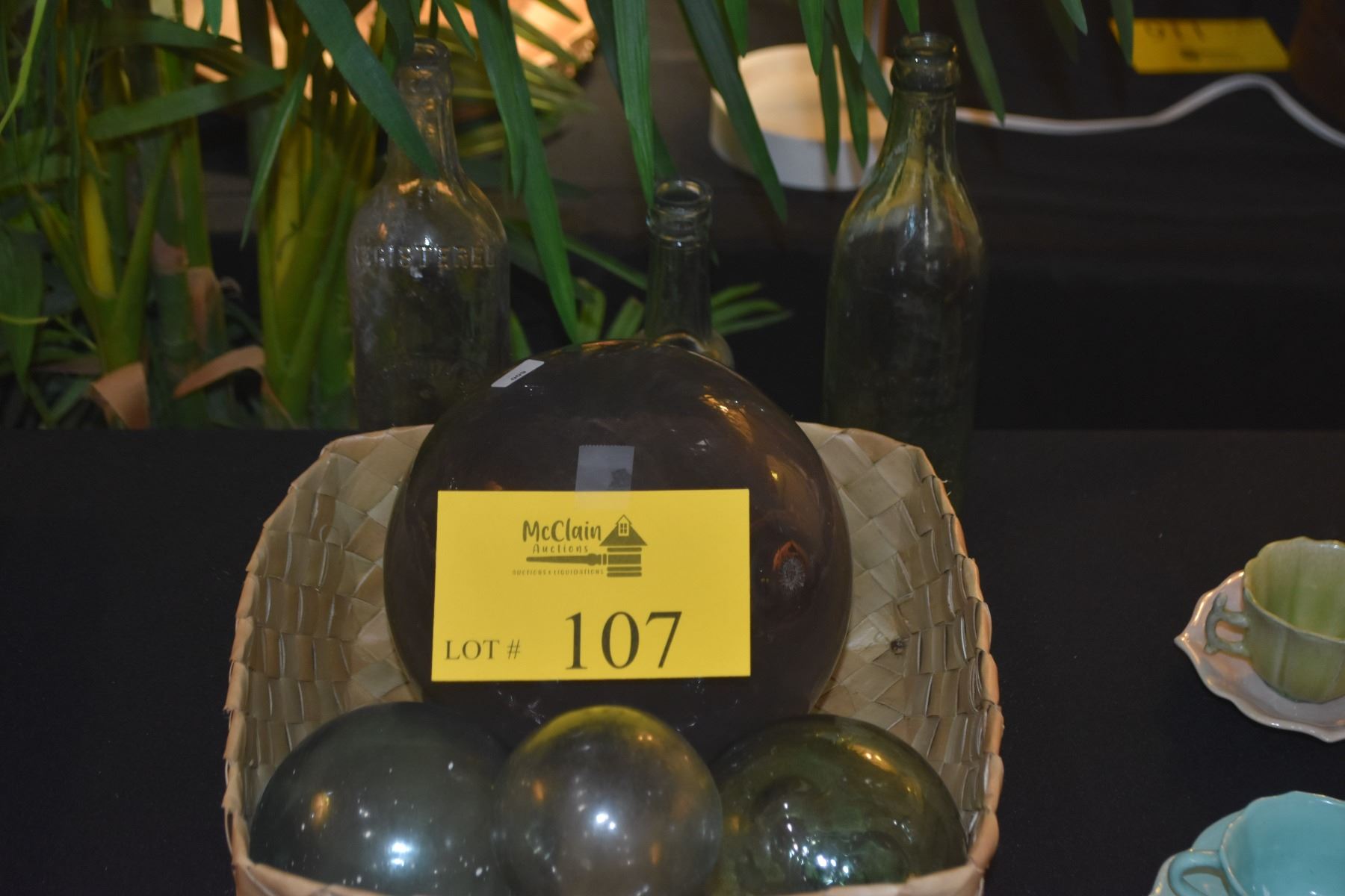 COLLECTION OF GLASS FISHING FLOATS & BOTTLES (7 PCS) (DOES NOT INCLUDE BASKET)