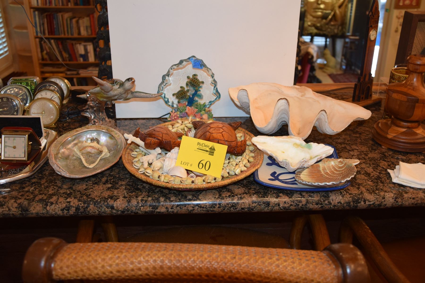 COLLECTION OF MARINE THEMED DECOR: SHELLS, TURTLE FIGURES & ILLUMINATED TURTLE SCULPTURE (37 PCS)