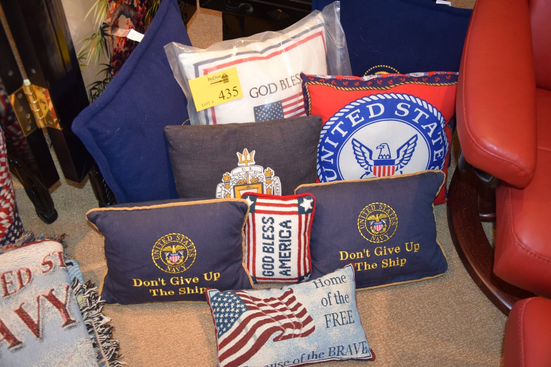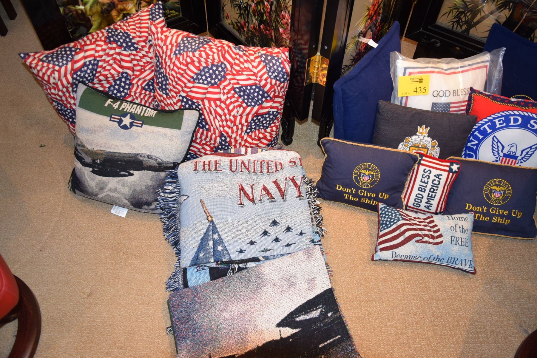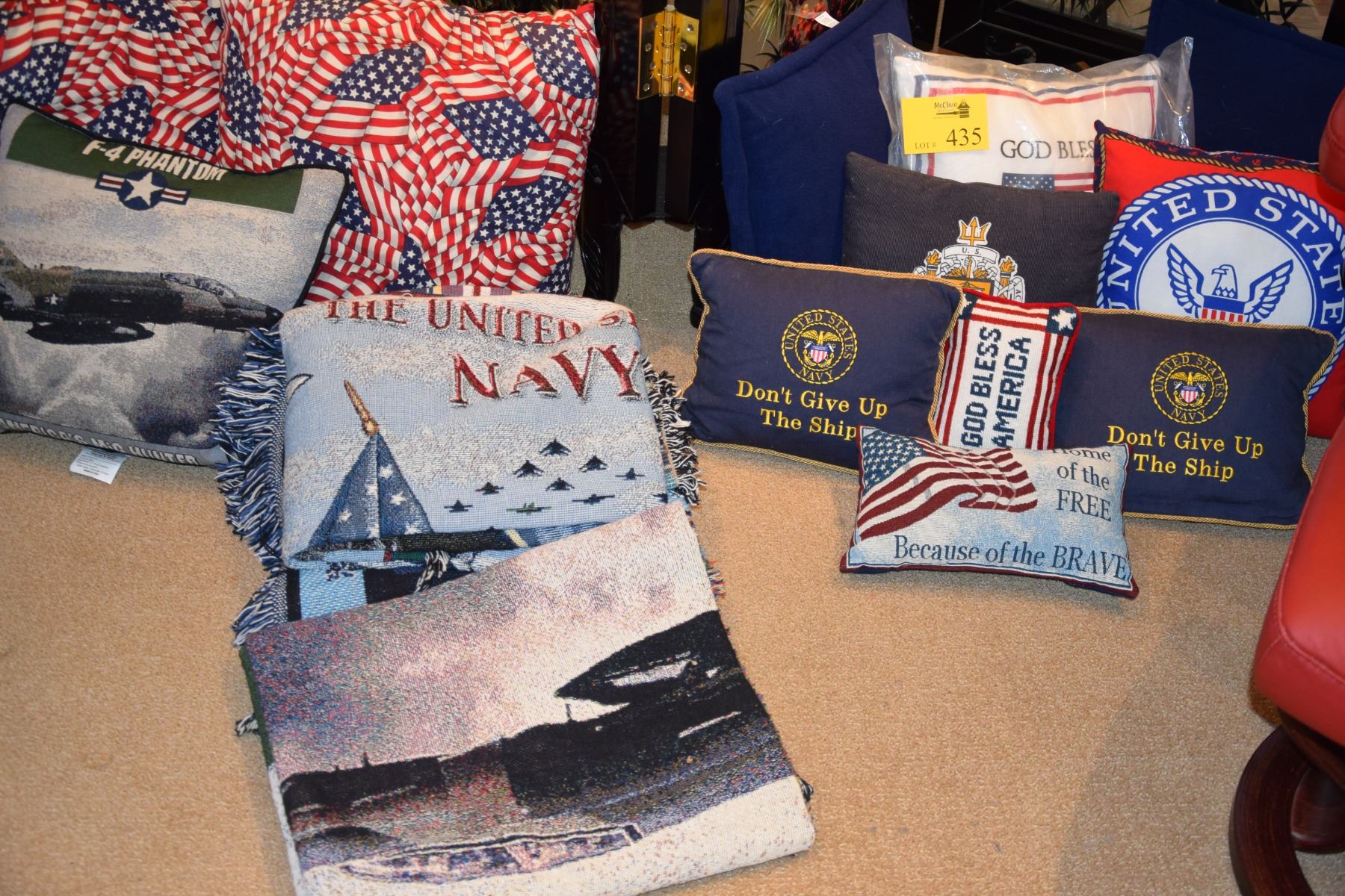 COLLECTION OF PILLOW & BLANKETS, EACH WITH MILITARY LOGOS OR SLOGANS (16 PCS)