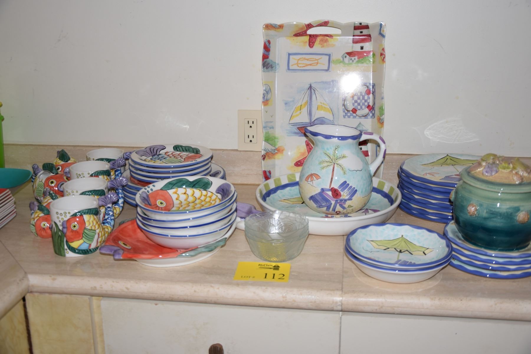 COLLECTION OF PLATES, BOWLS, PLATTERS, CUPS, TRAYS, ETC. W/FISH & BEACH MOTIF