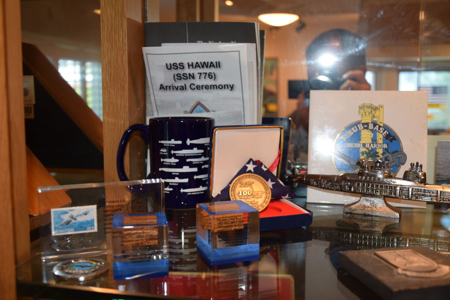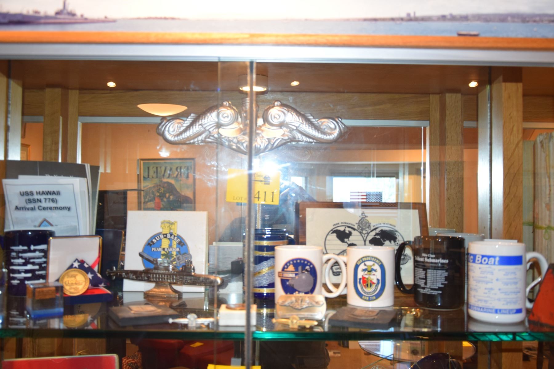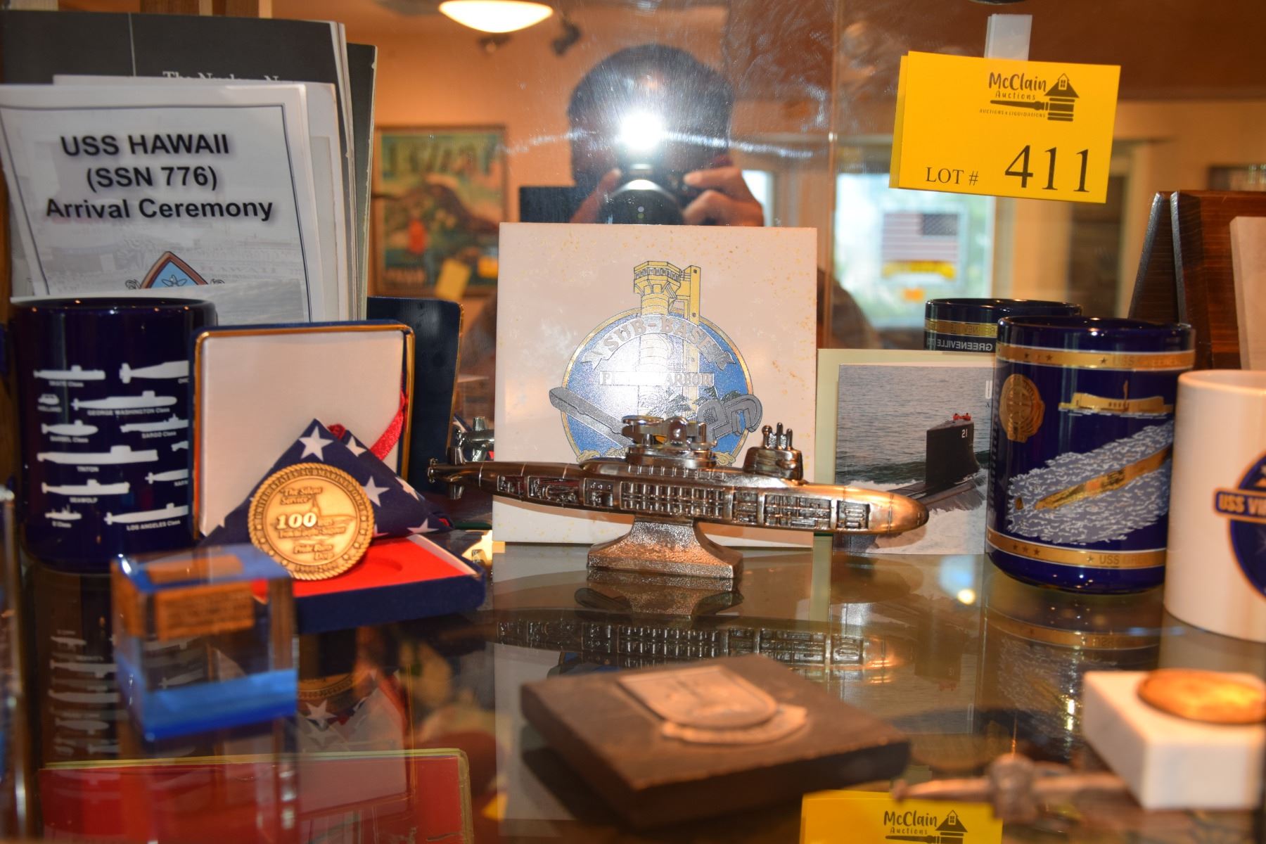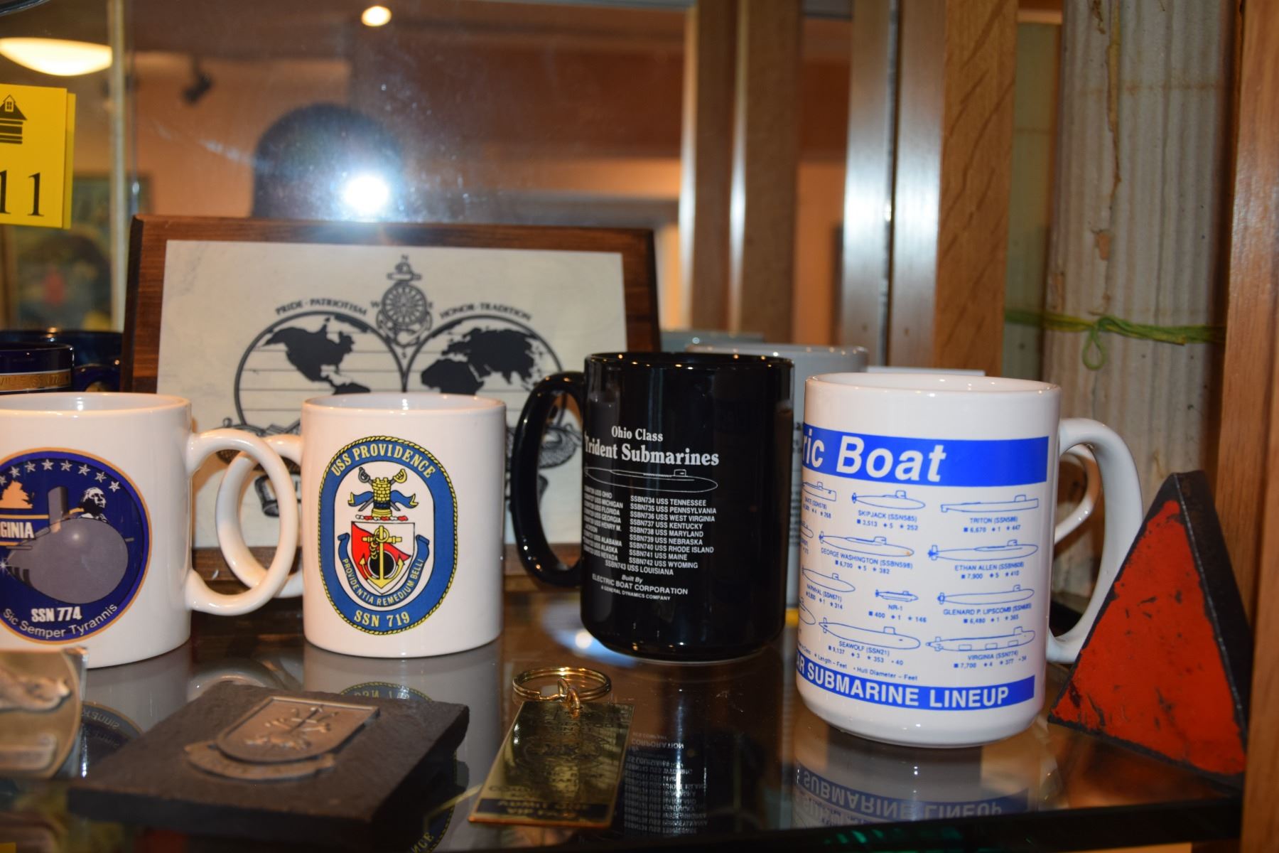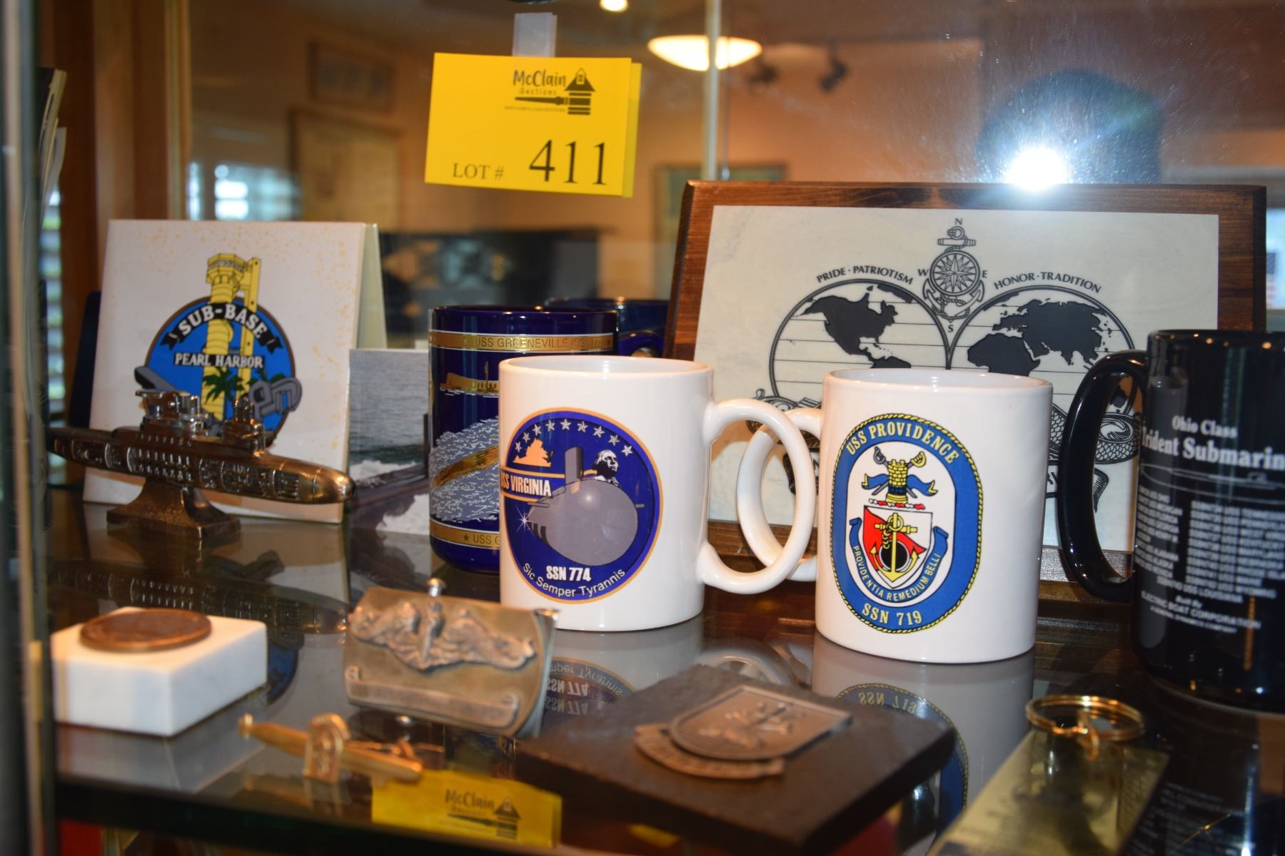 COLLECTION OF SUBMARINE MEMORABILIA: CUPS, PLAQUES, TIE TACS, BELT BUCKLES KEYCHAIN, ETC. (24 PCS)