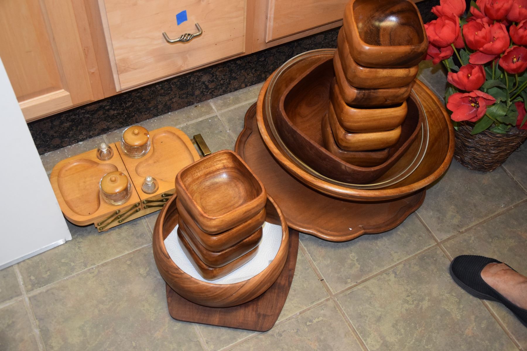 COLLECTION OF WOOD BOWLS, LAZY SUSAN, TRAY, ETC. (16 PCS)