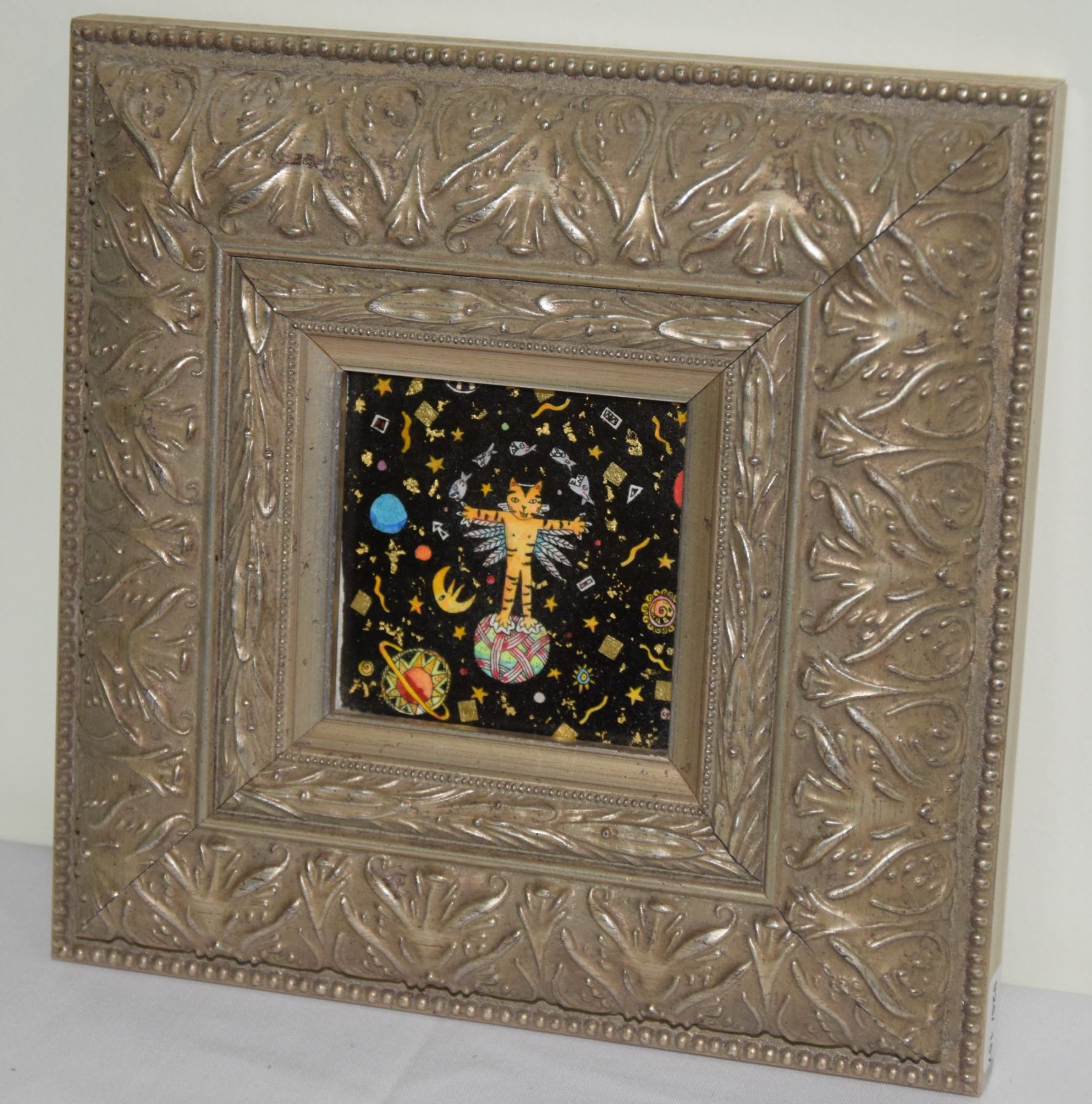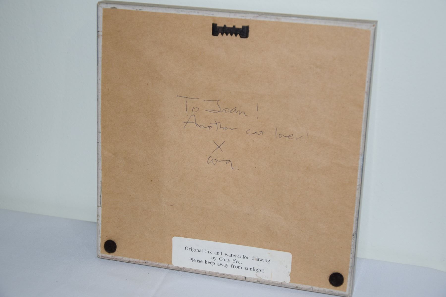 CORA YEE INK & WATERCOLOR, "CAT LOVER"; UNSIGNED (FRAMED 7.5" X 7.5")