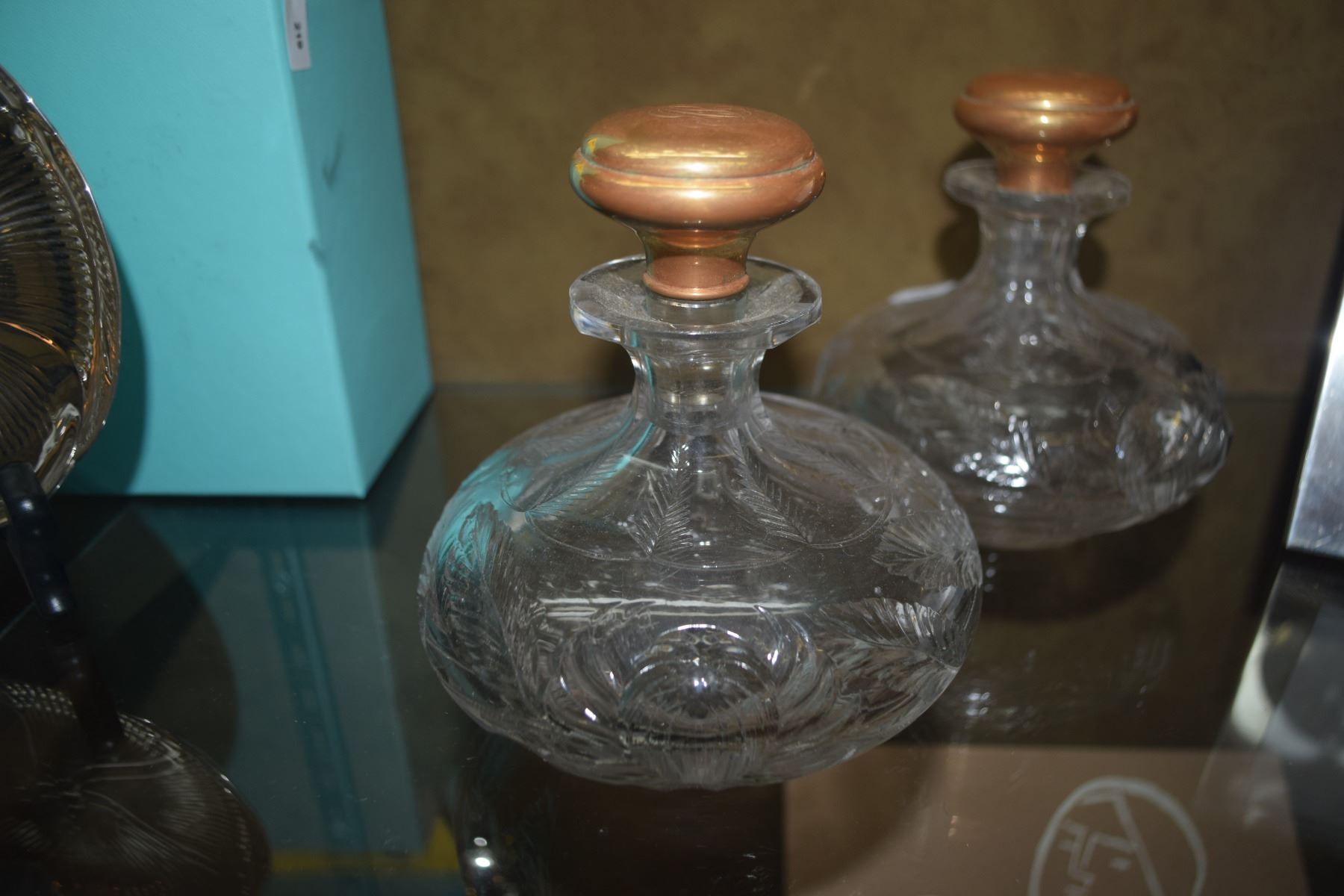 CRYSTAL SCENT BOTTLES W/14K STOPPERS, MONOGRAMMED (PAIR)