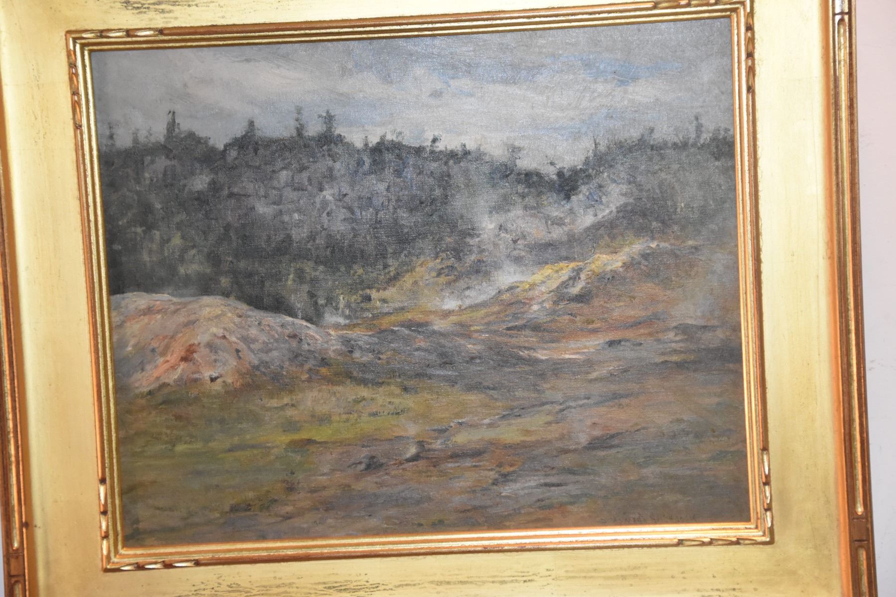 CUSTOM GOLD GILT FRAMED OIL ON CANVAS, SULPHUR BED IN VOLCANO NATIONAL PARK; SIGNED D. HOWARD HITCHCOCK, CA. EARLY 1900'S (26 1/2" X 23")
