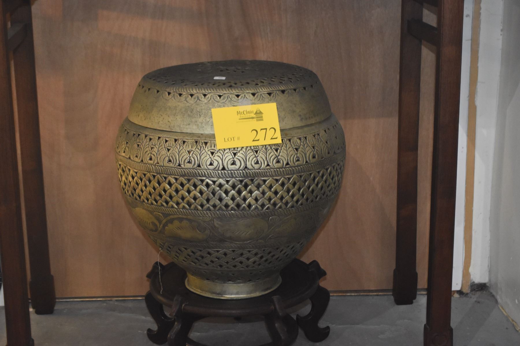 DECORATIVE BRASS COVERED CONTAINER ON STAND