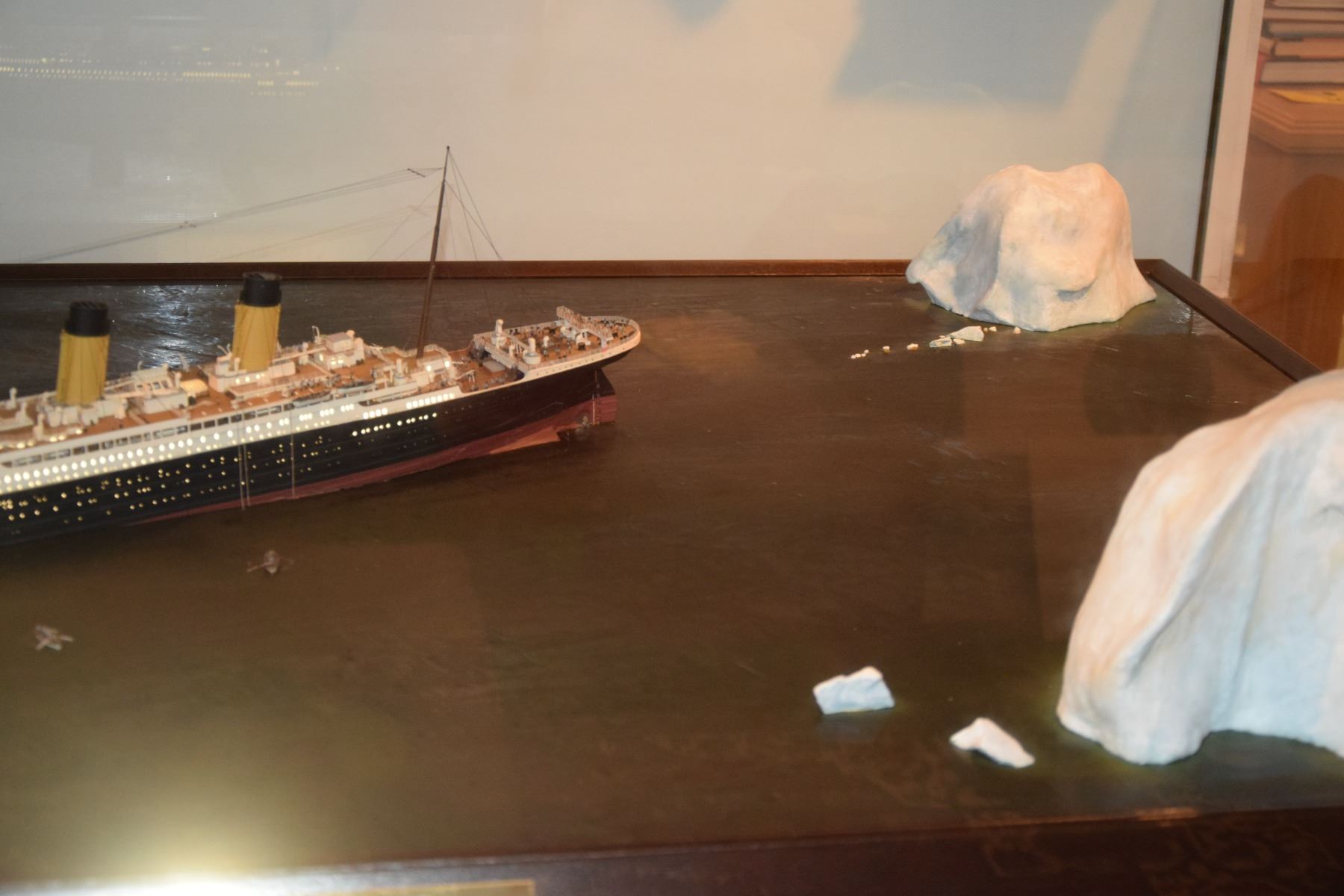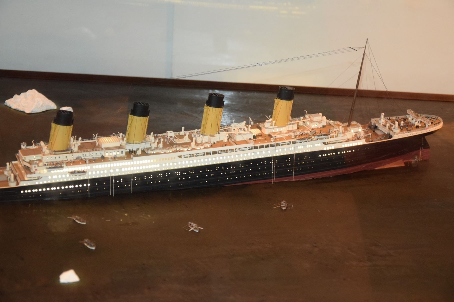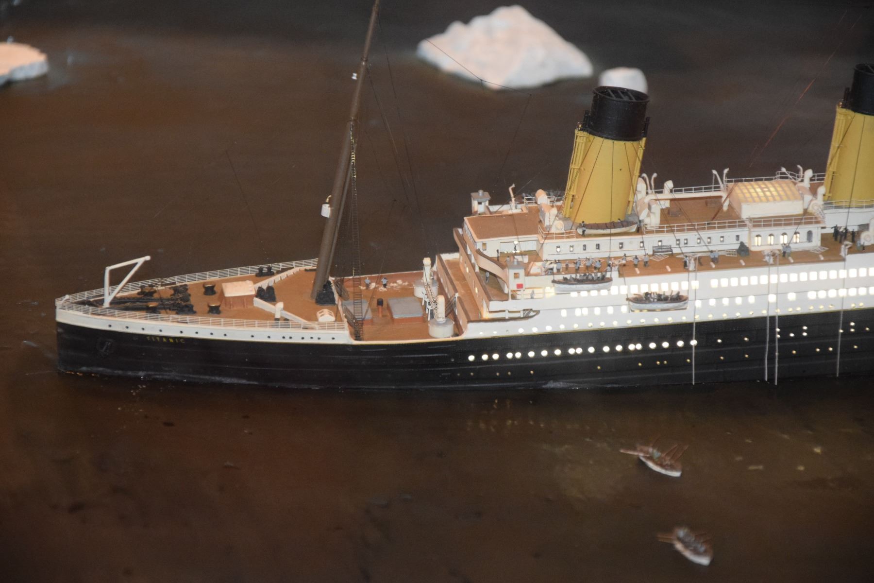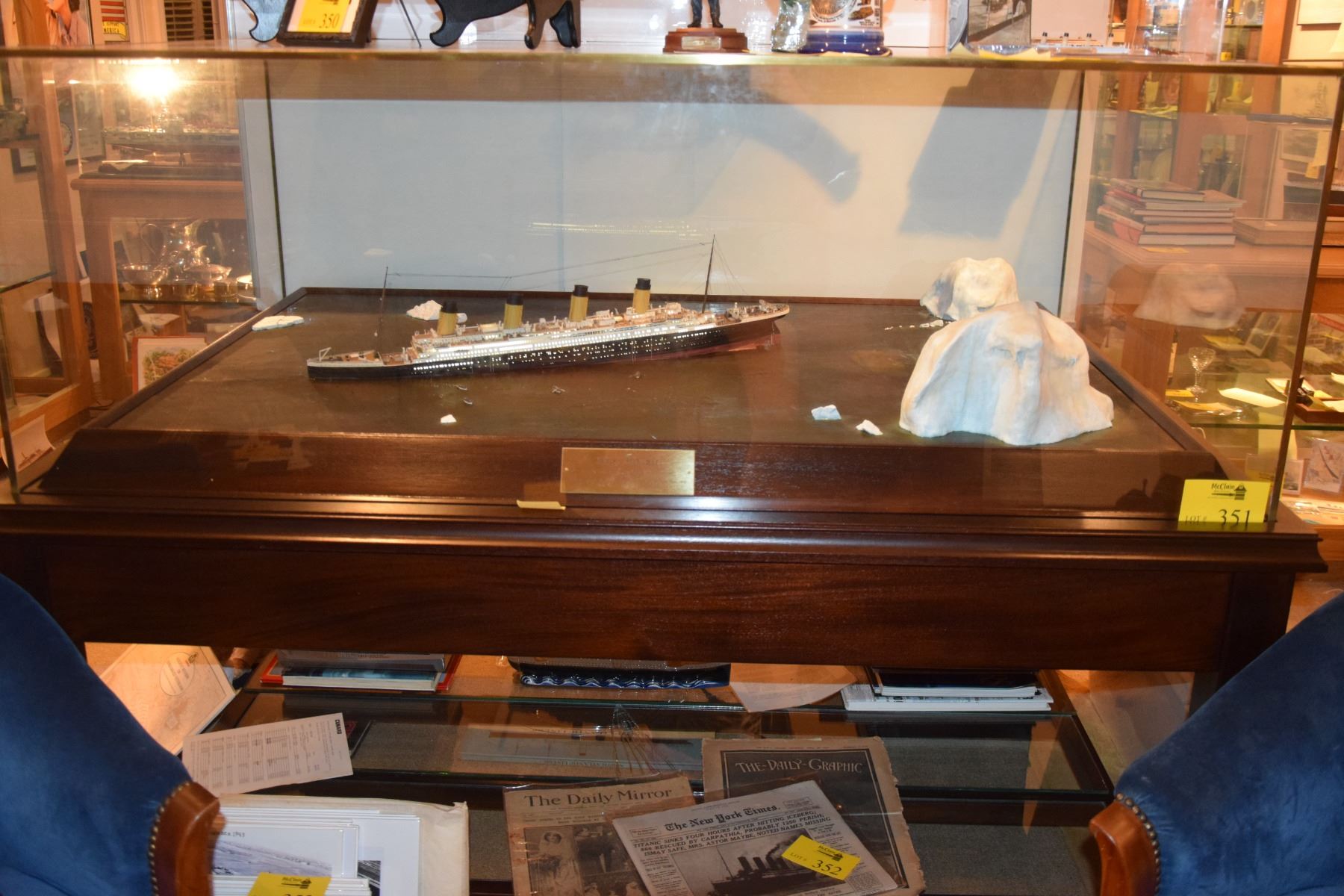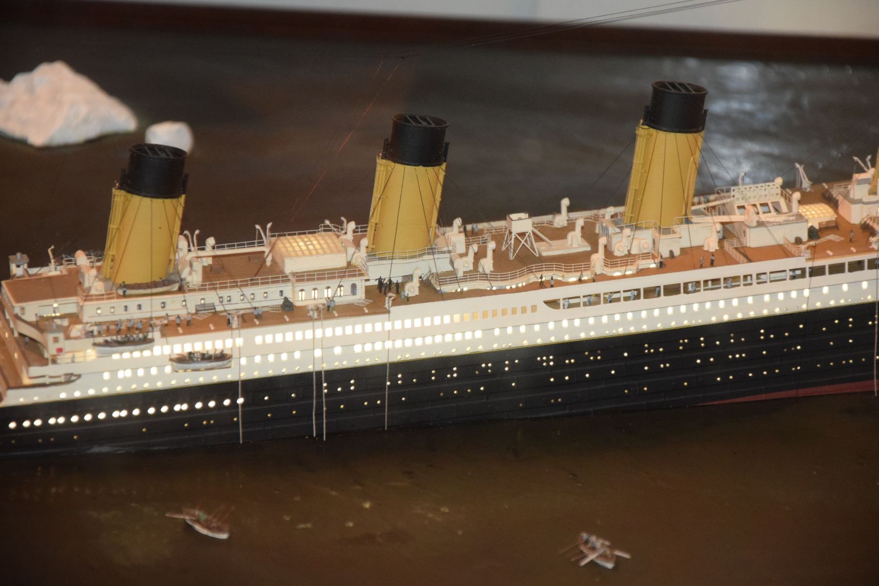 DIORAMA DEPICTING SINKING OF RMS TITANIC AT 1:30 A.M. ON 4/15/1912, 1:350 SCALE, WM & C. HITCHCOCK W/ACRYLIC CASE & STAND (40 1/2" X 64" X 52")