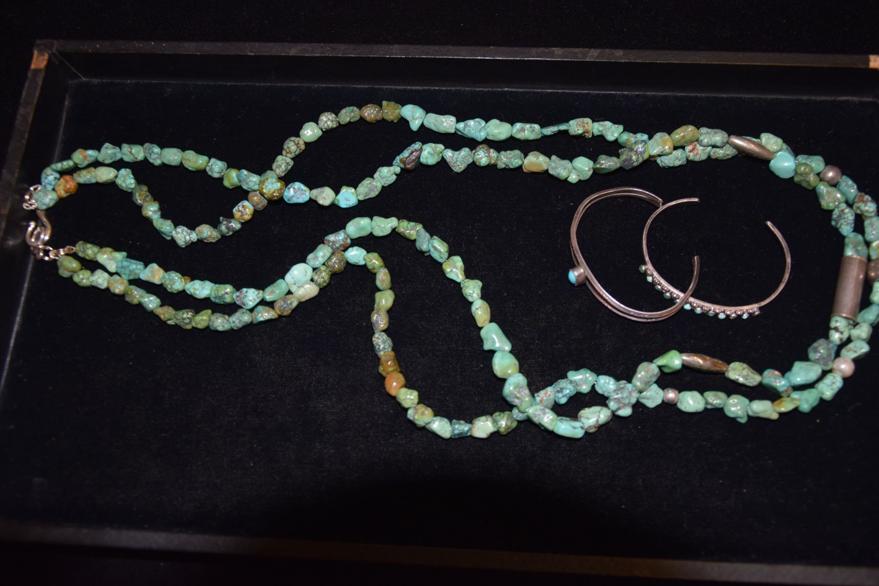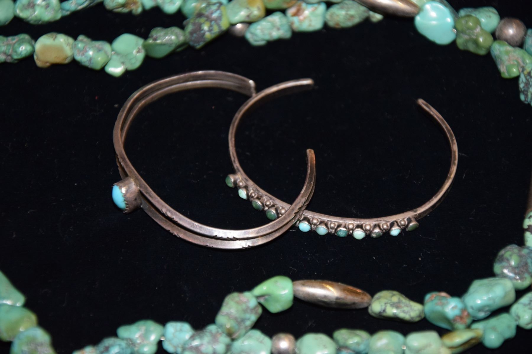 DOUBLE STAND TURQUOISE & STERLING SILVER NECKLACE & CUFF BRACELETS (3 PCS)