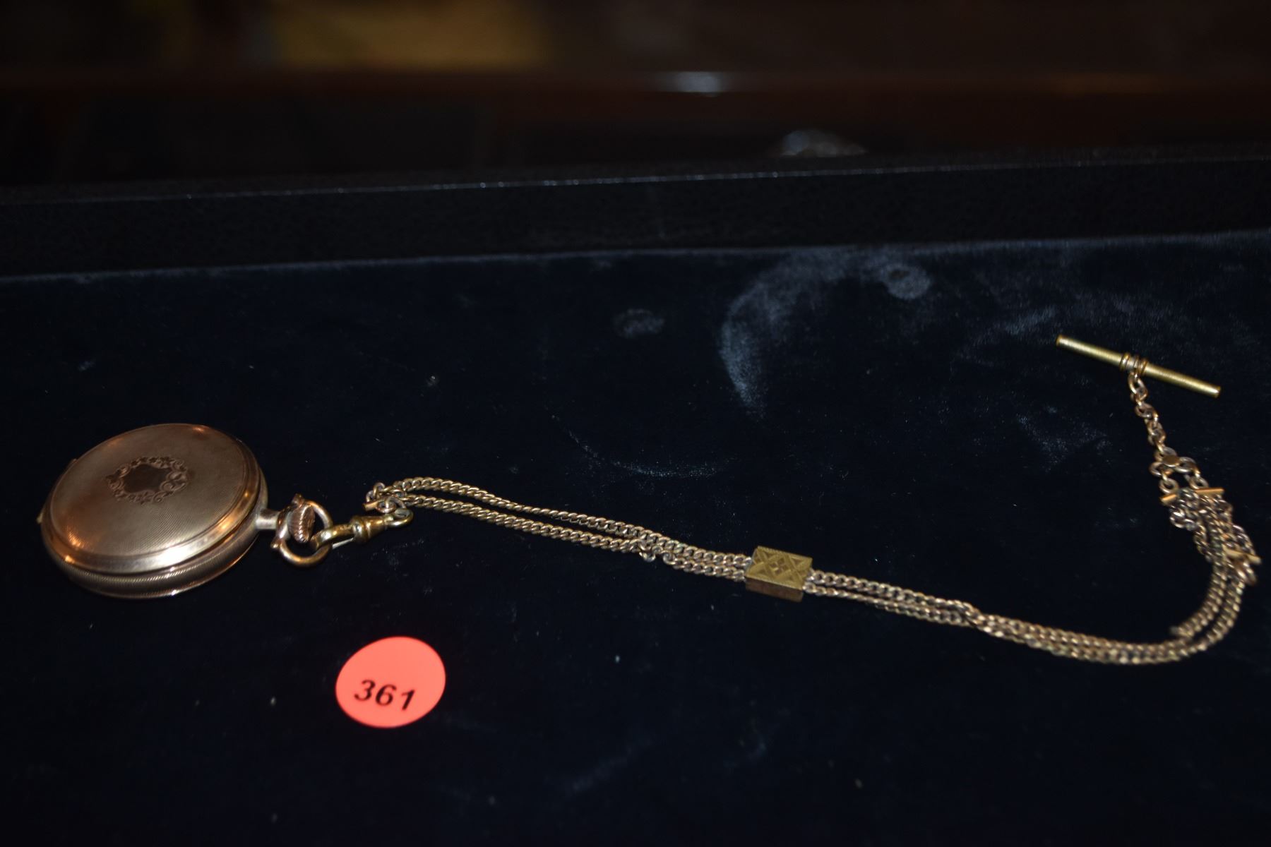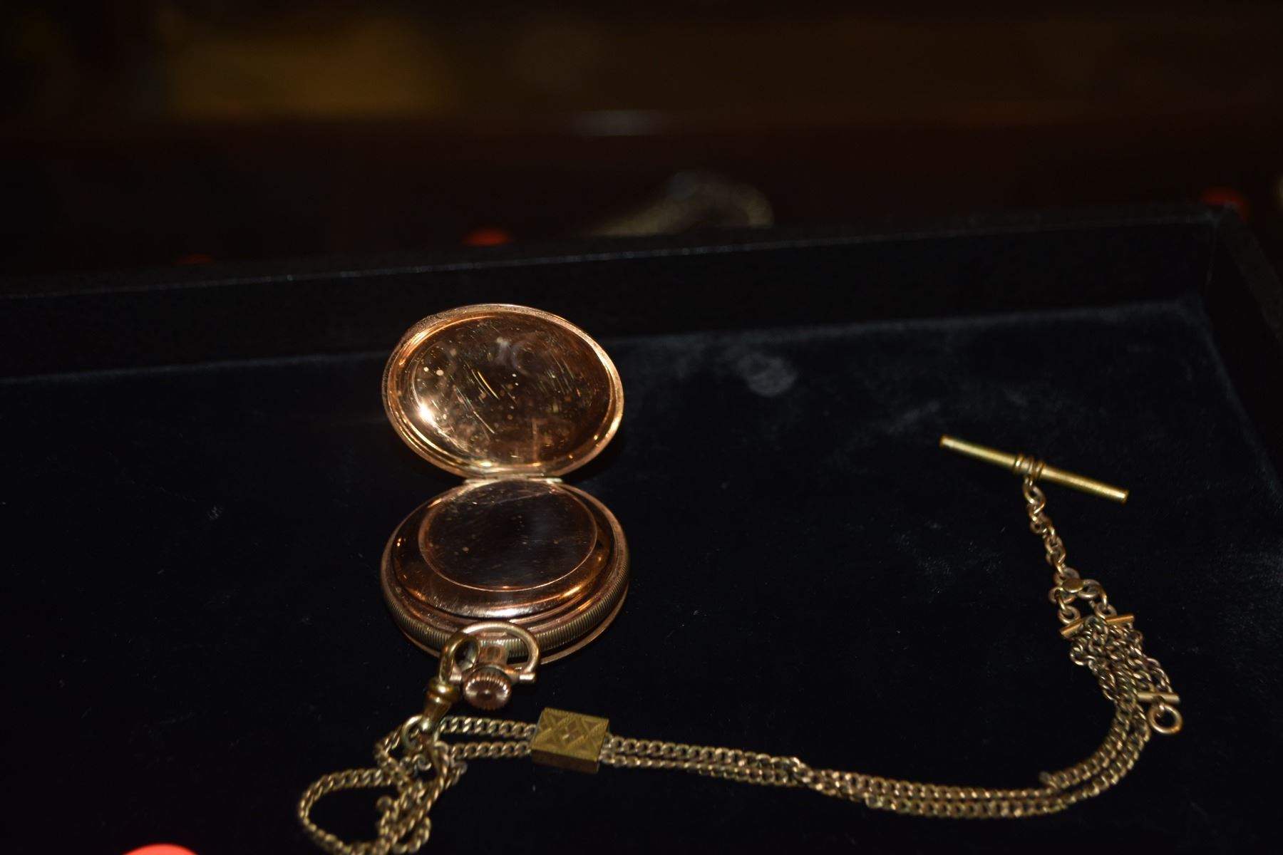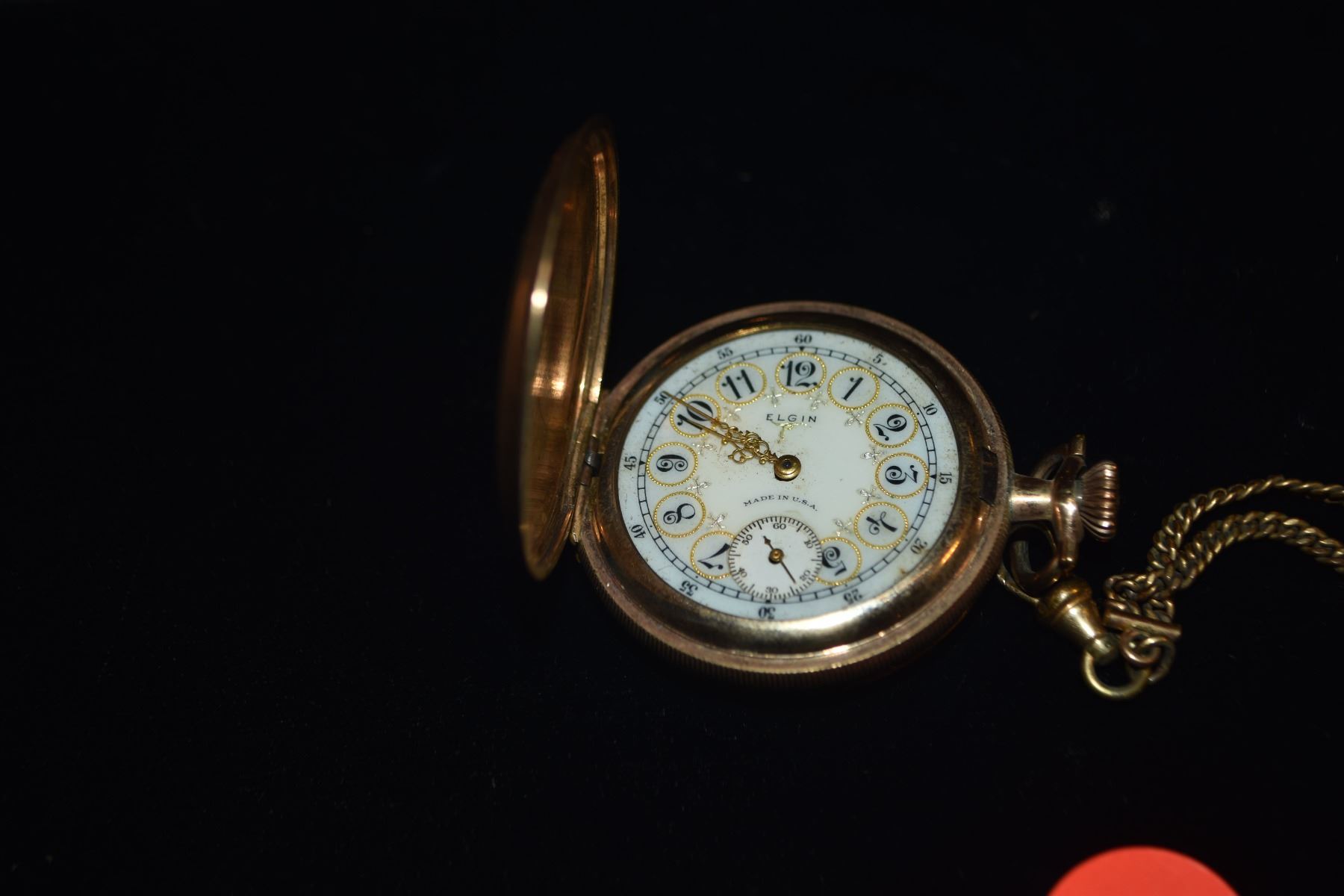 ELGIN GOLD TONE POCKET WATCH ON CHAIN (MISSING CRYSTAL), W/PORCELAIN FACE